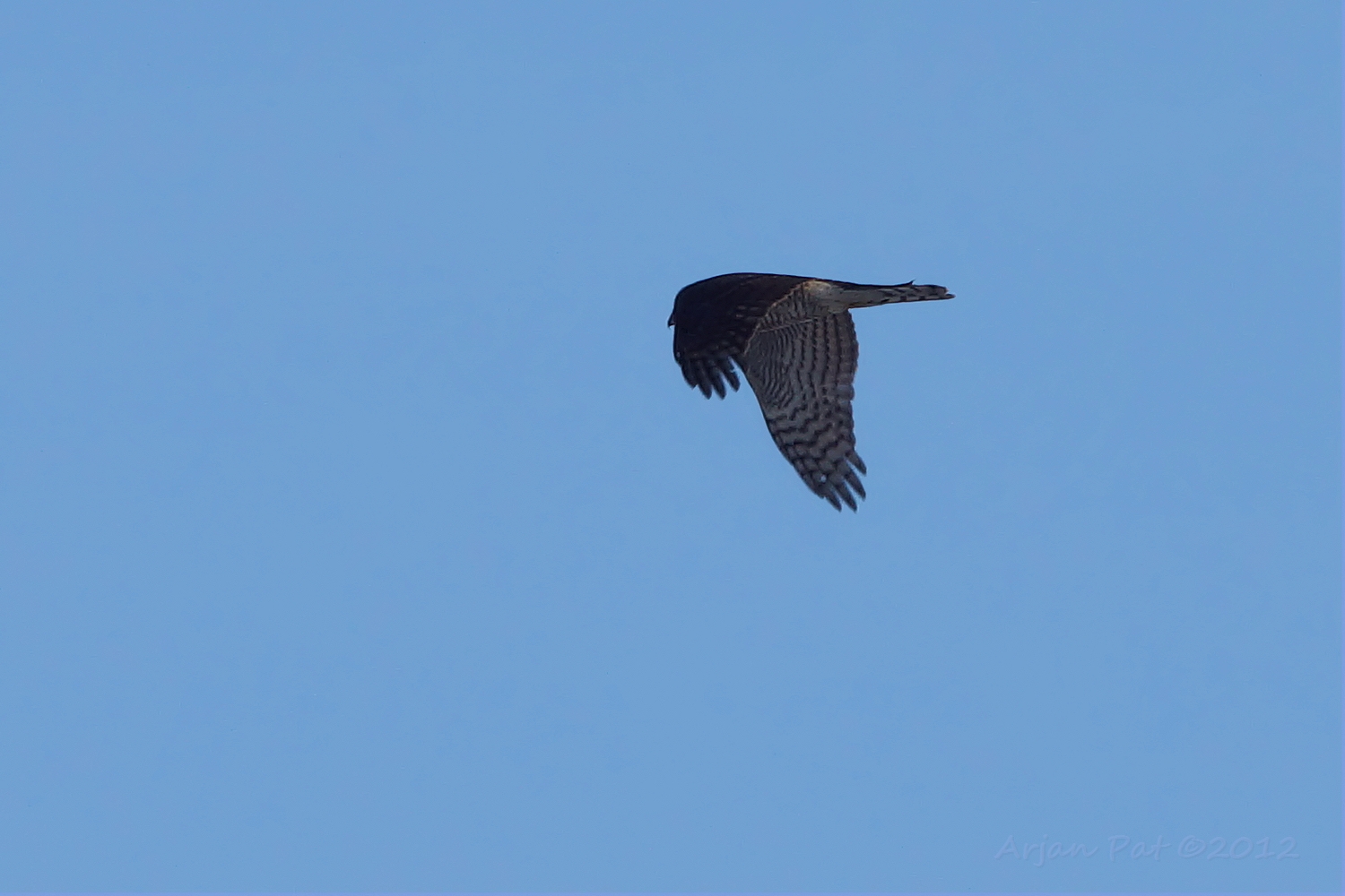 De sperwer kreeg even later ruzie met een buizerd. De sperwer moest het onderspit delven en vluchtte in de dichte begroeiing van een stelletje bomen.