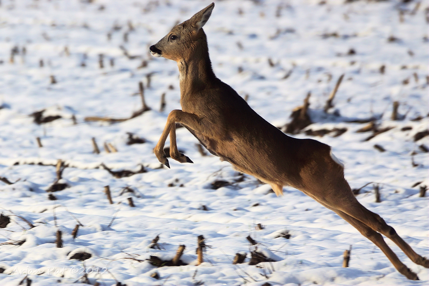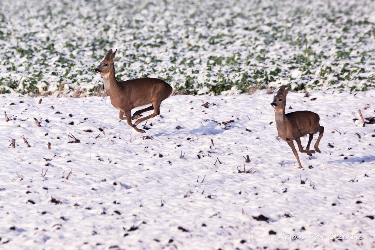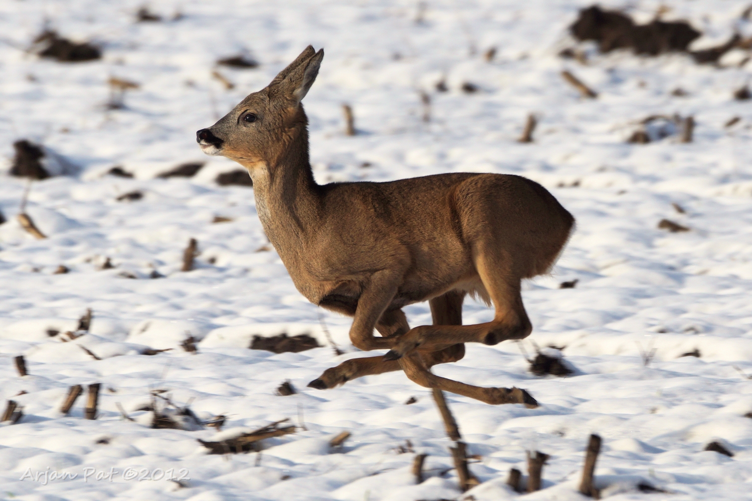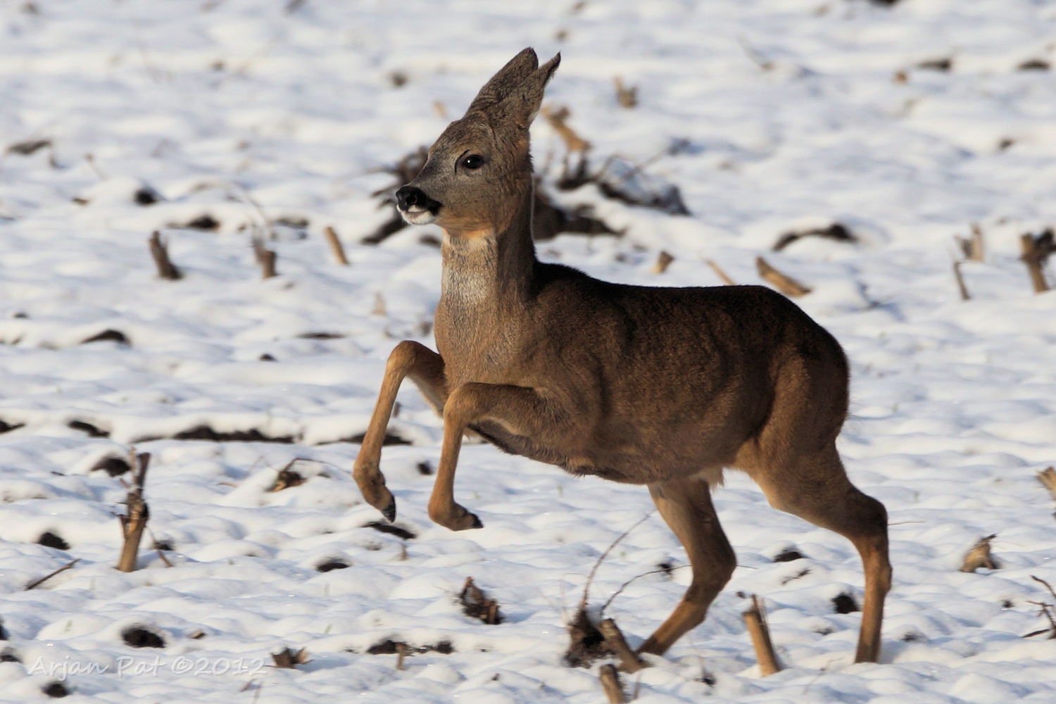 Er waren veel jagers aan het jagen op de akkers en op de heide. Ook al werd er niet op de reeën gejaagd (dat mag namelijk niet met deze sneeuw), toch renden geregeld reeën het bos uit, opgeschrokken door de geweerschoten of door de aanwezigheid van de jagers. Maar ook (andere) wandelaars zorgden ervoor, dat de reeën onrustig heen en weer renden.