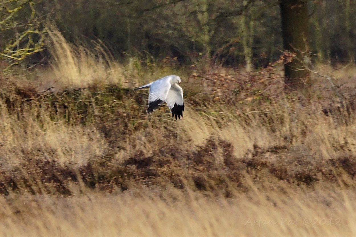 Er vlogen minstens 2 kiekendieven. Ik zag in ieder geval 2 witte (mannetjes) kiekendieven tegelijkertijd op hetzelfde heideveldje. Deze heeft een iets wittere kop dan de vogel op de vorige foto.