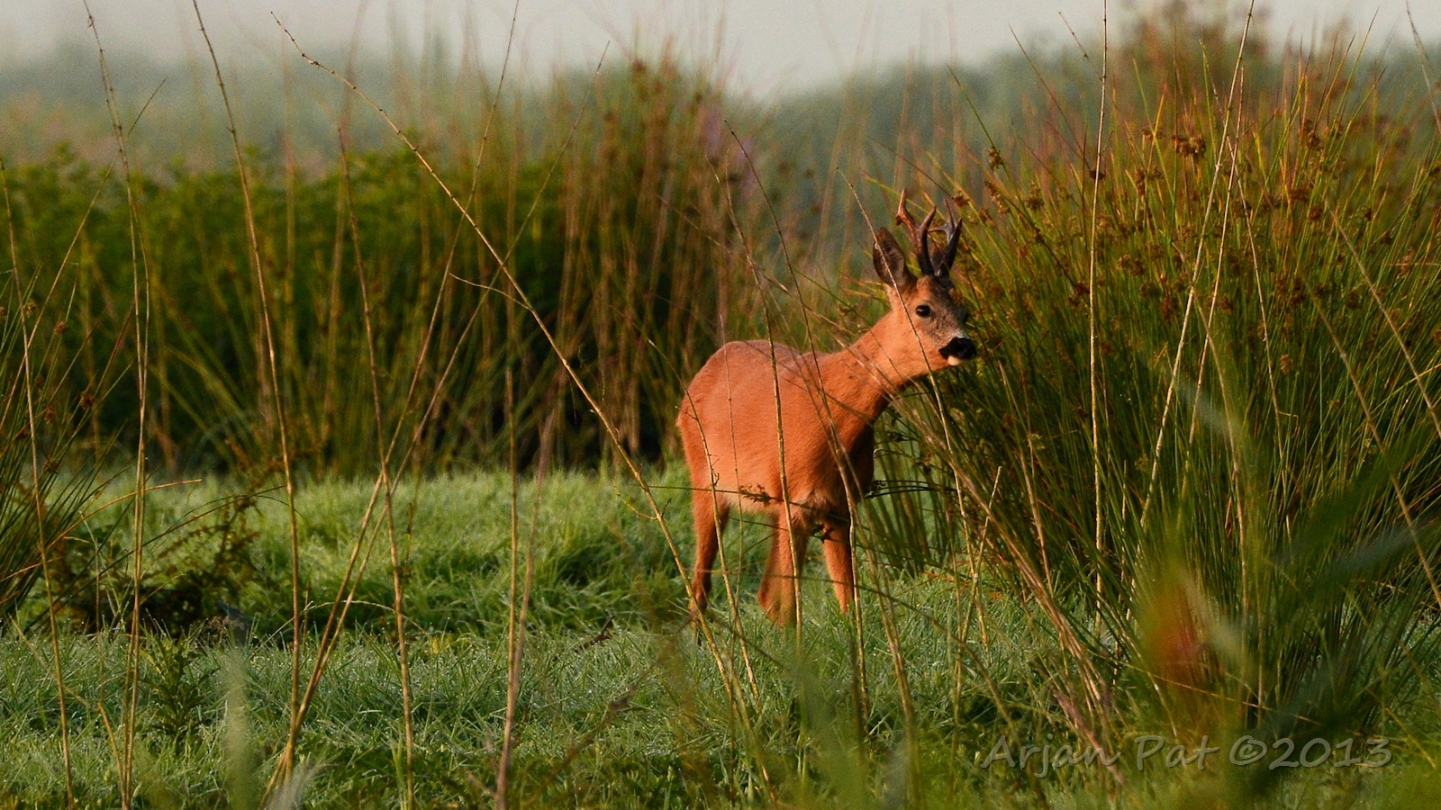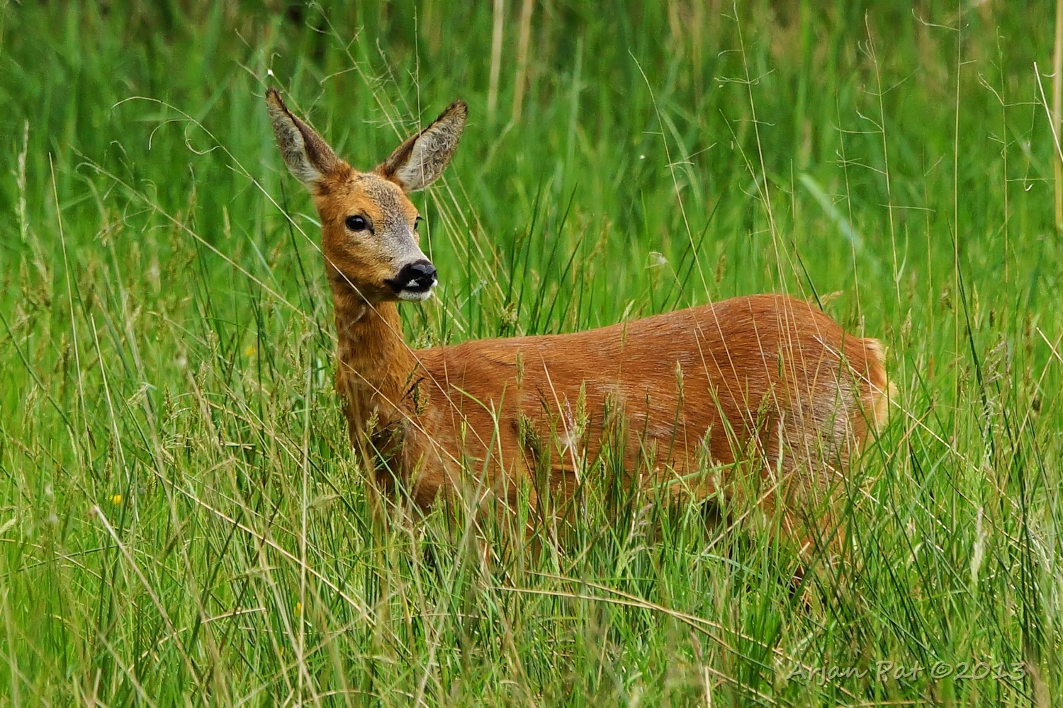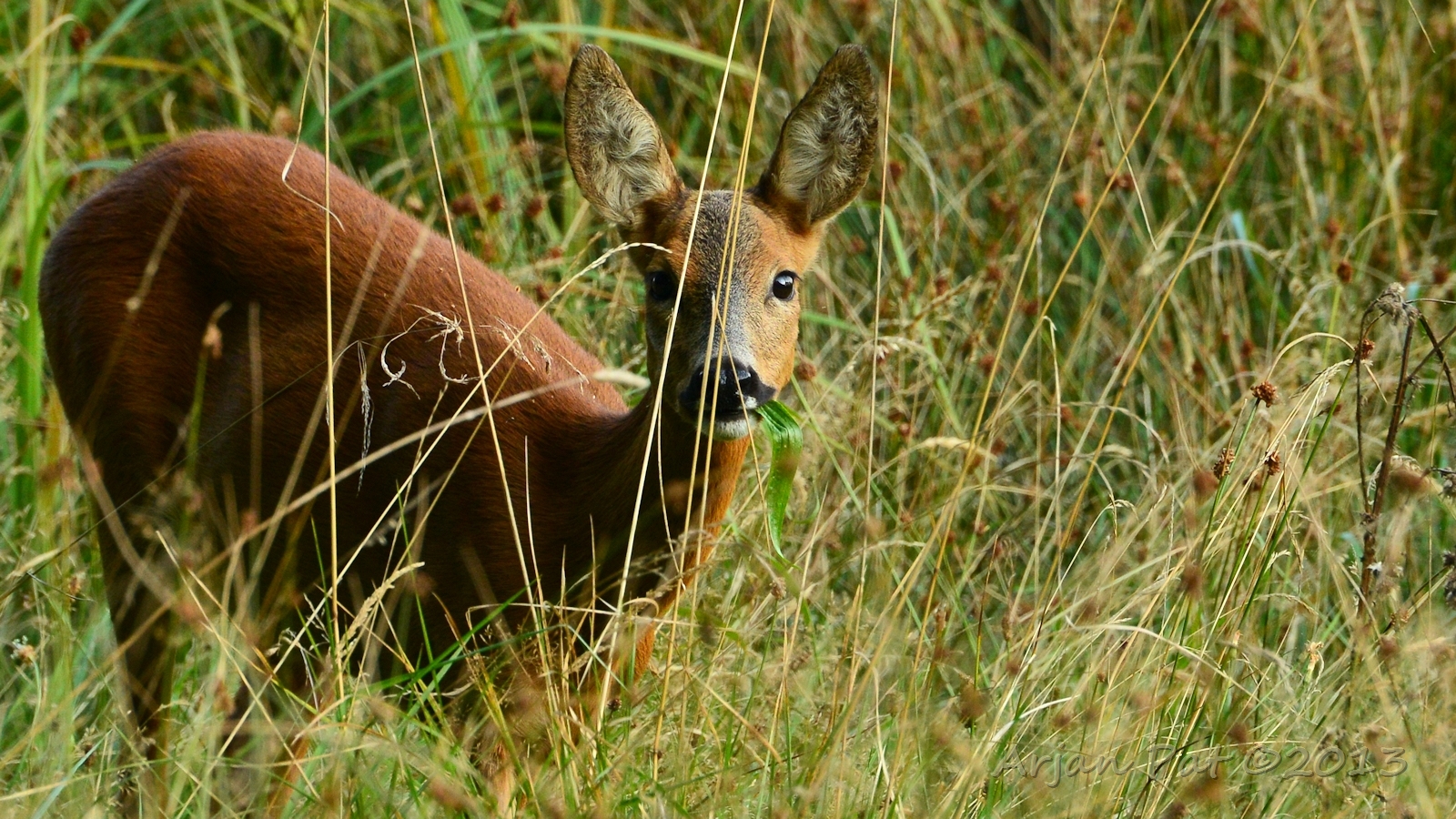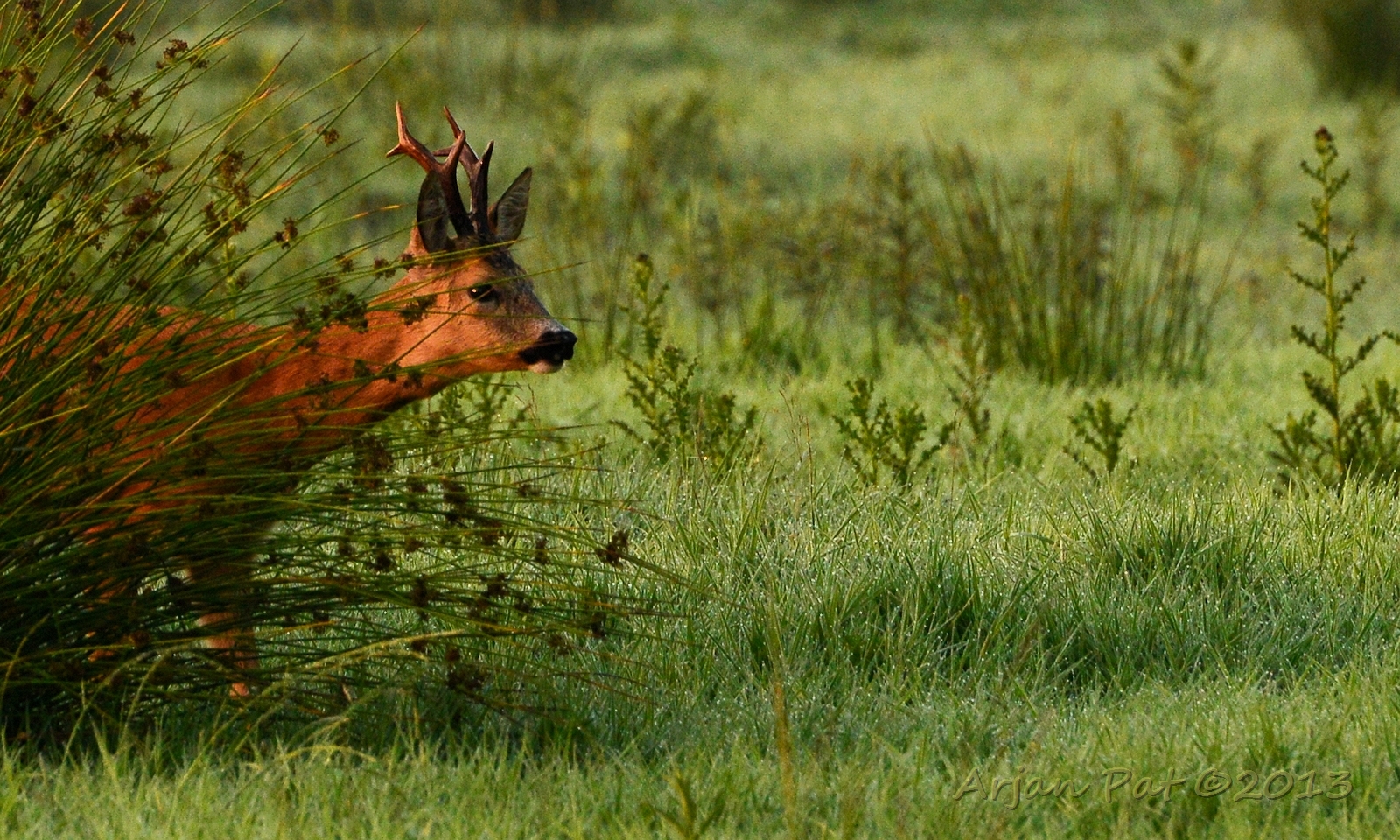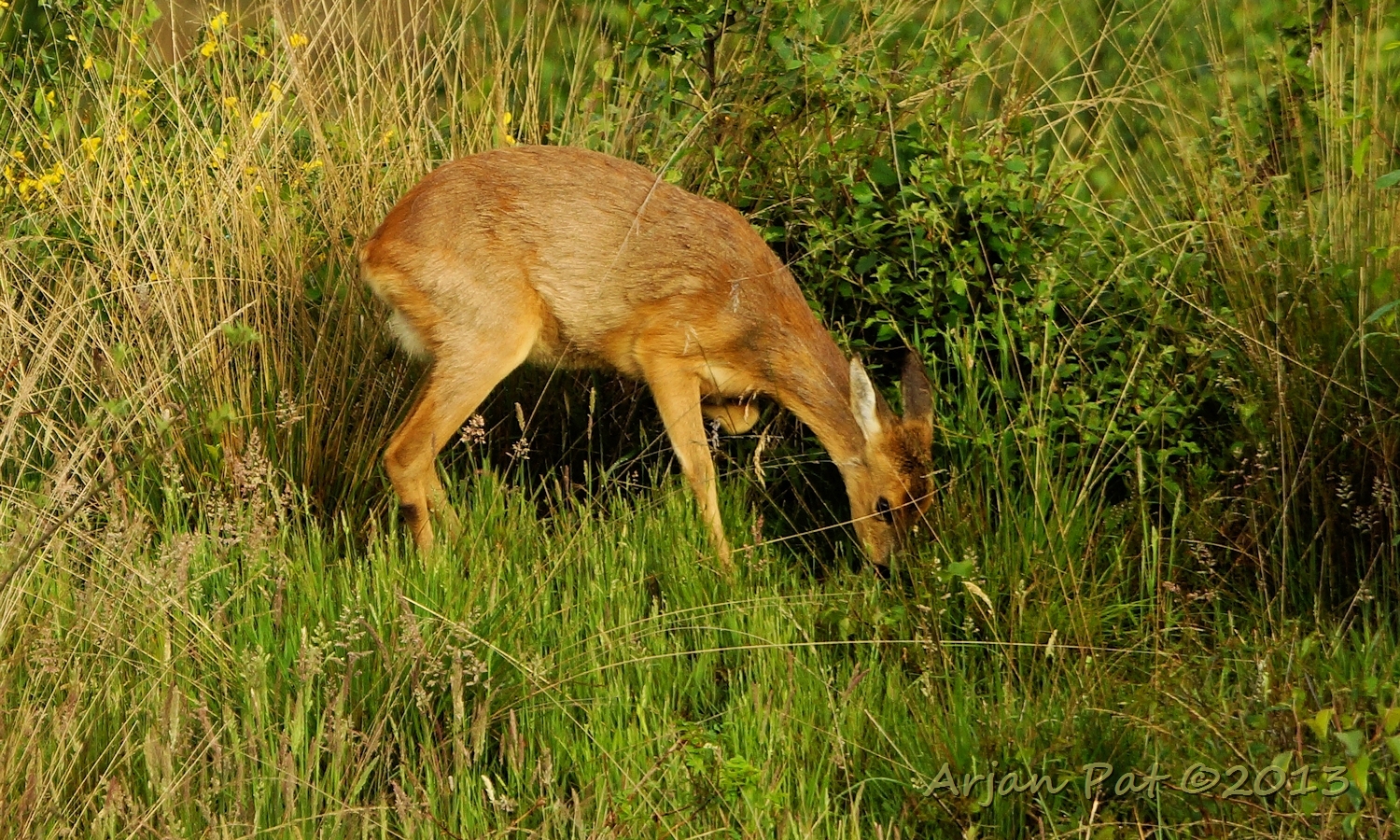Net over het hoge grasgewas was een grazende reebok te zien....