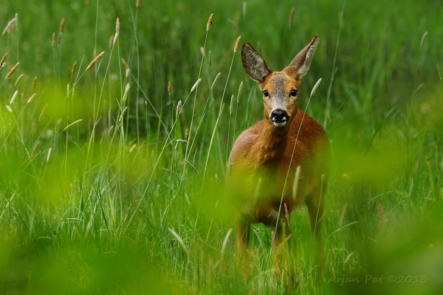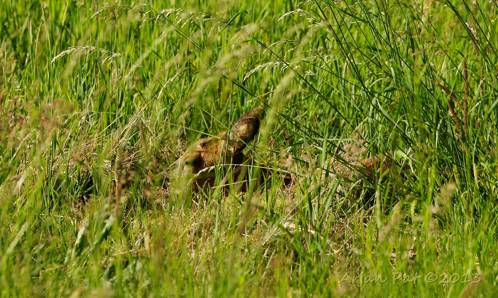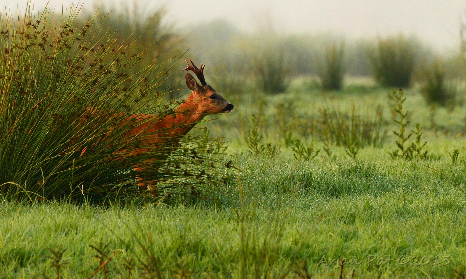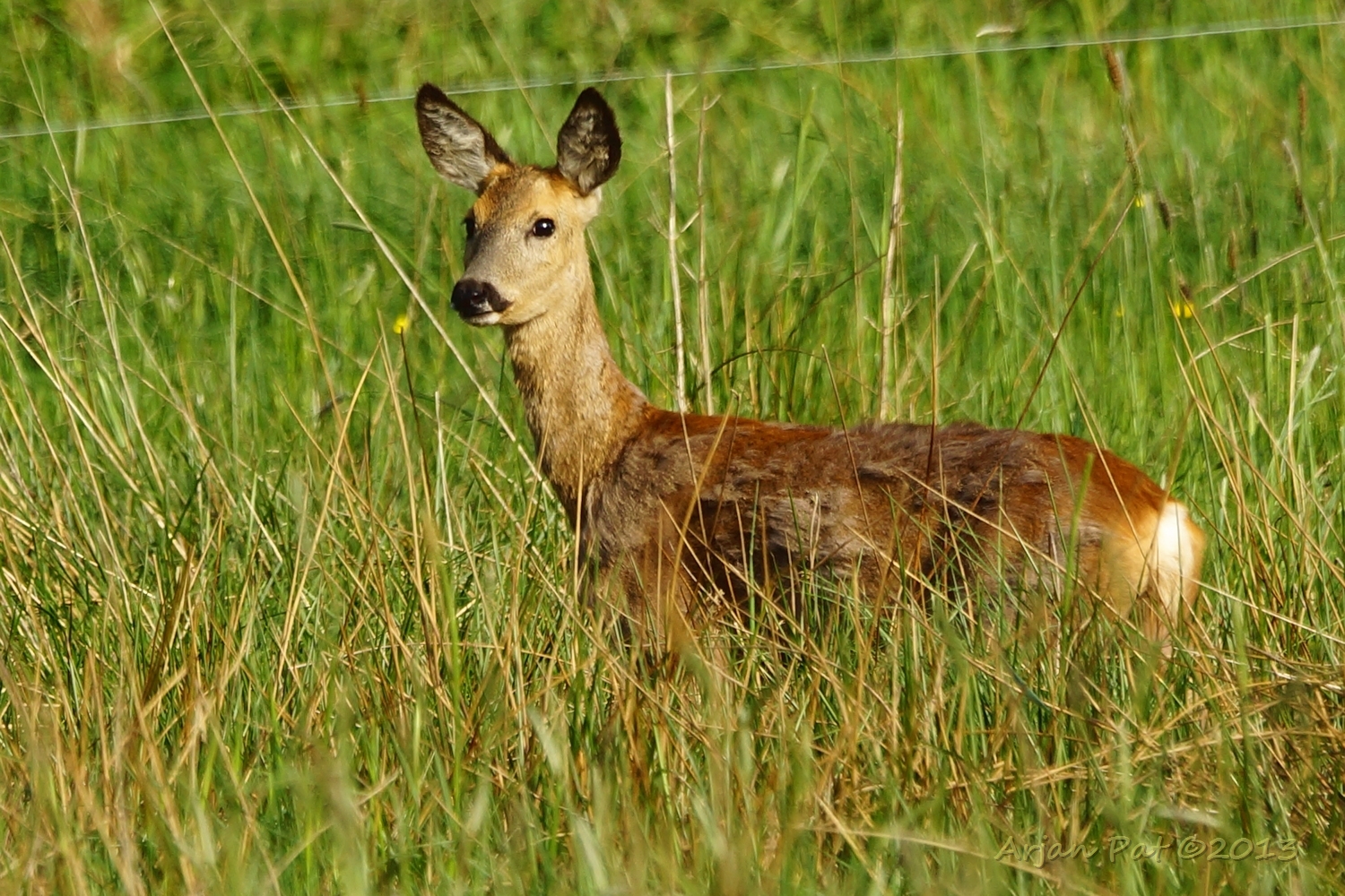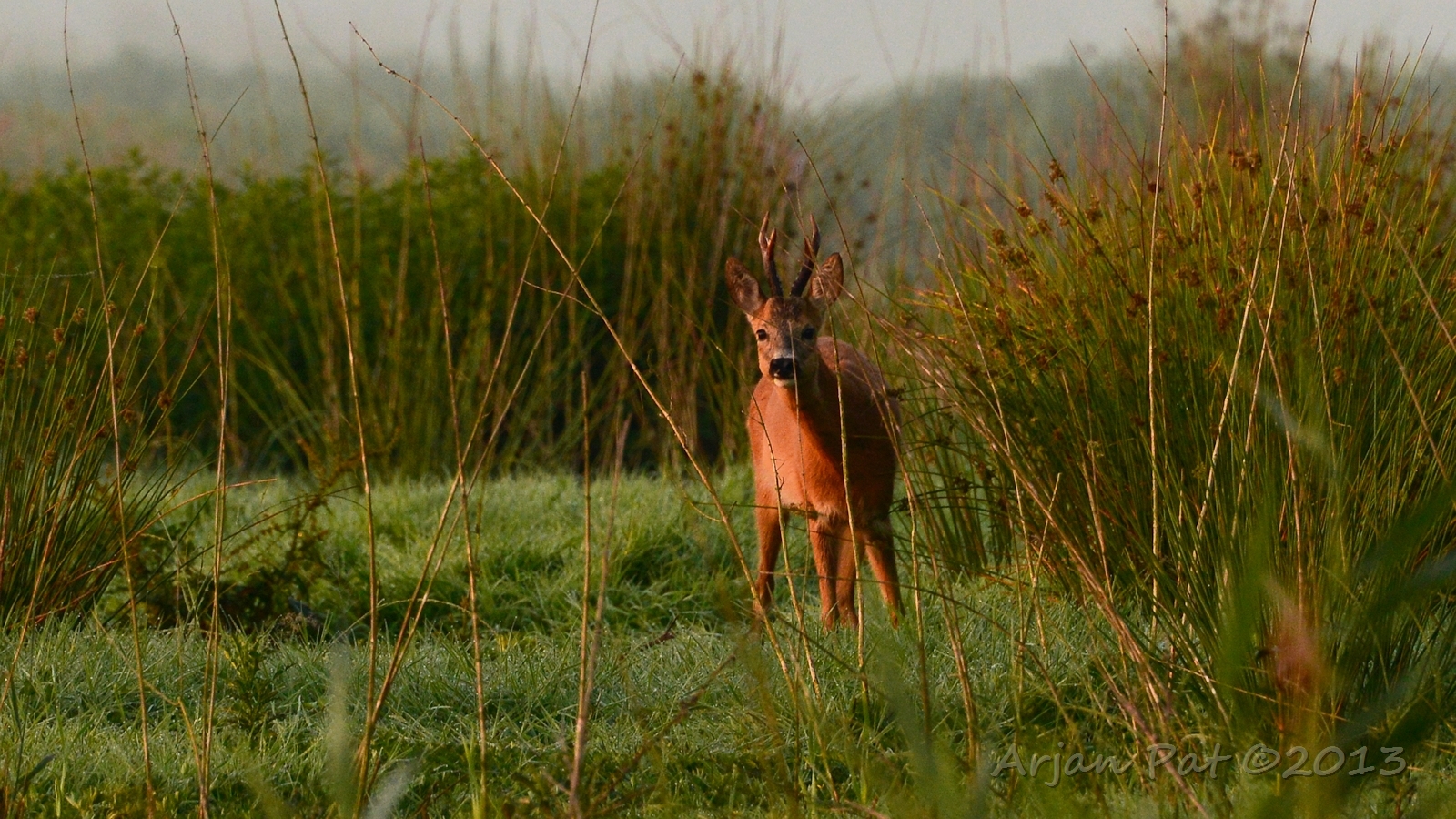 Net over het hoge grasgewas was een grazende reebok te zien....
