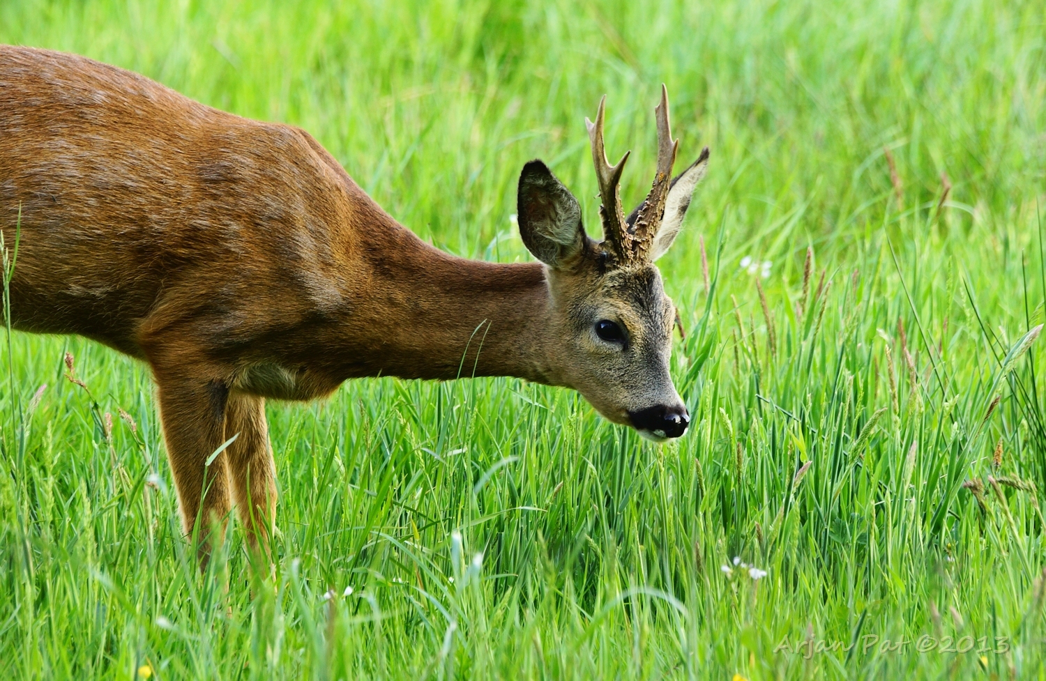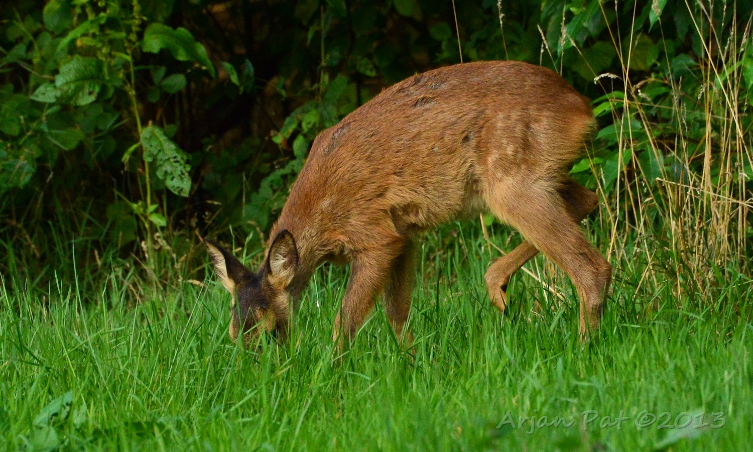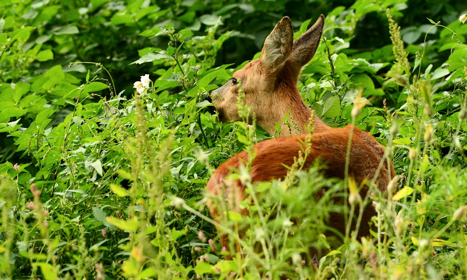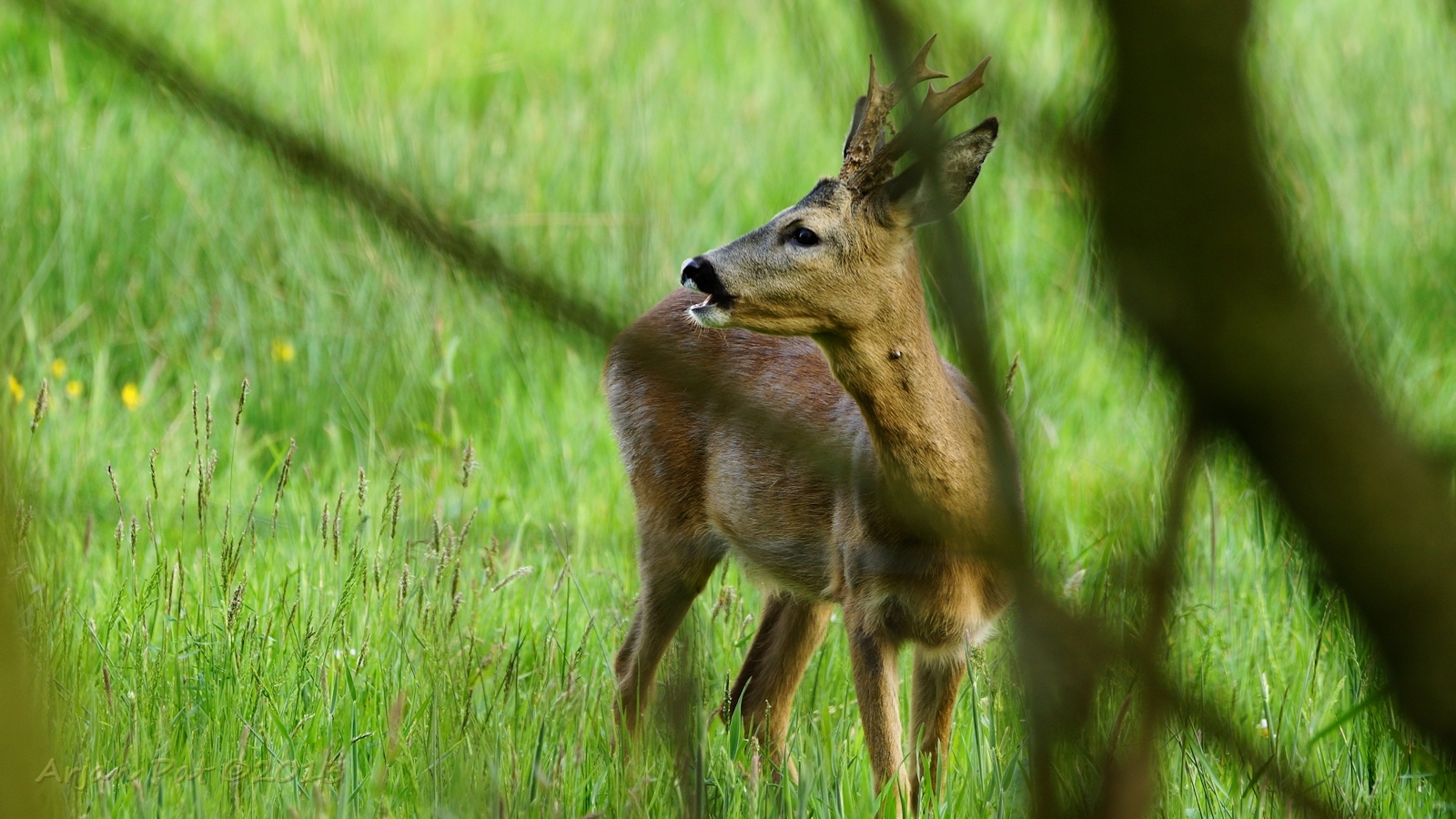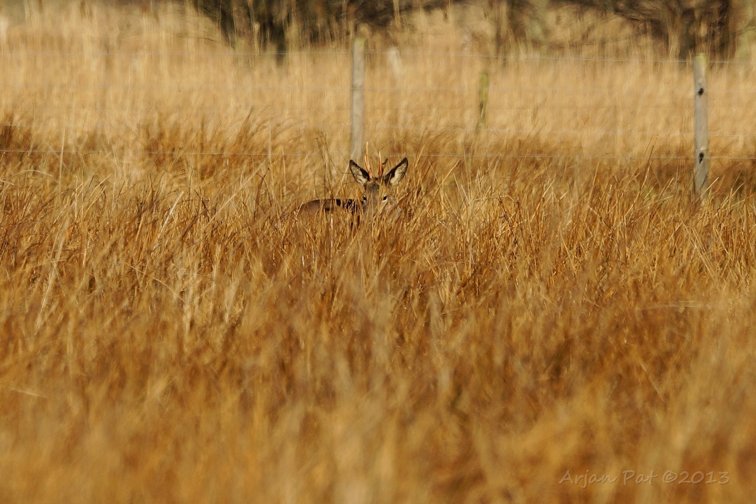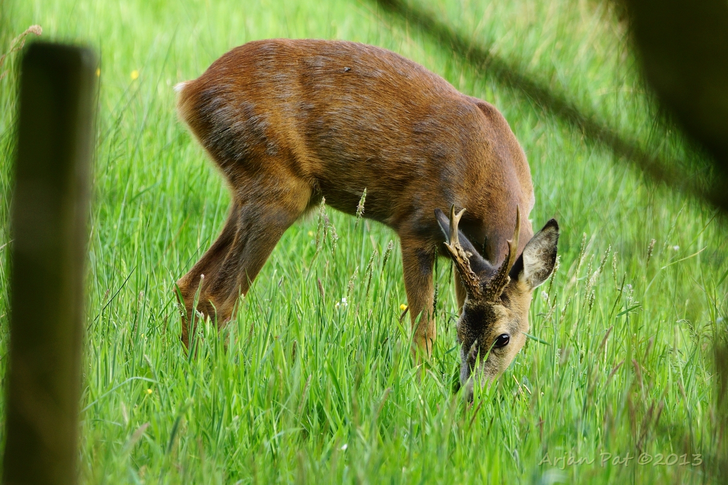 Net over het hoge grasgewas was een grazende reebok te zien....