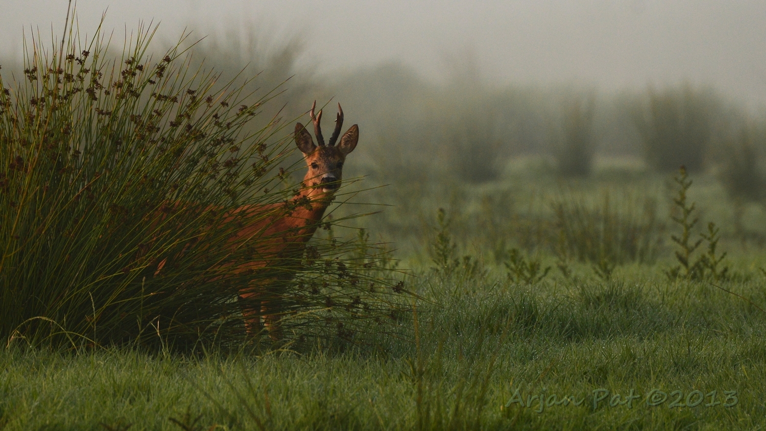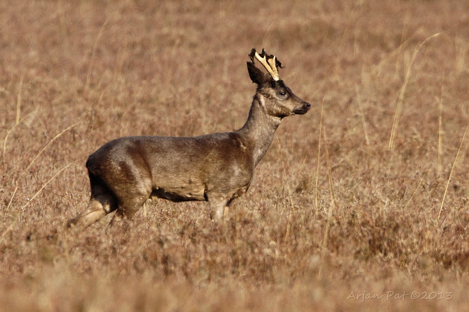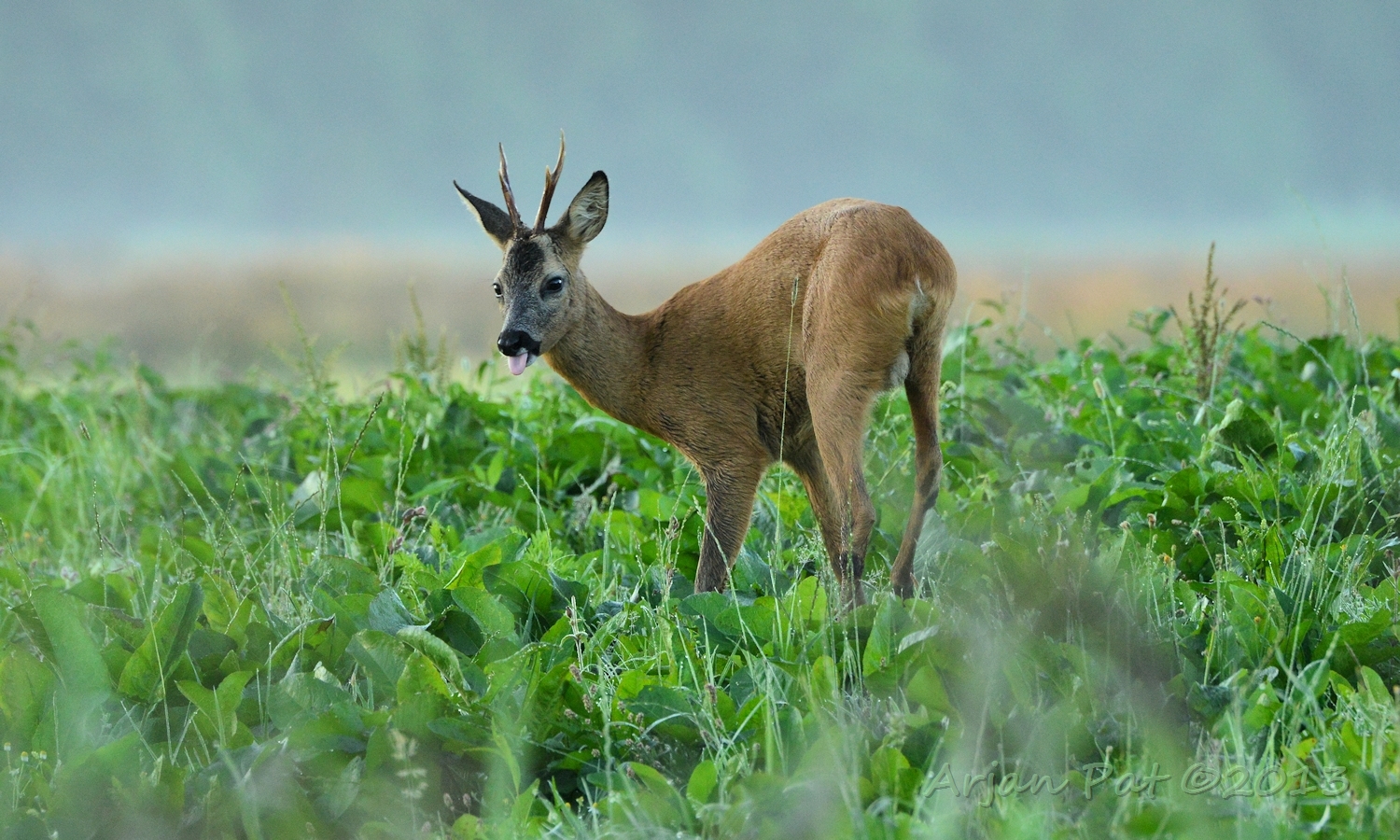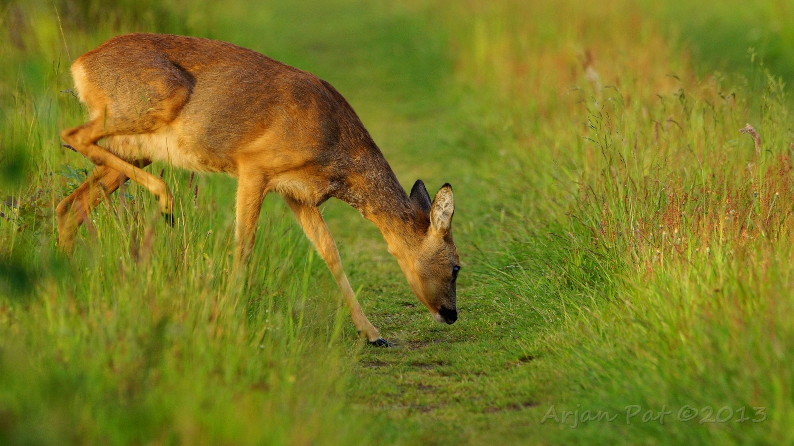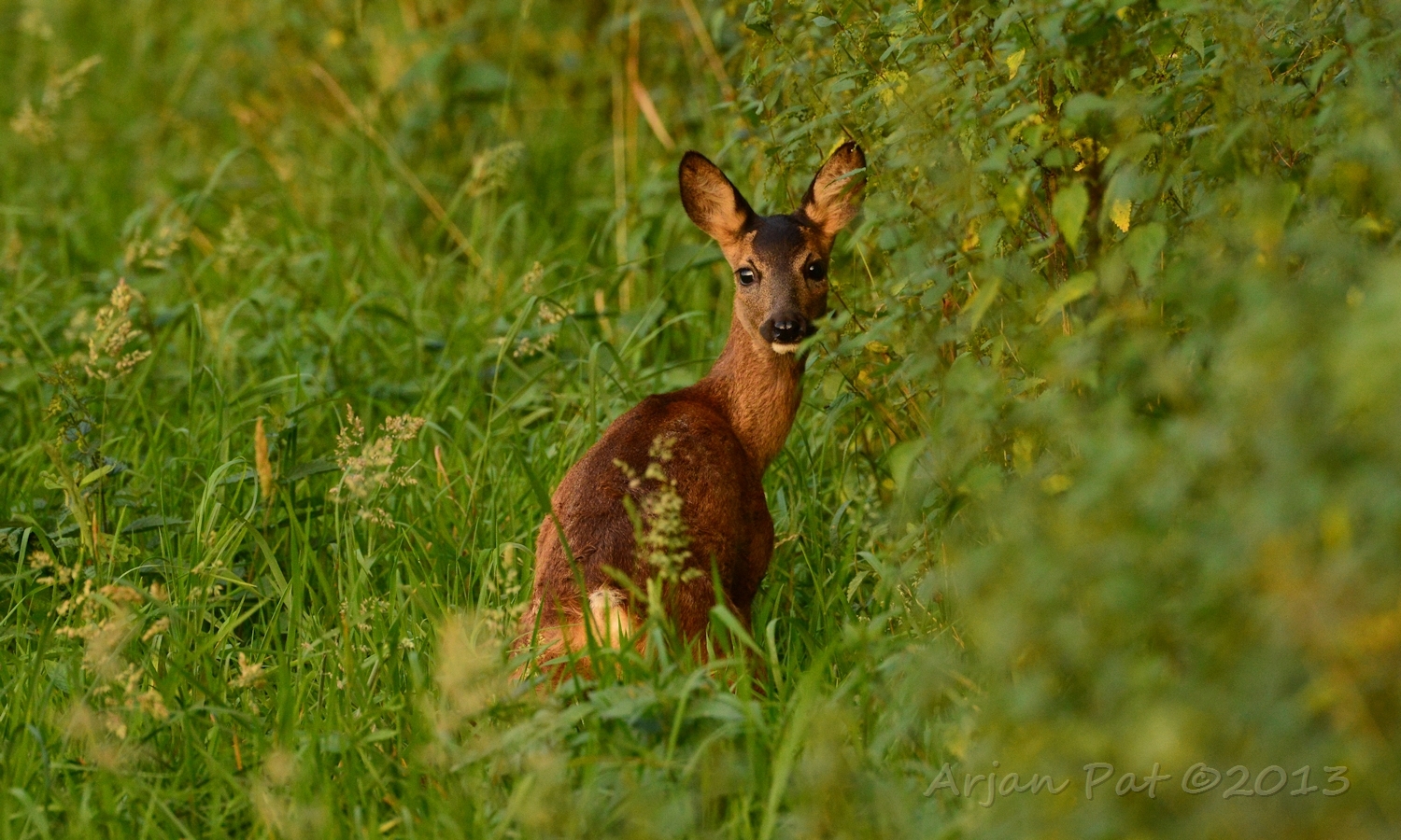 Net over het hoge grasgewas was een grazende reebok te zien....