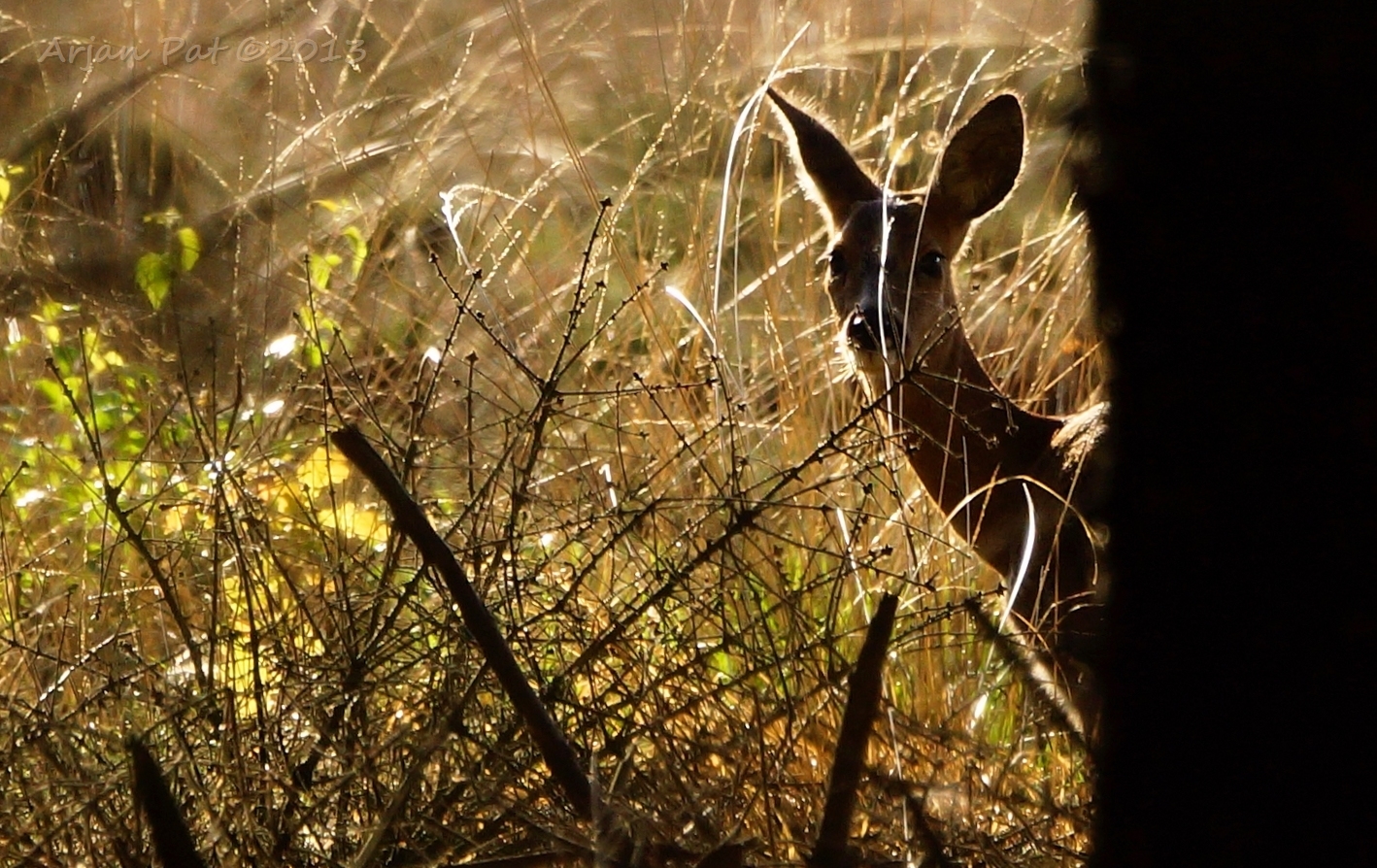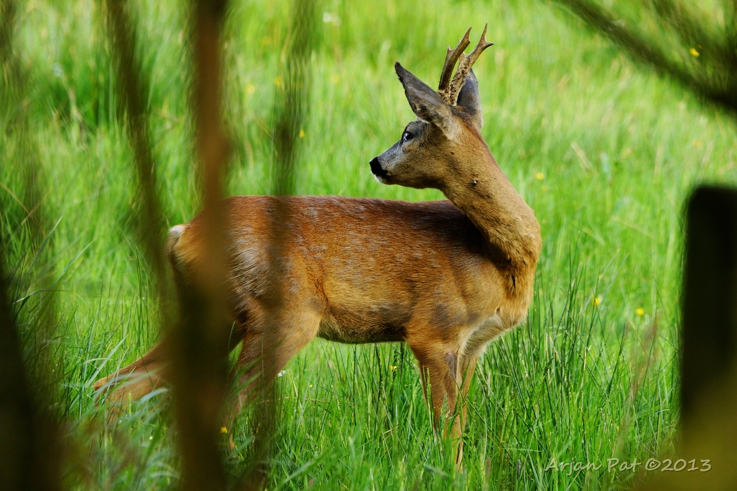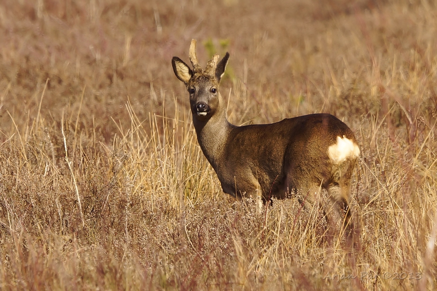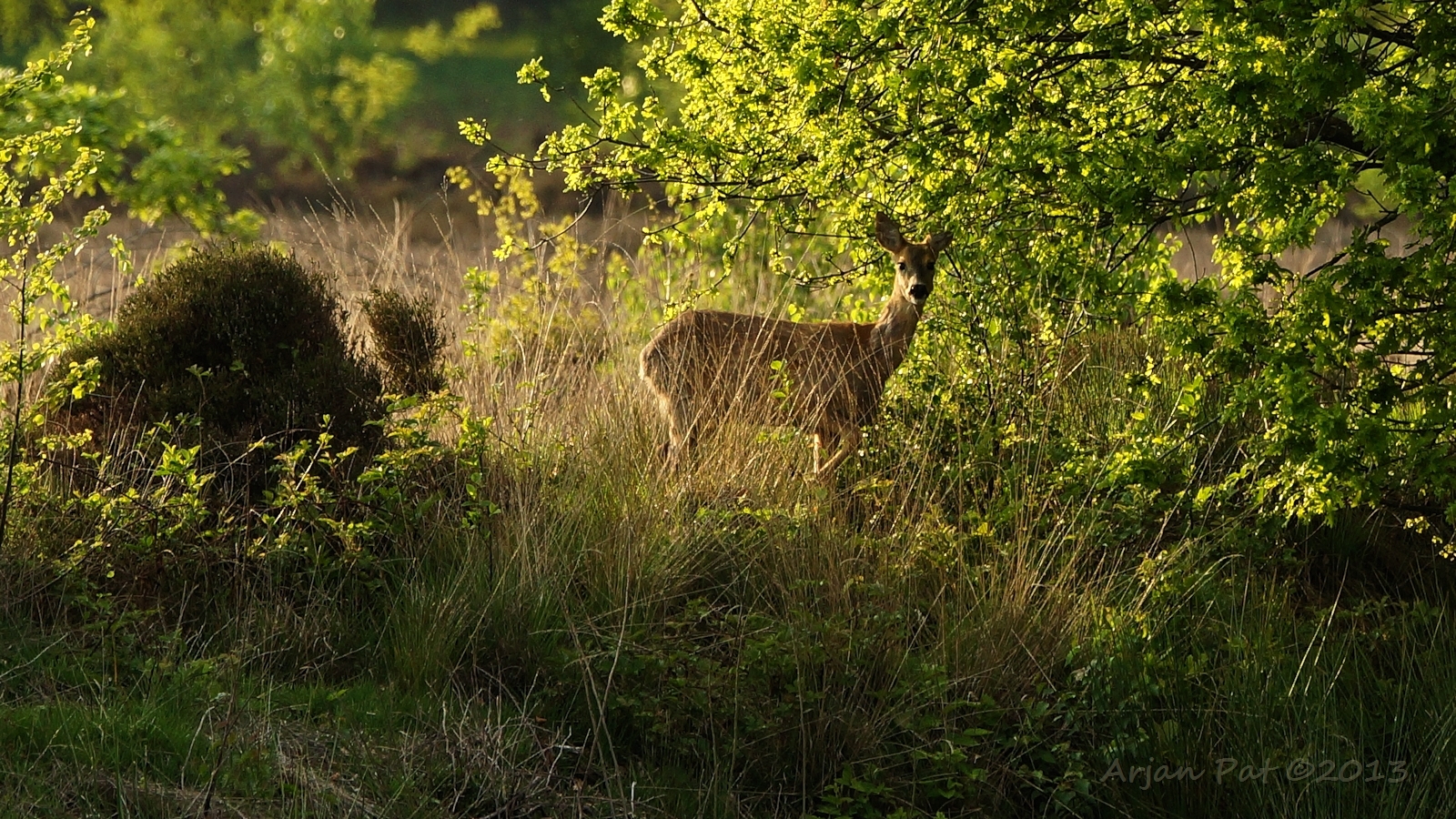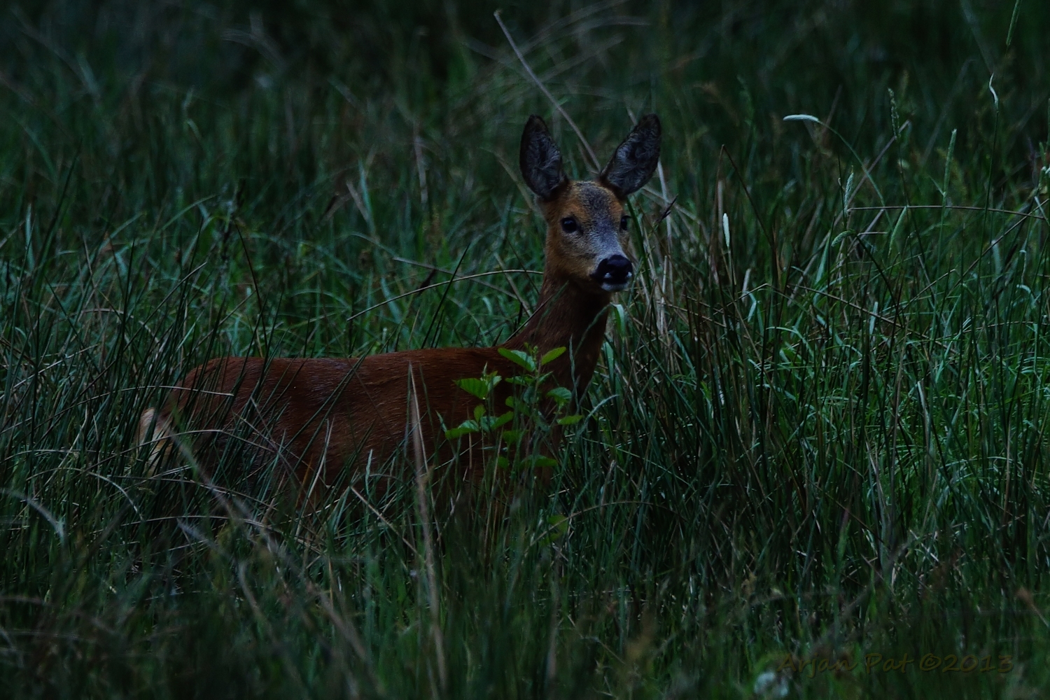 Net over het hoge grasgewas was een grazende reebok te zien....