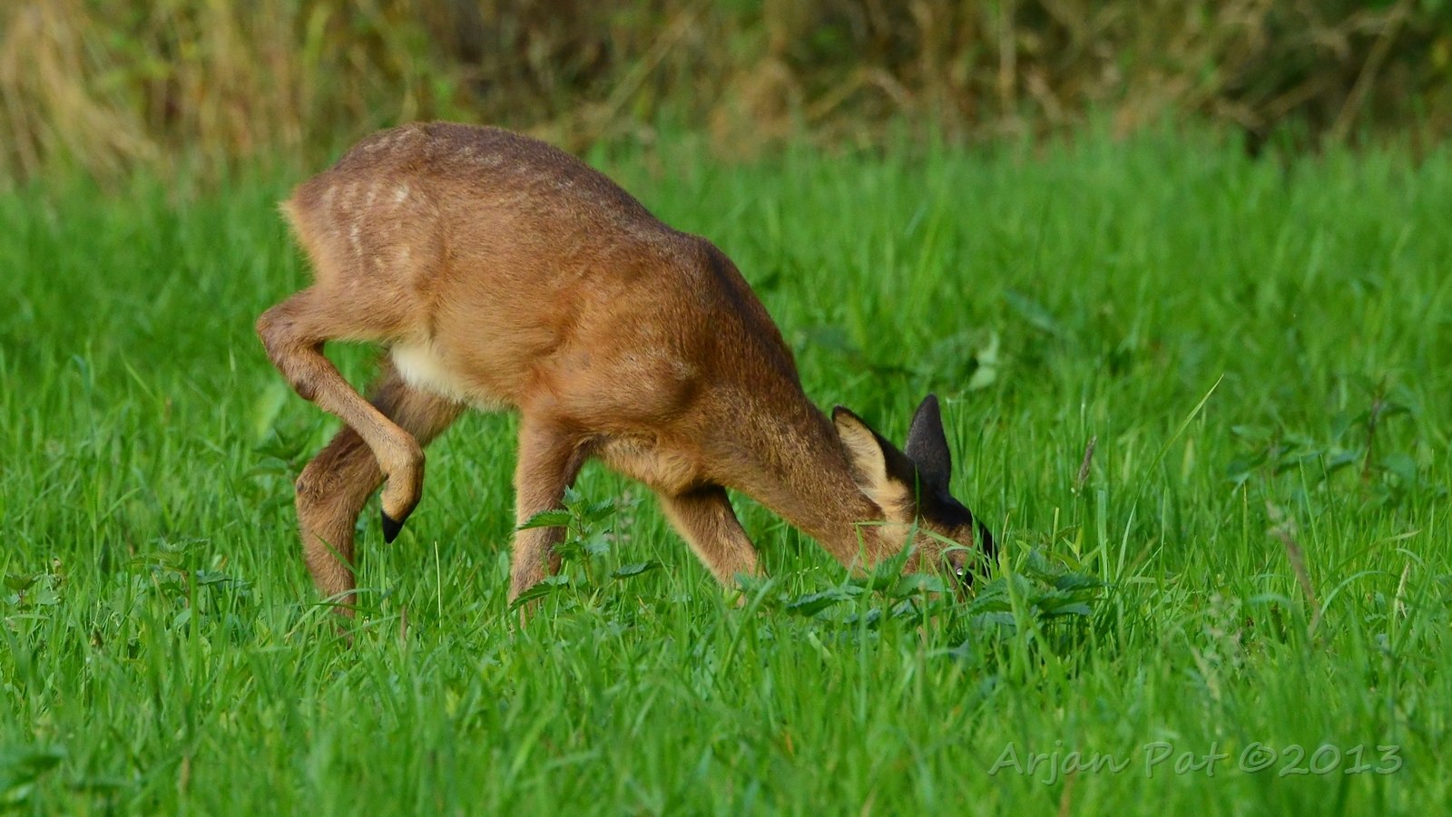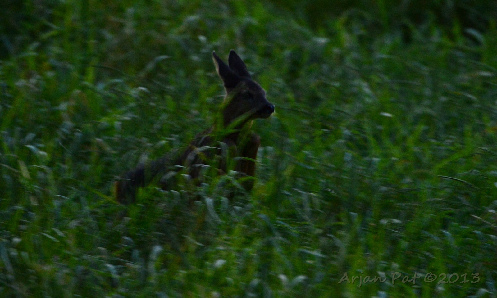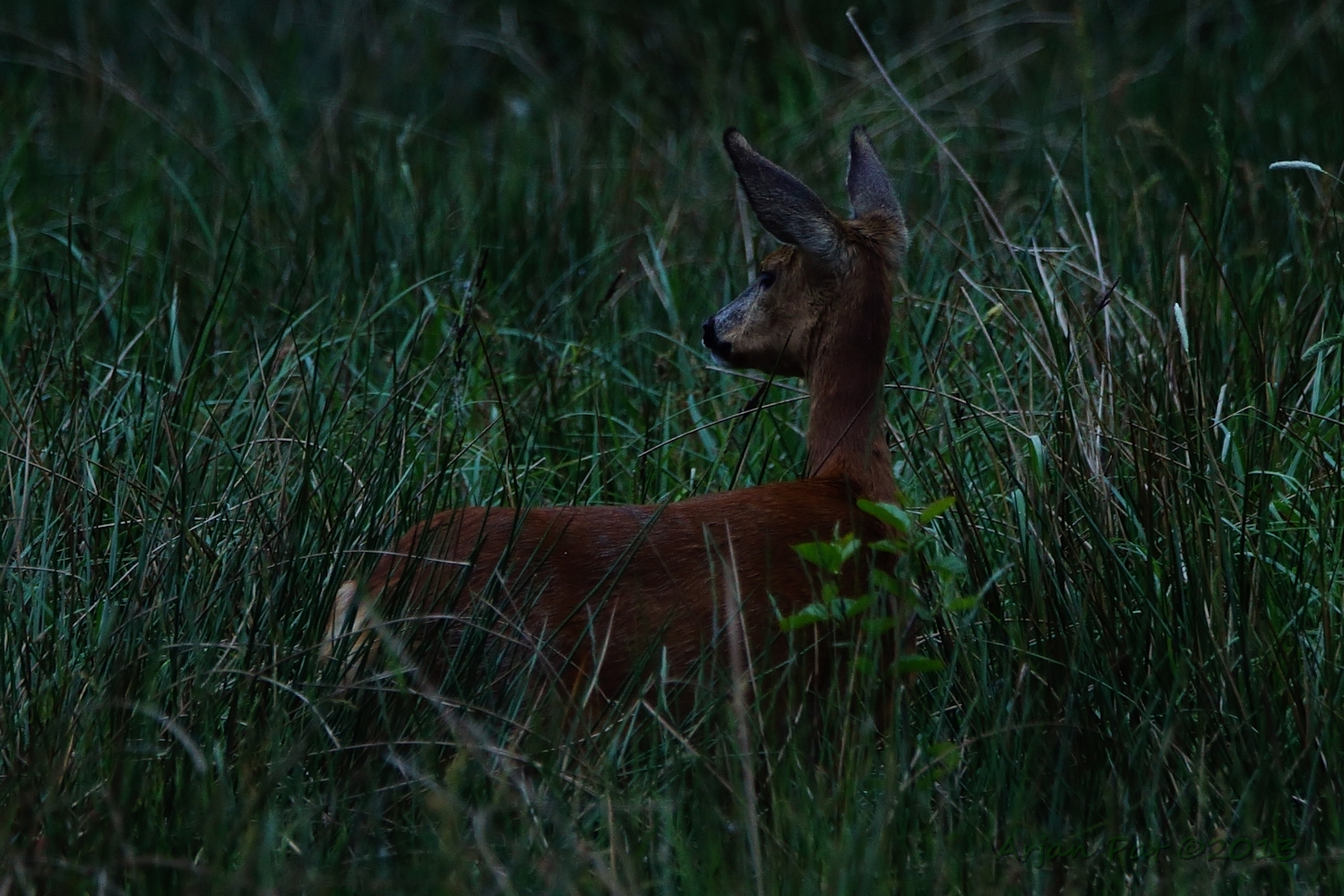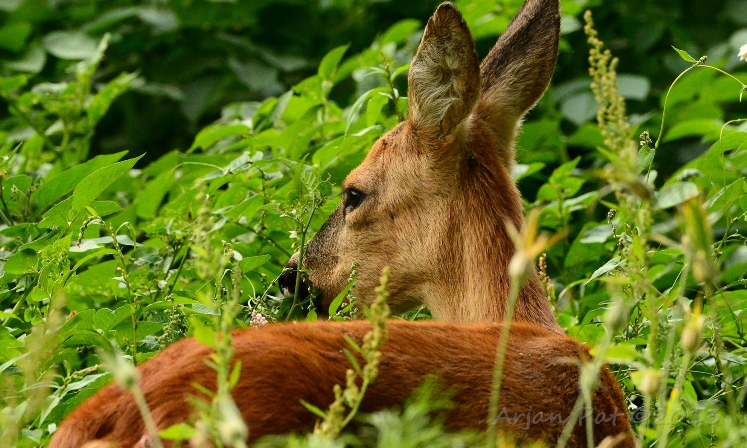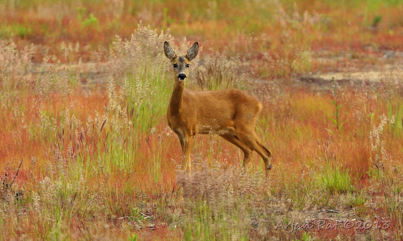 Net over het hoge grasgewas was een grazende reebok te zien....