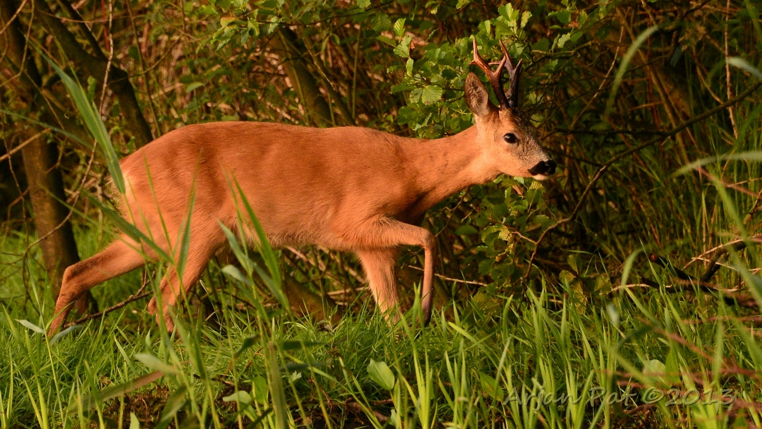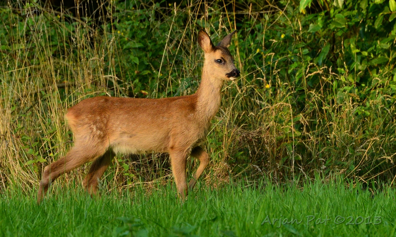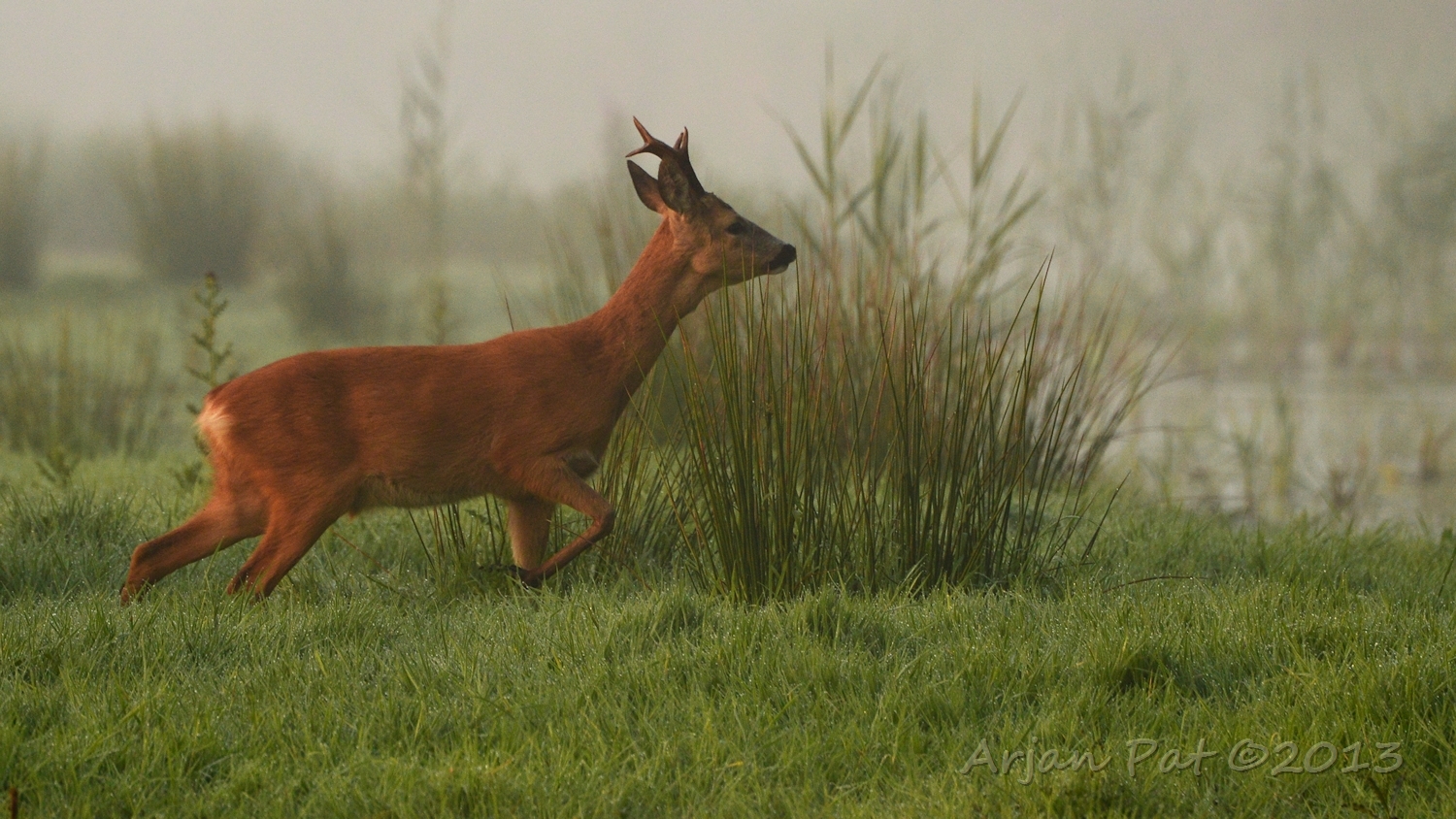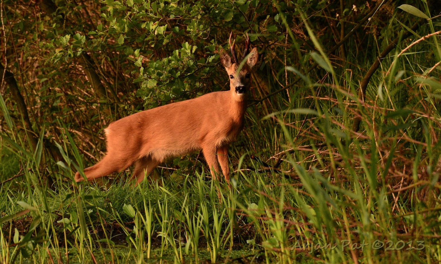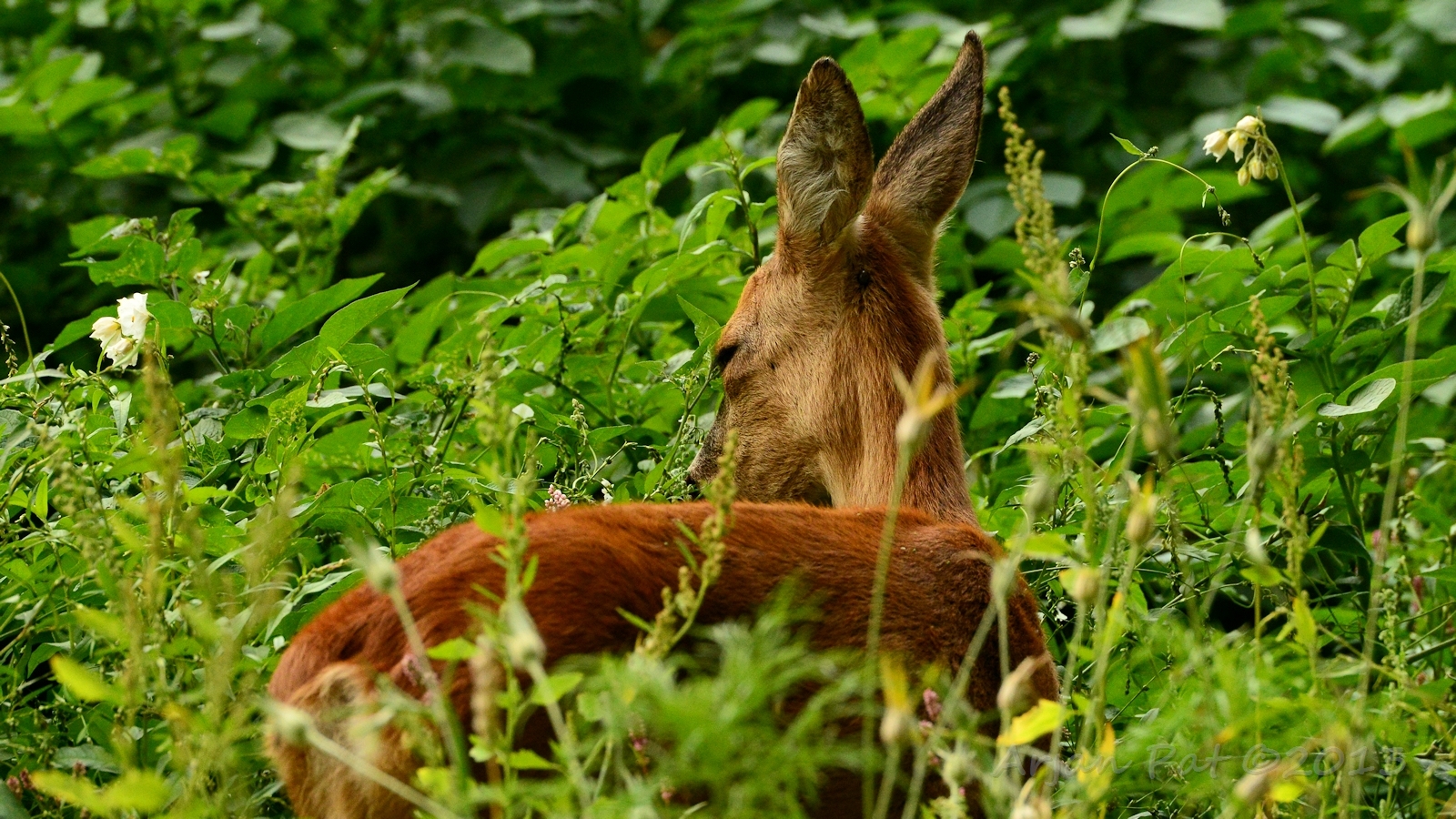 Net over het hoge grasgewas was een grazende reebok te zien....