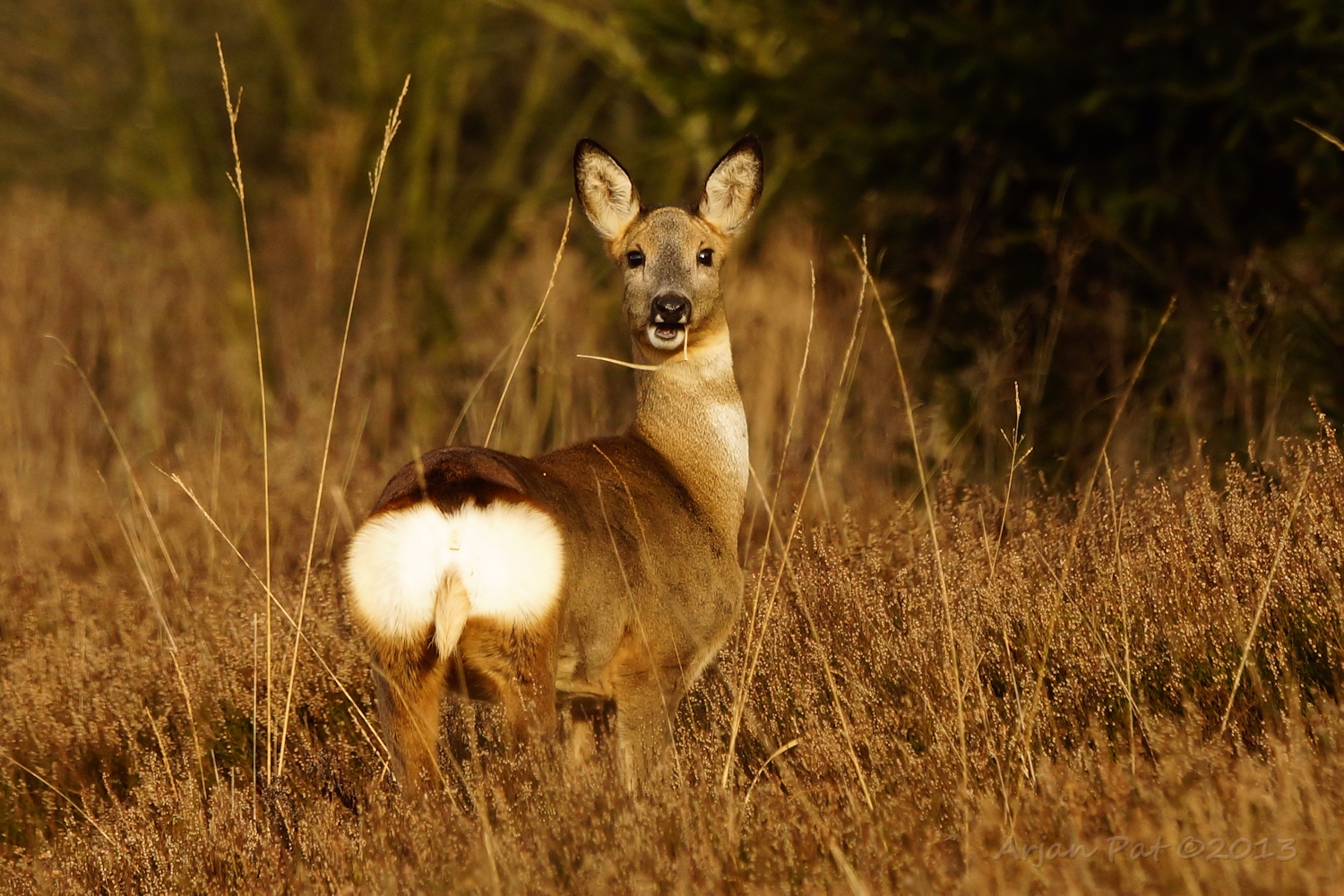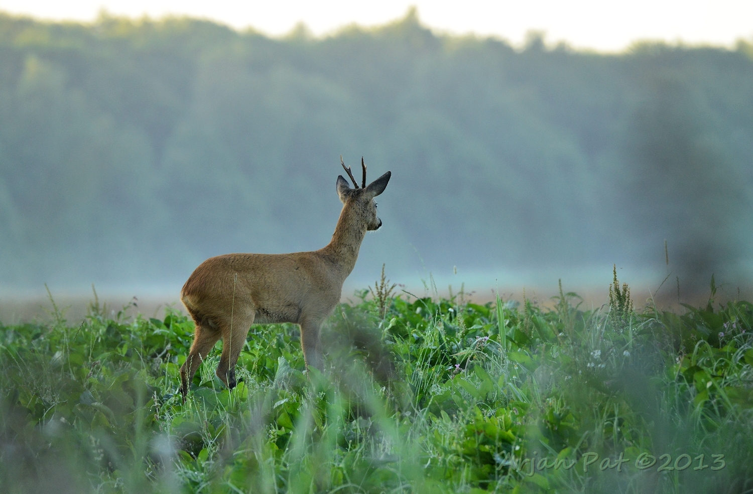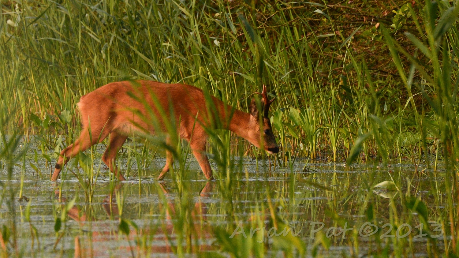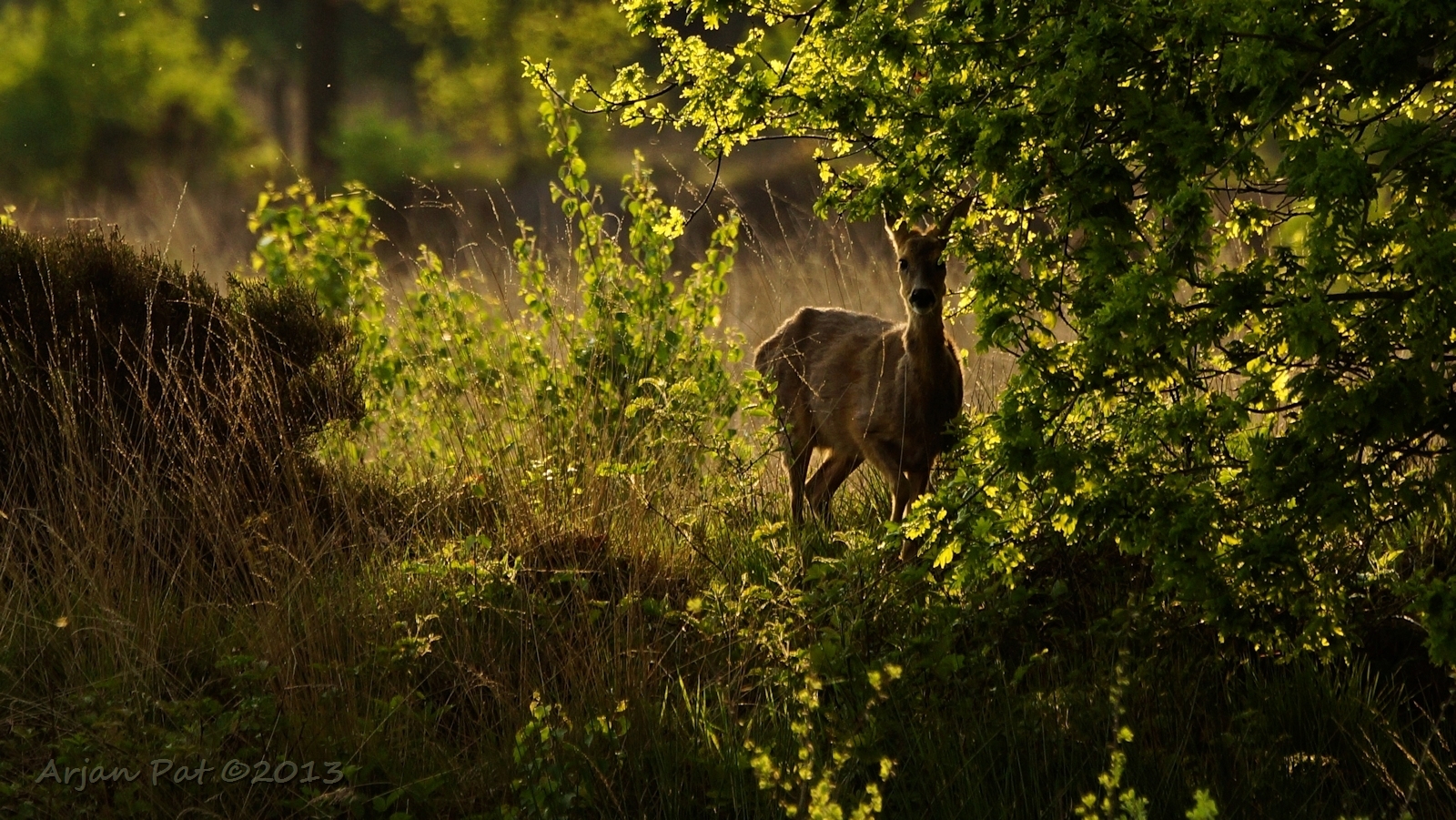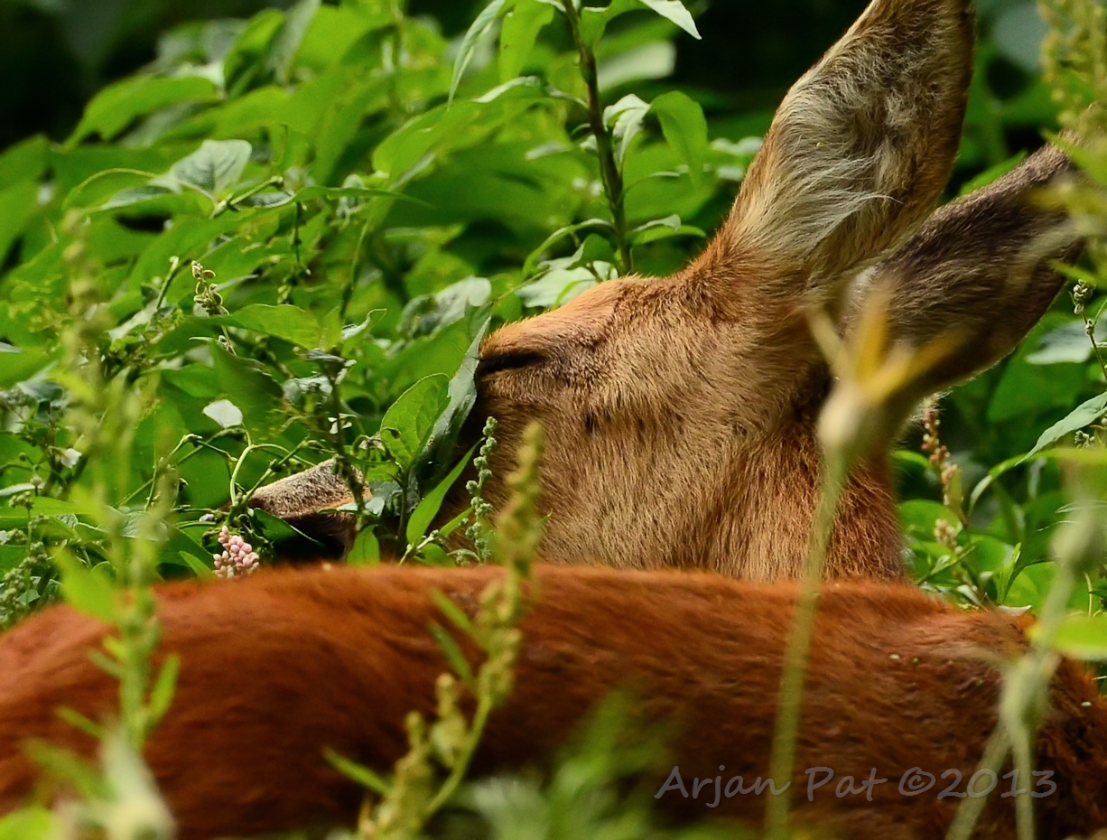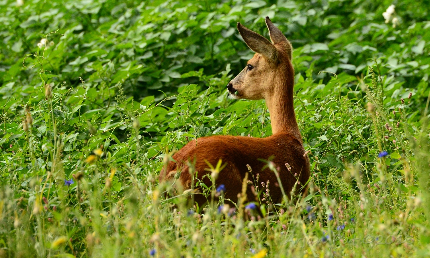 Net over het hoge grasgewas was een grazende reebok te zien....