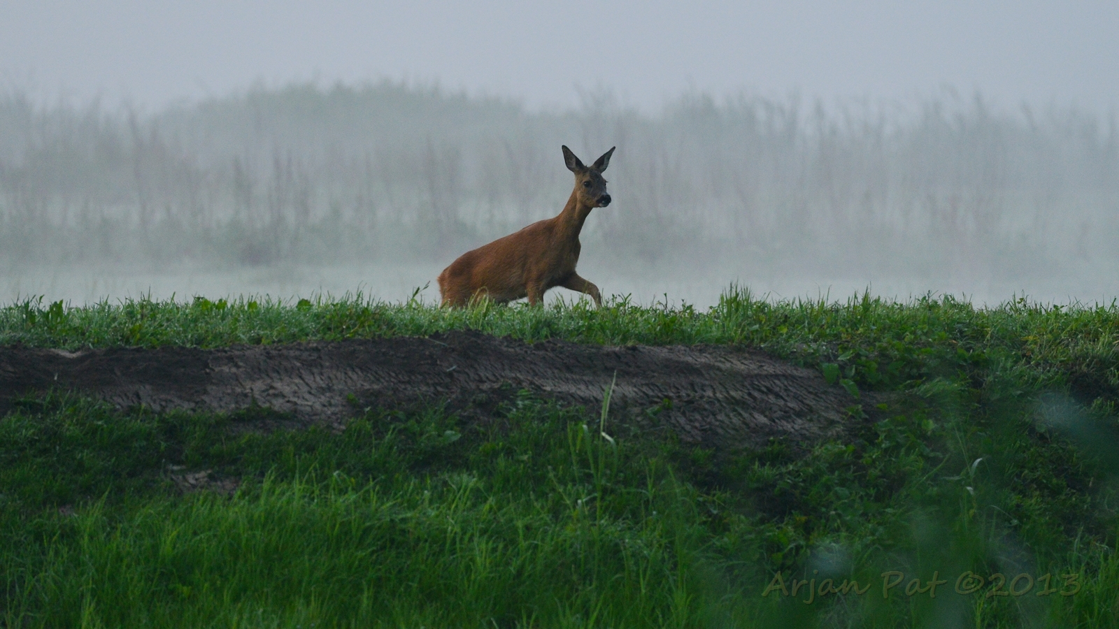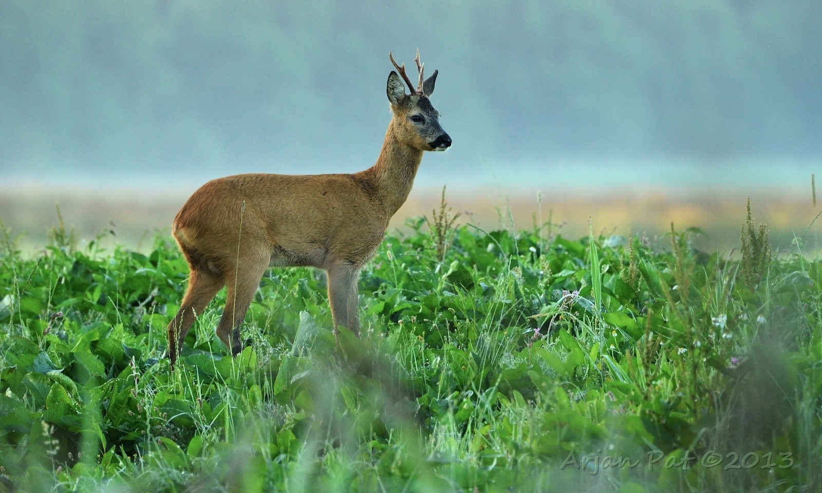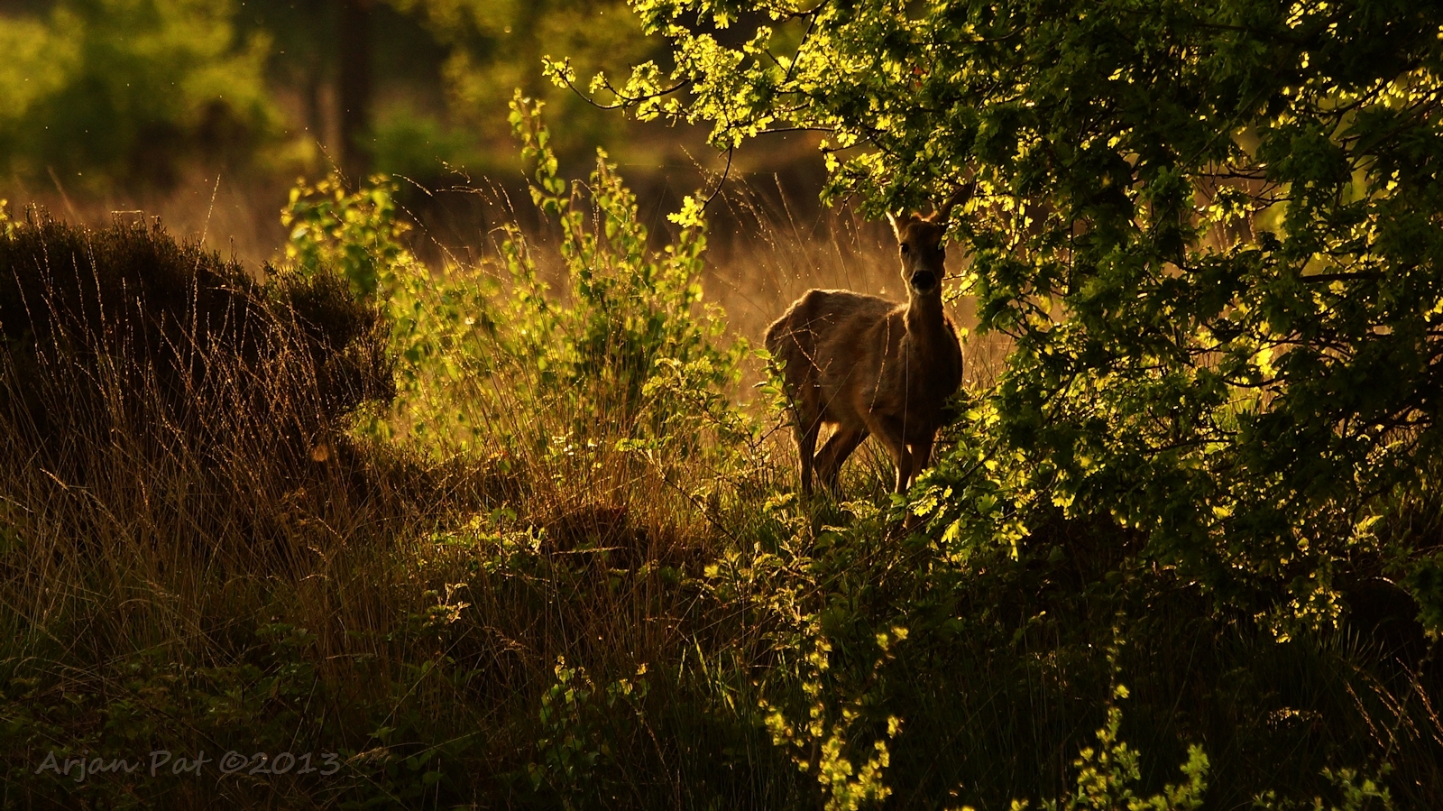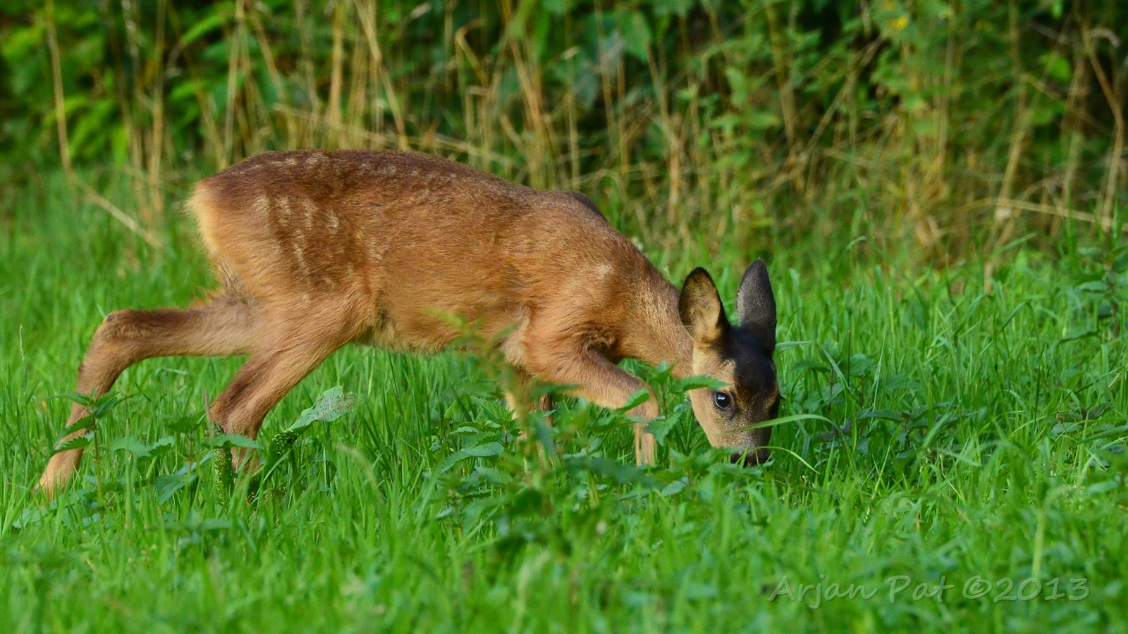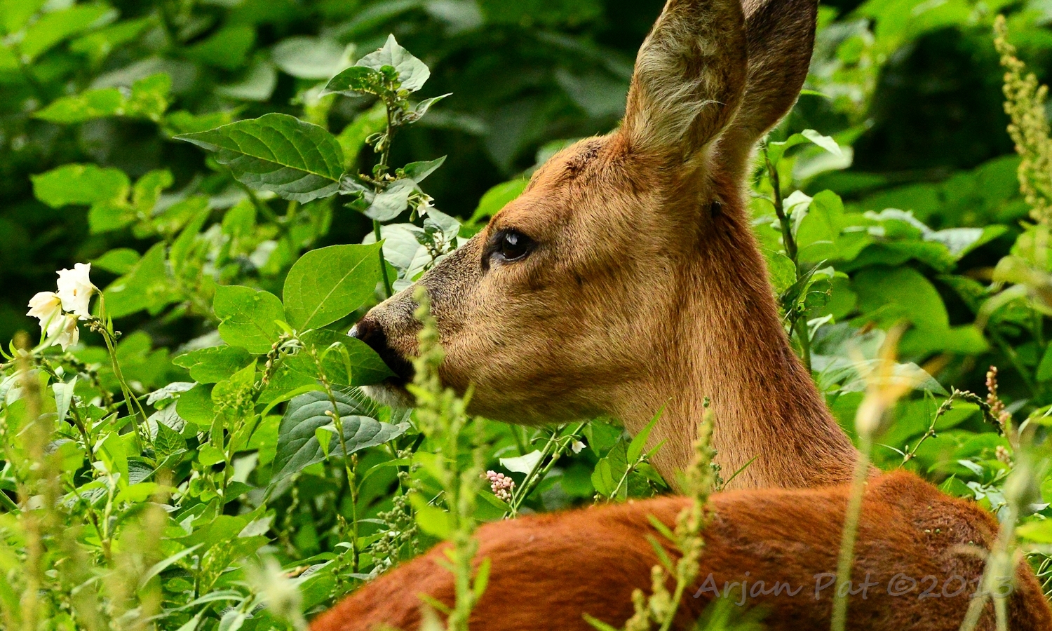 Net over het hoge grasgewas was een grazende reebok te zien....