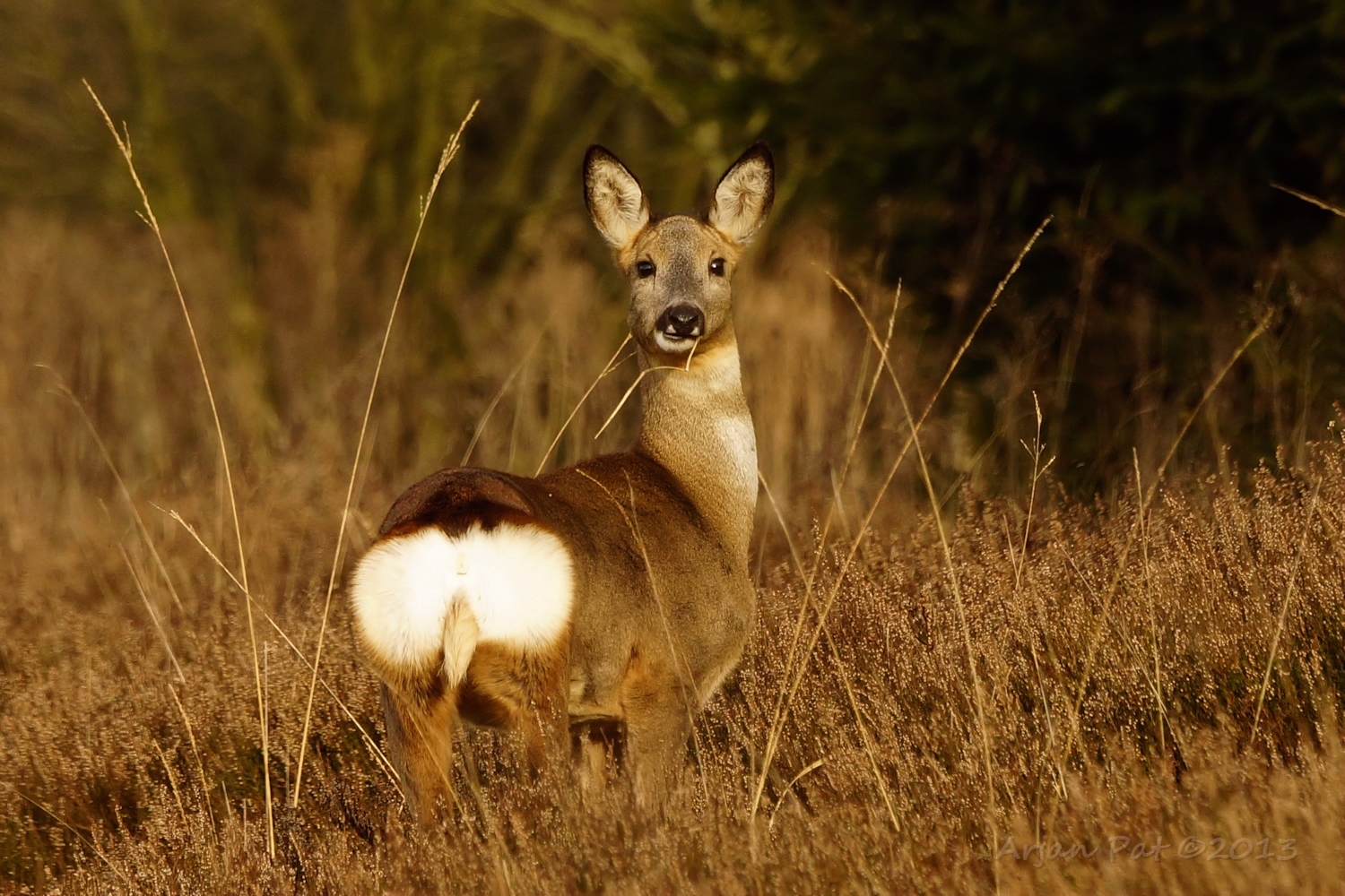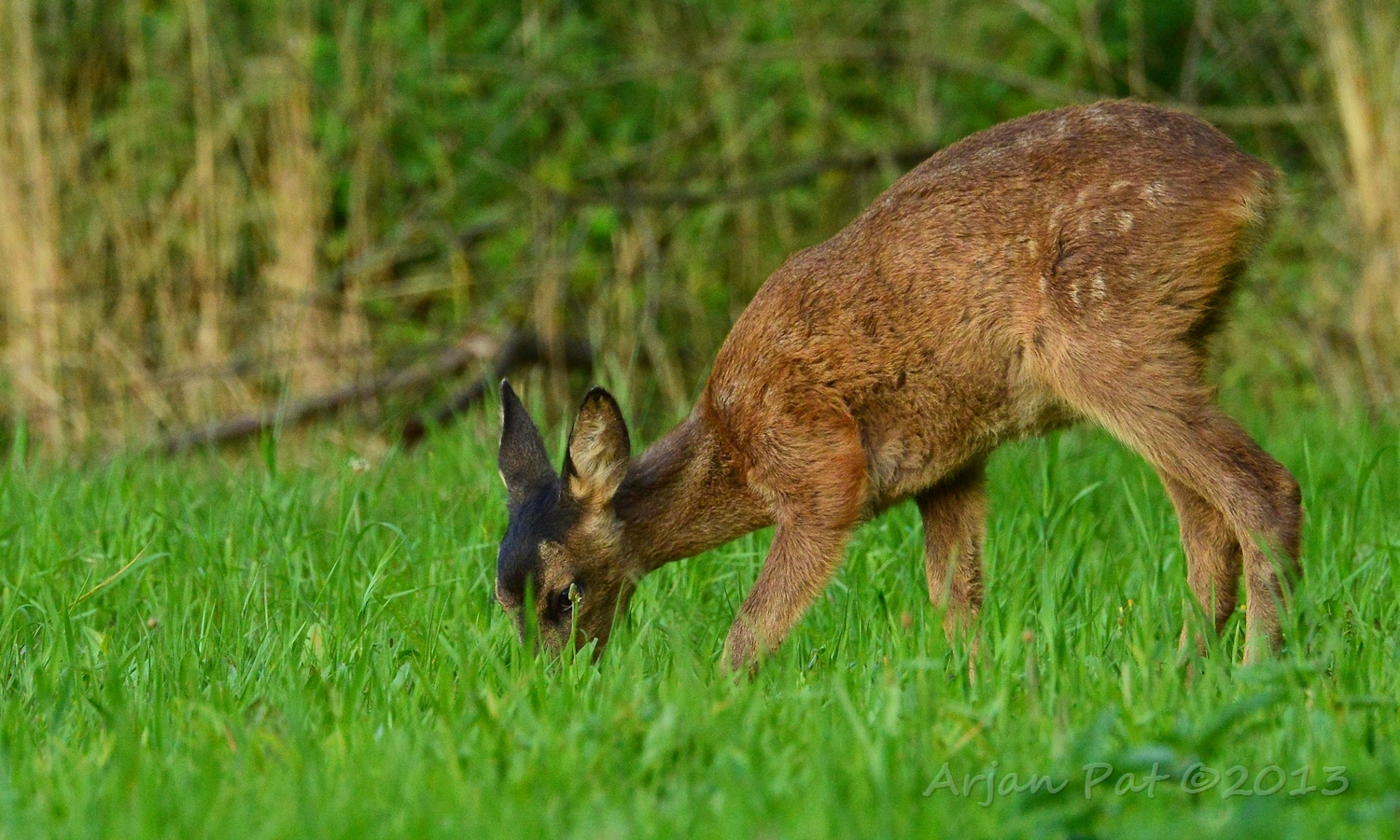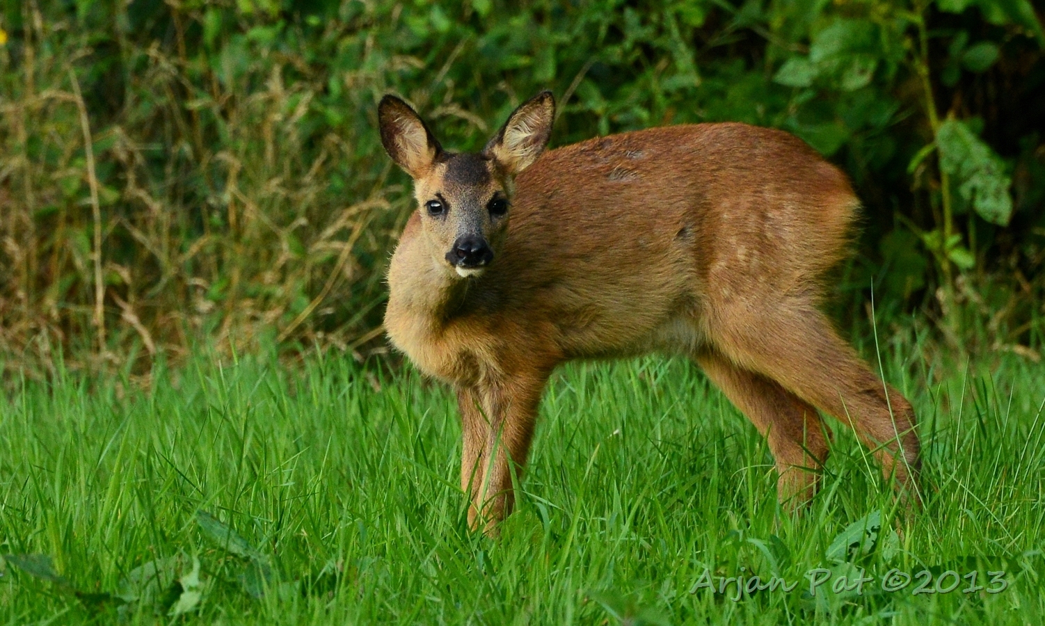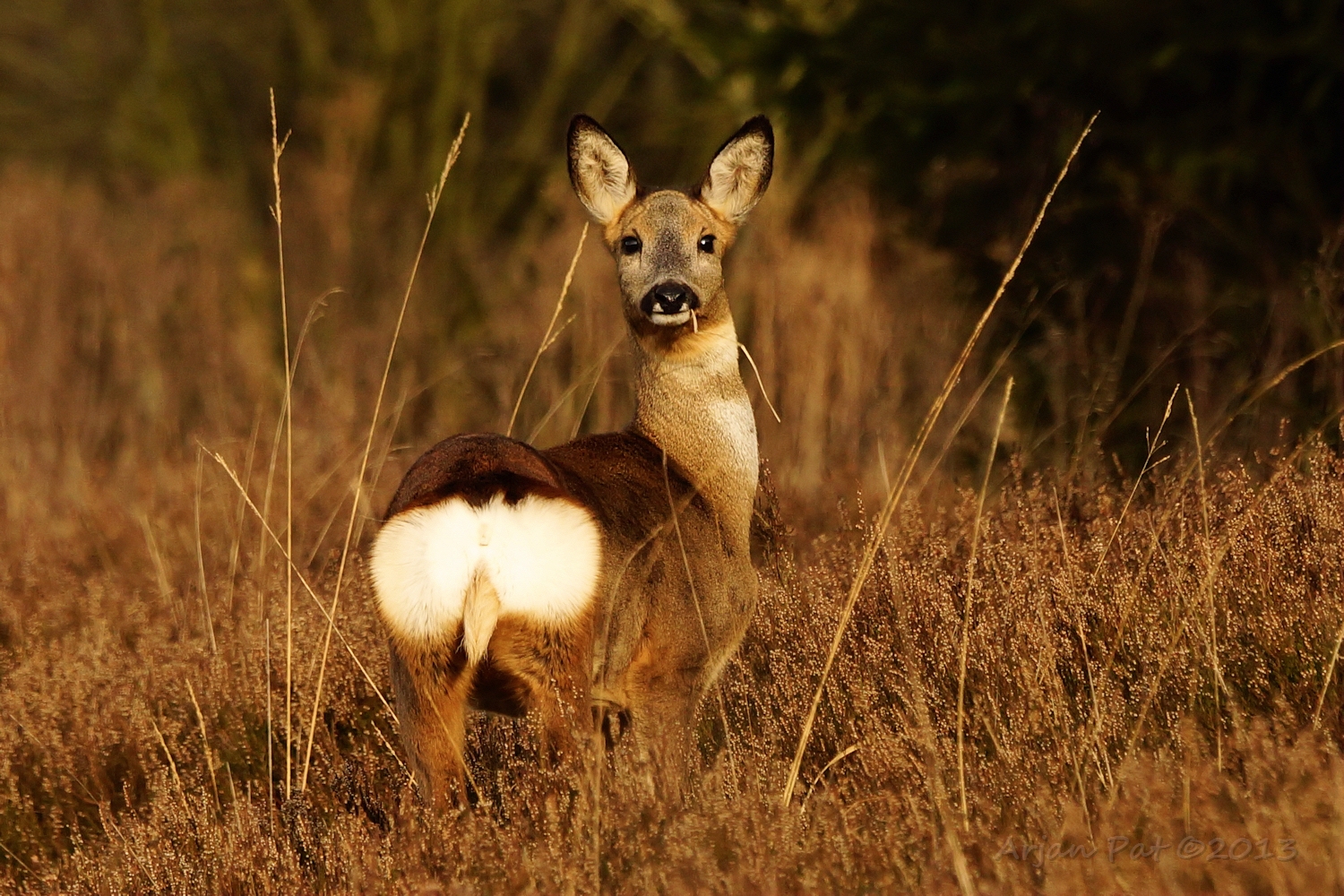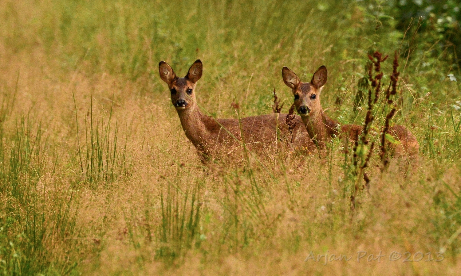 Net over het hoge grasgewas was een grazende reebok te zien....