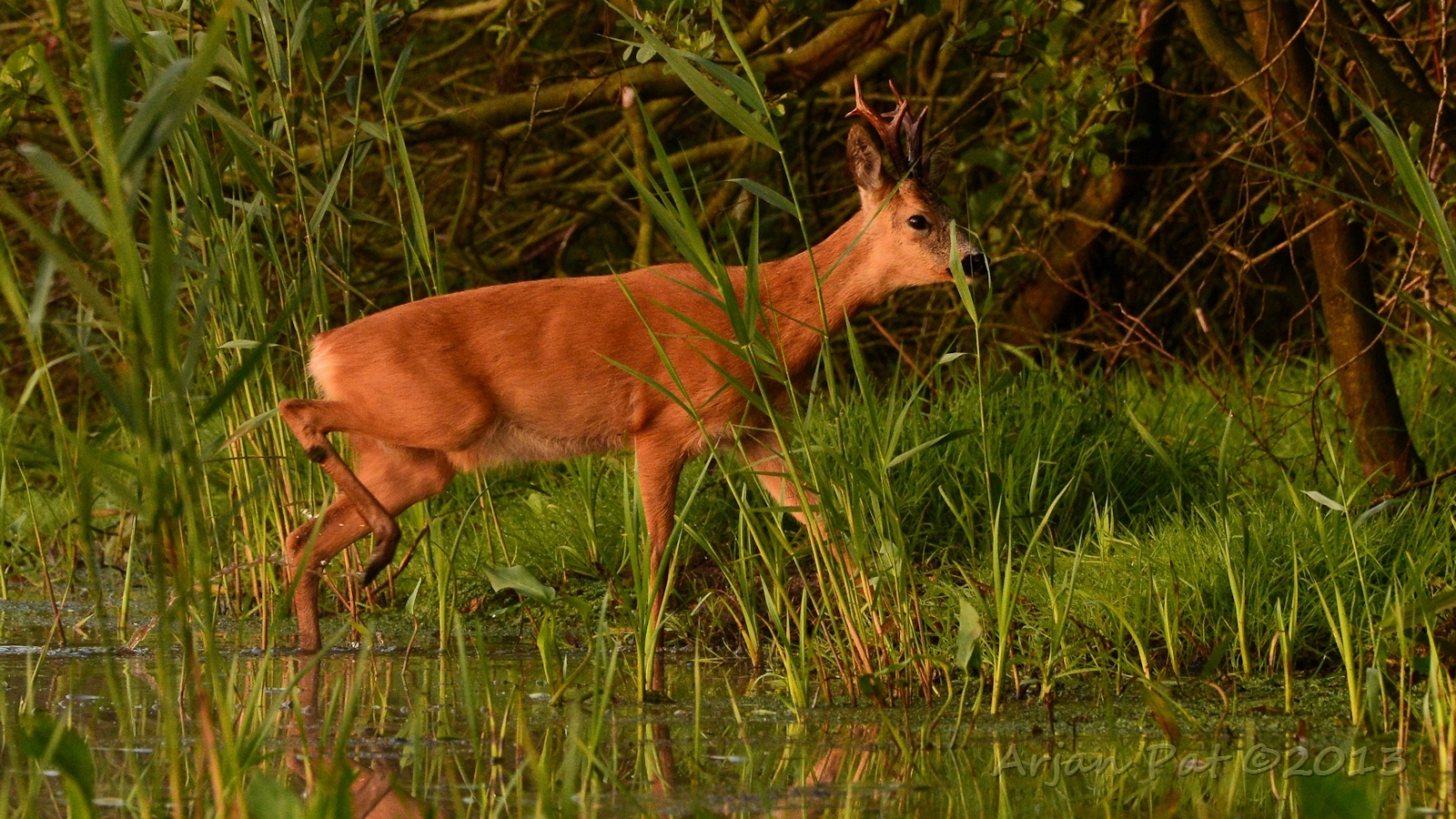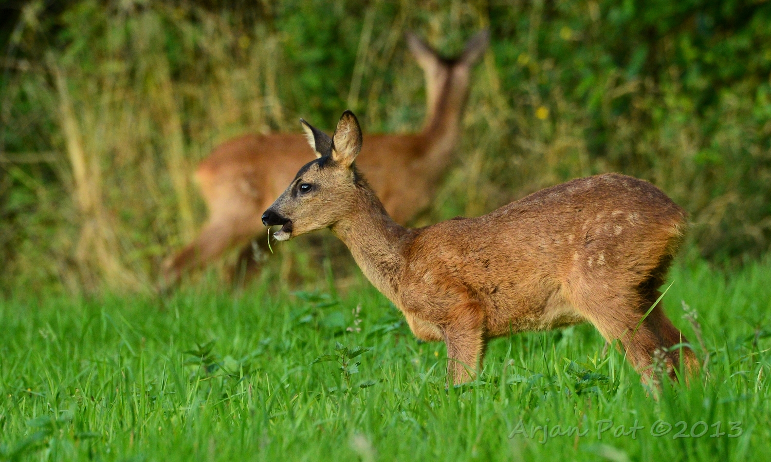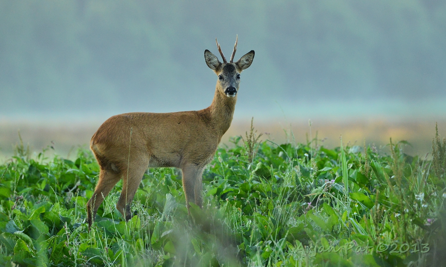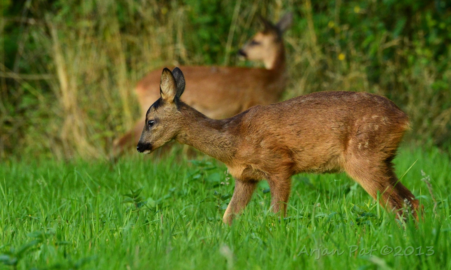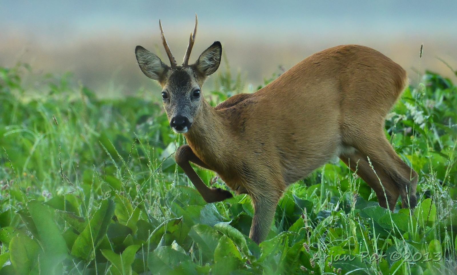 Net over het hoge grasgewas was een grazende reebok te zien....