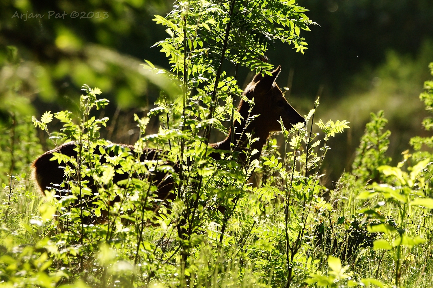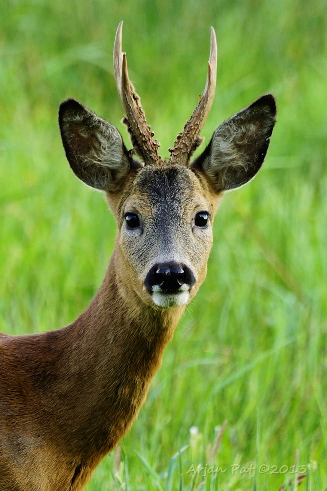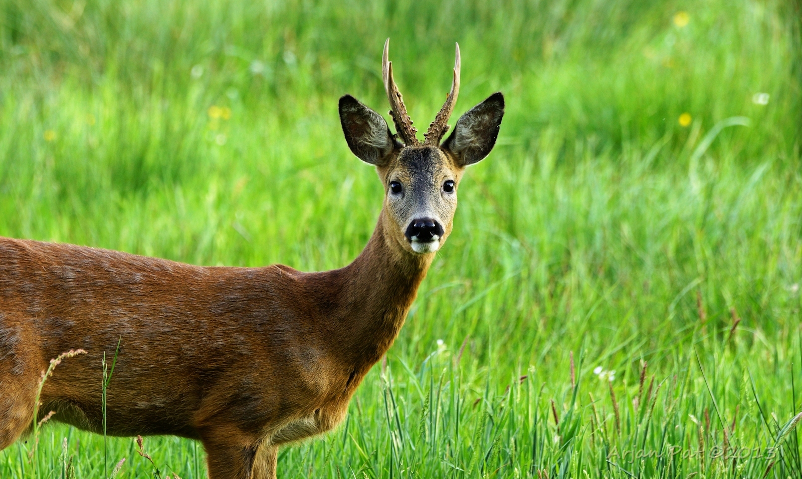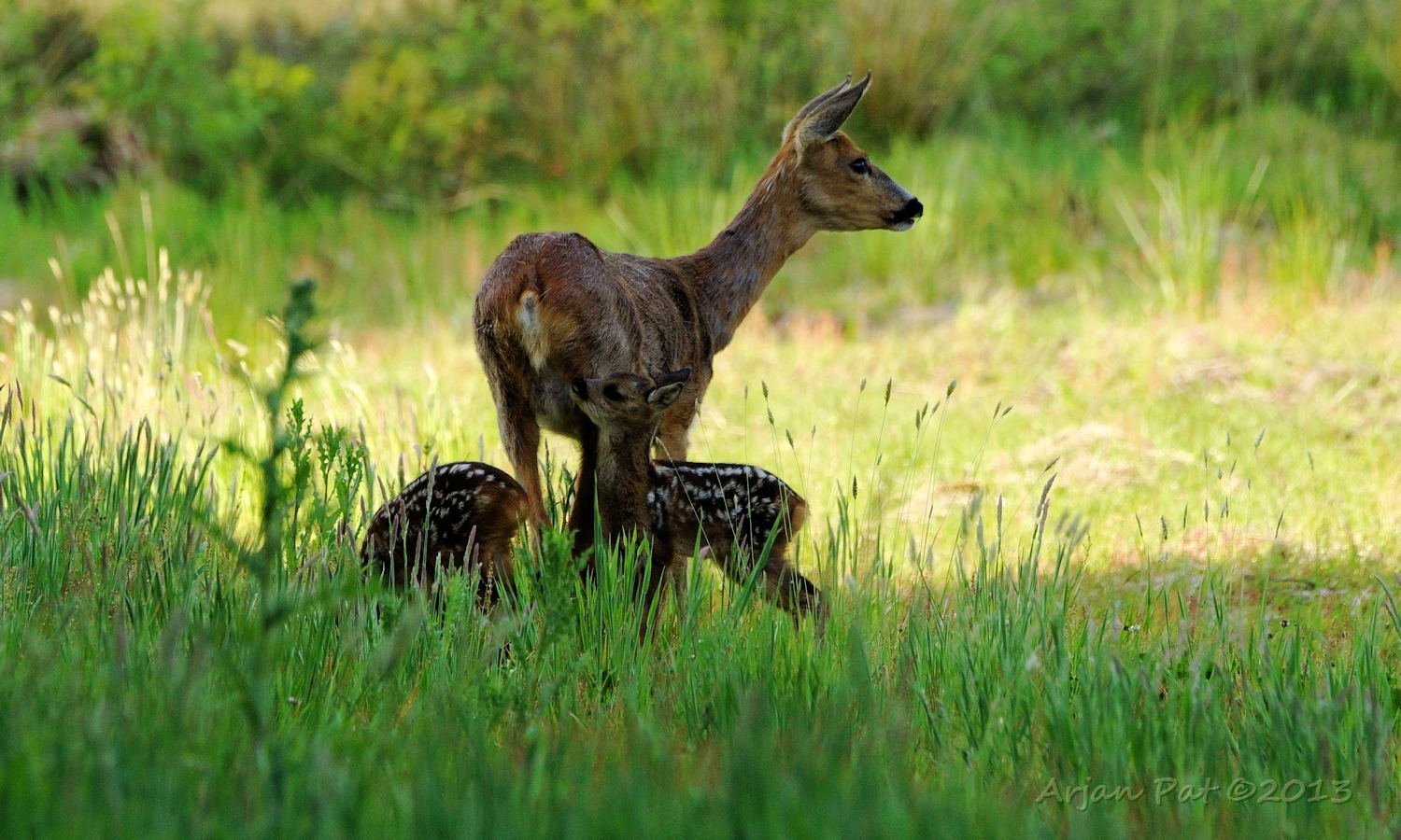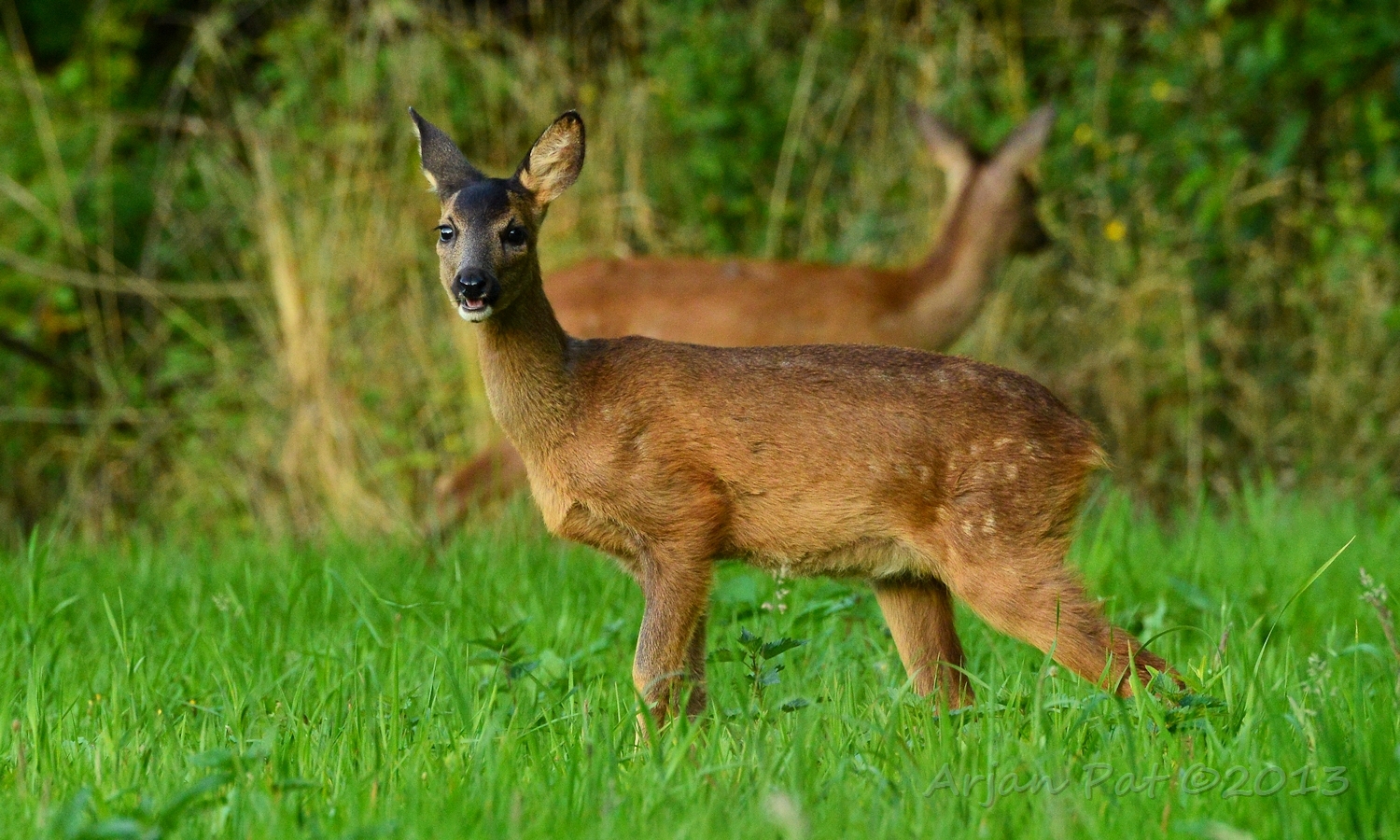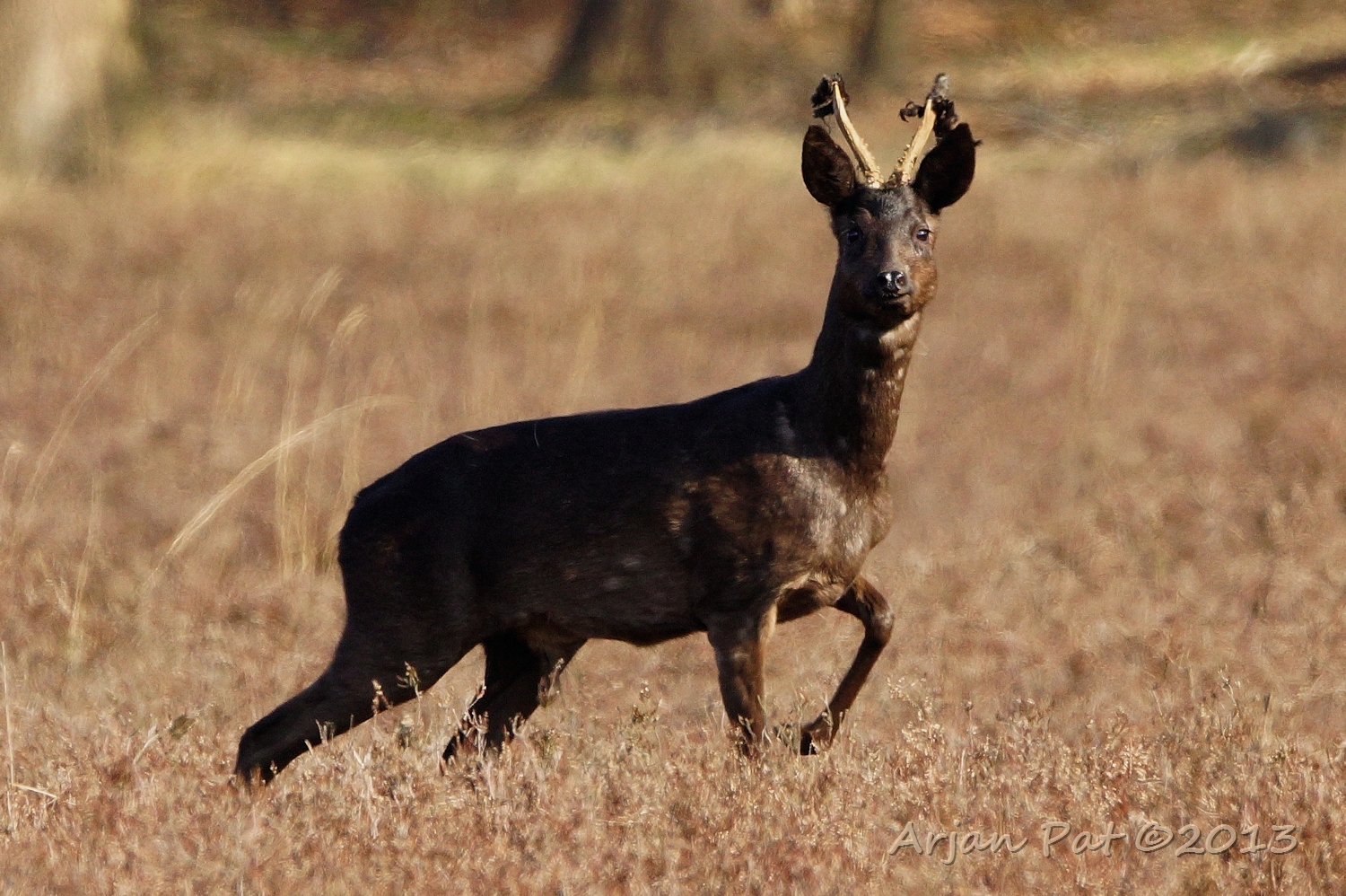 Net over het hoge grasgewas was een grazende reebok te zien....