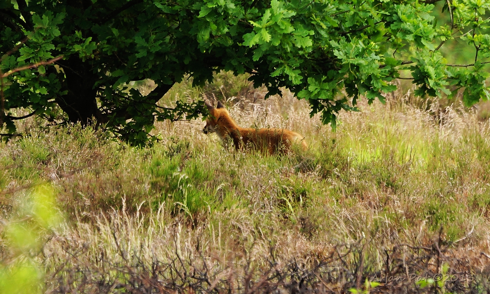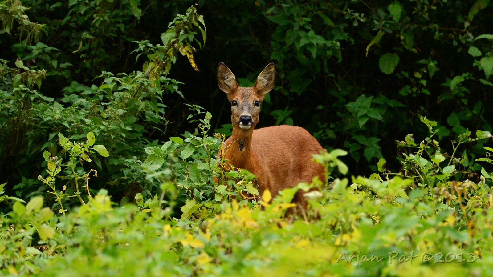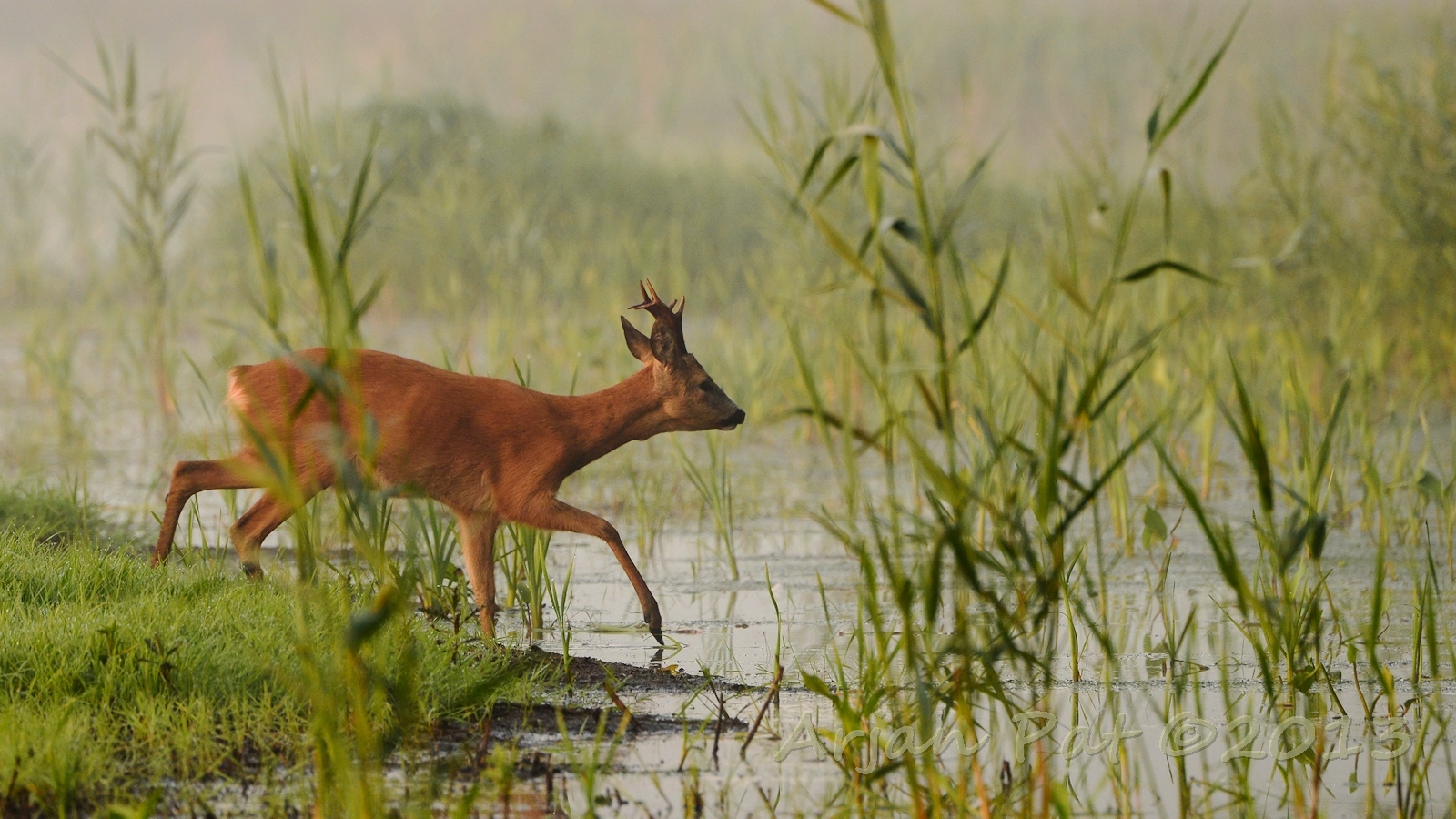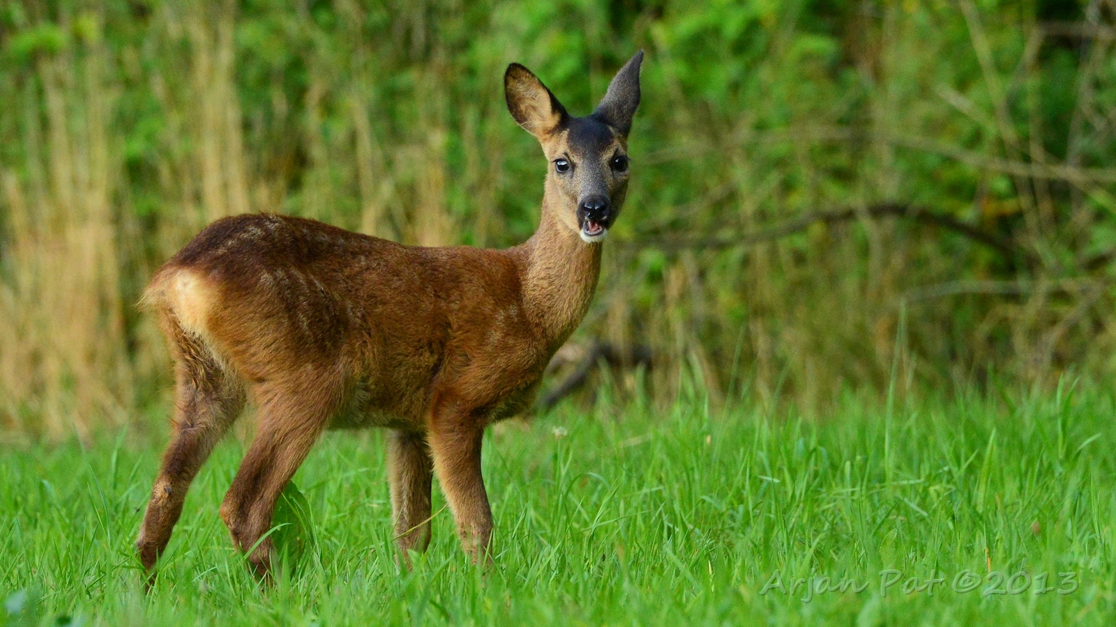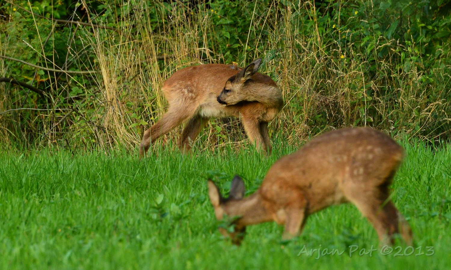 Net over het hoge grasgewas was een grazende reebok te zien....