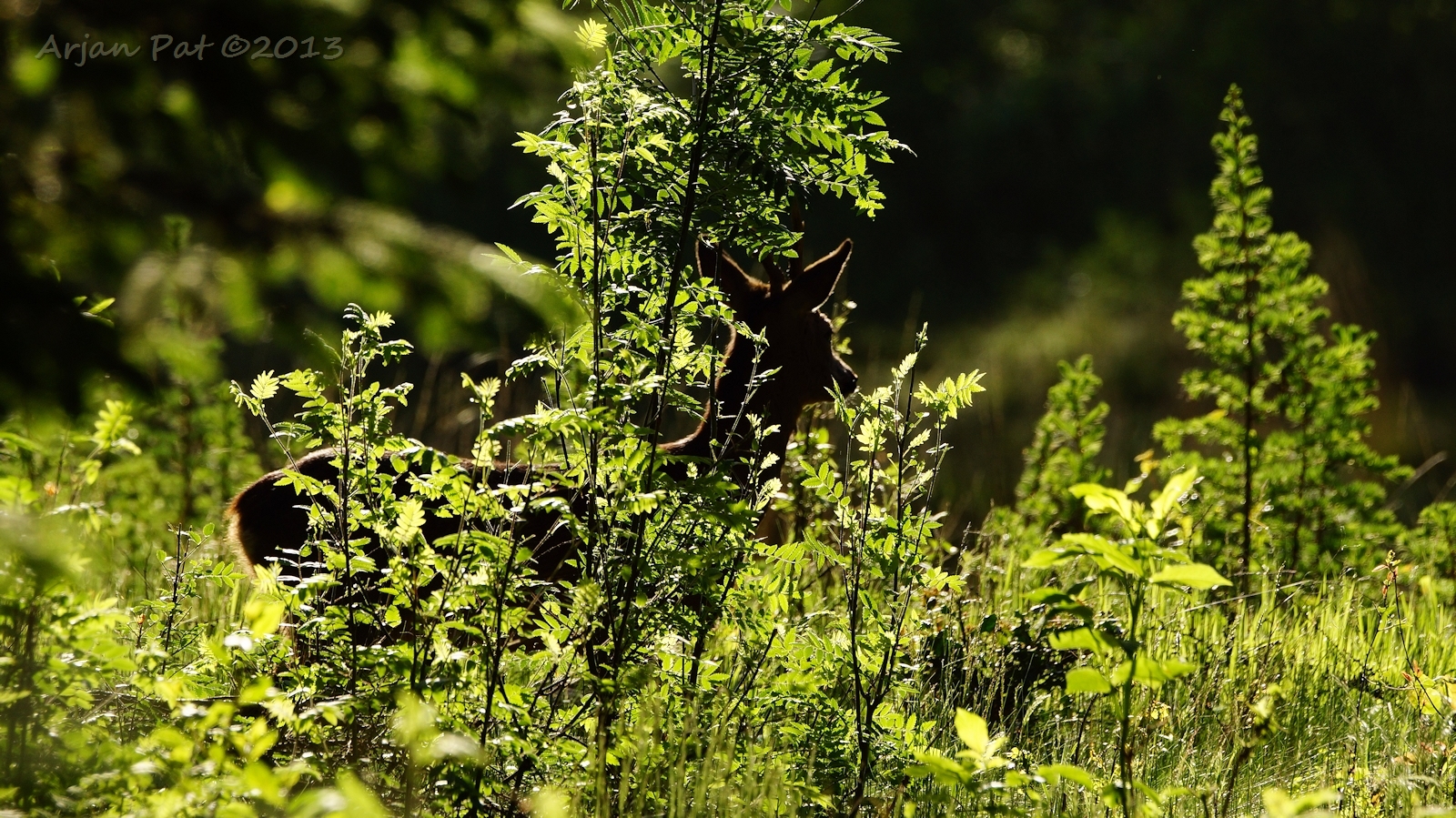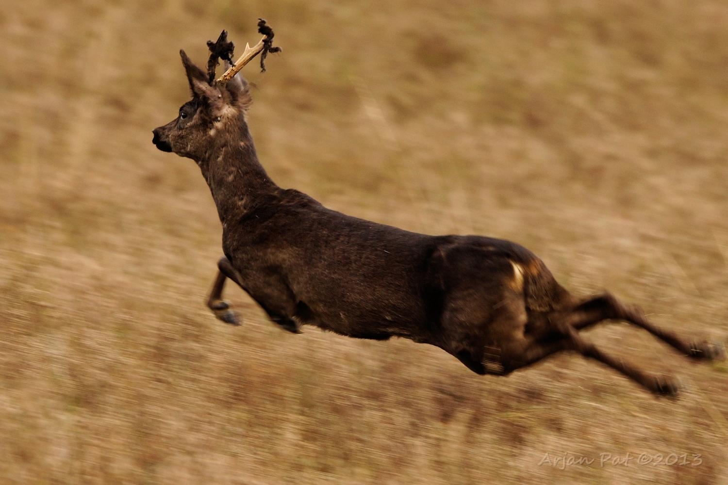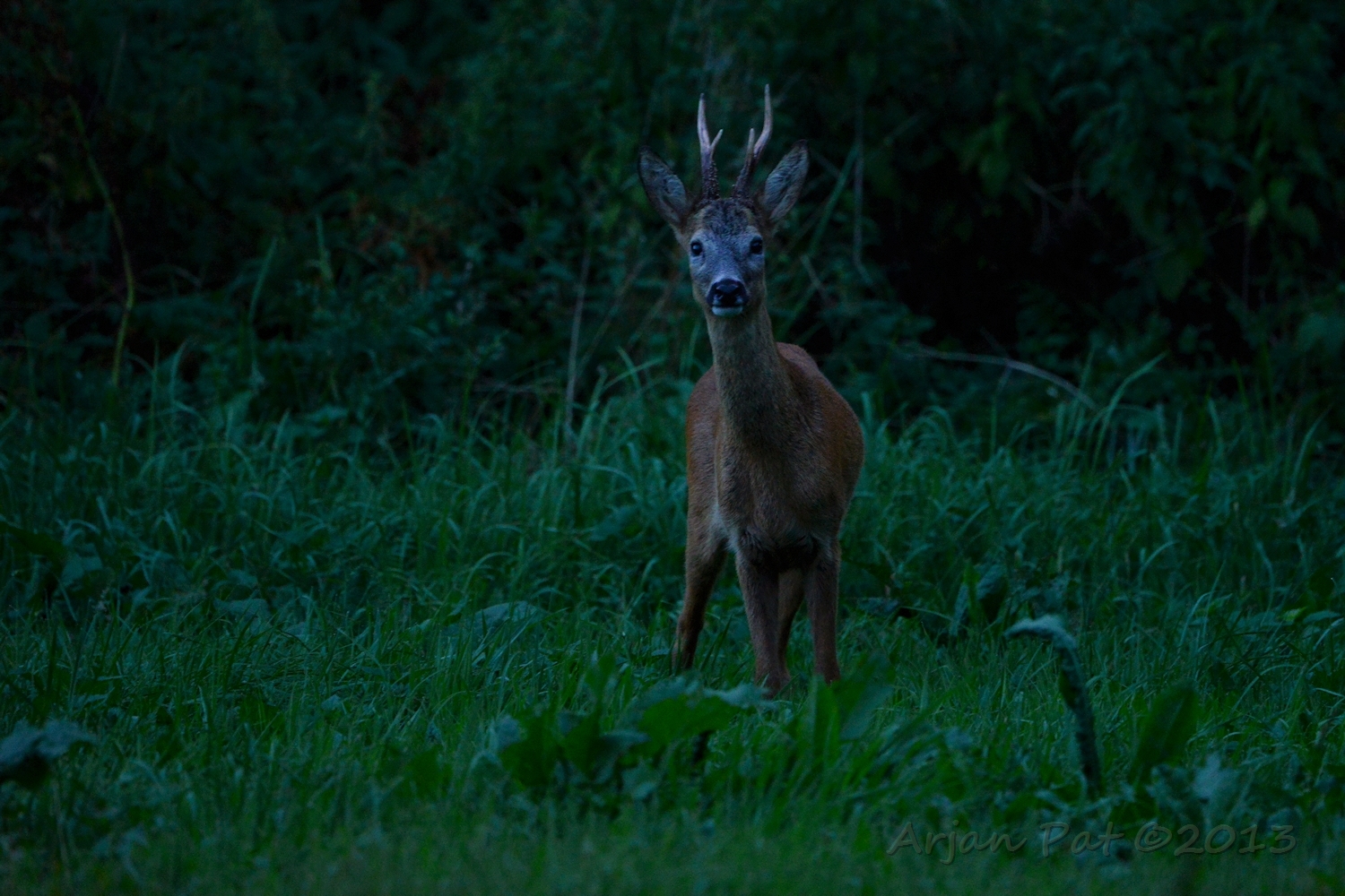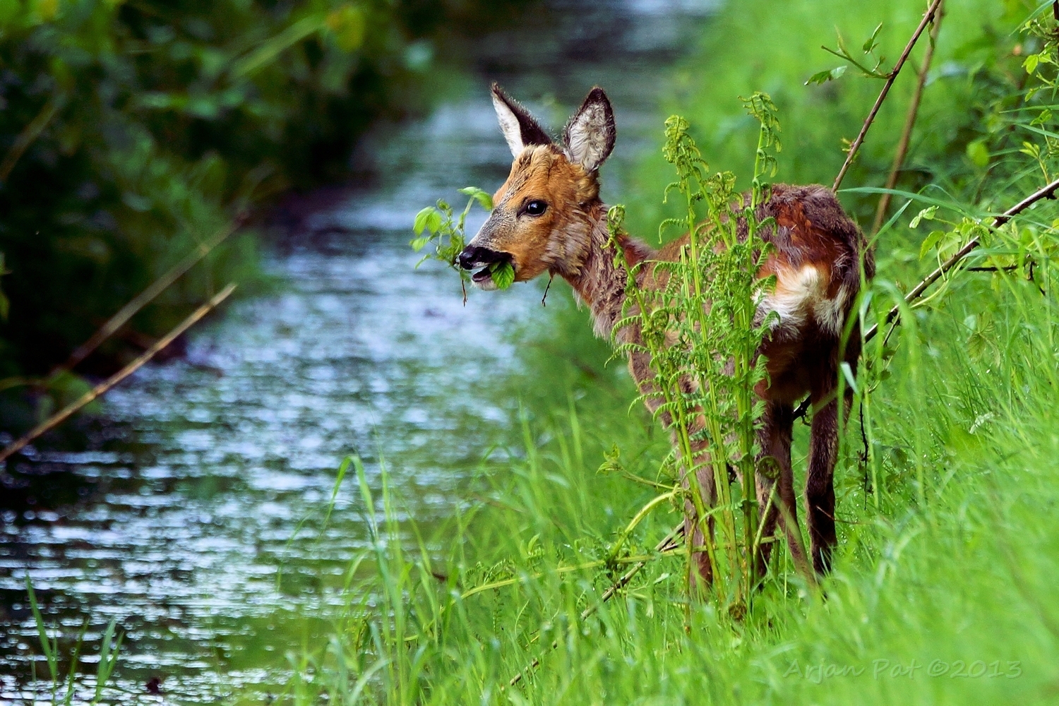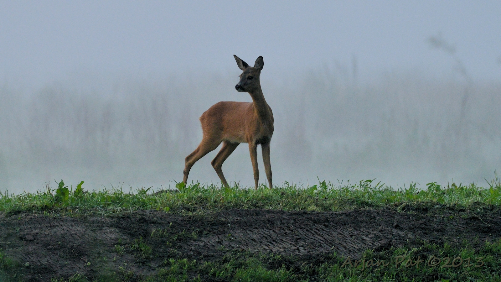 Net over het hoge grasgewas was een grazende reebok te zien....