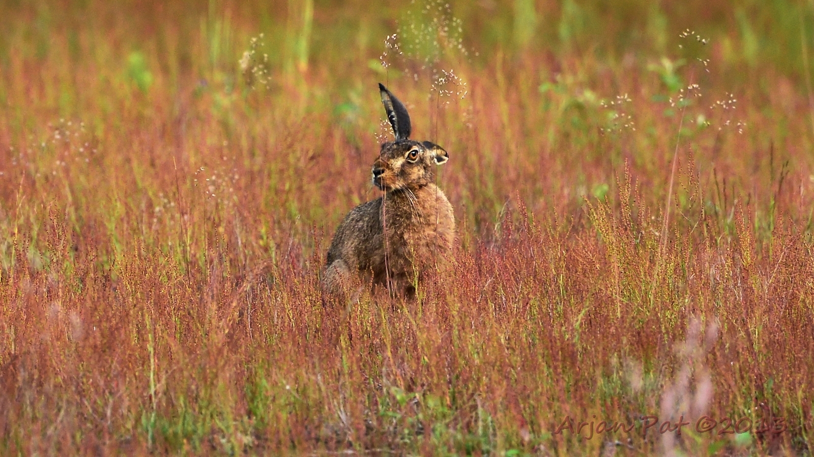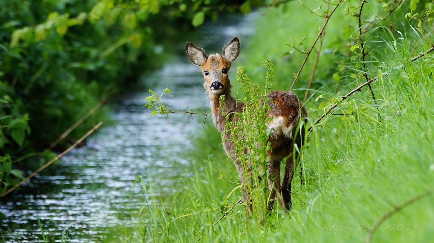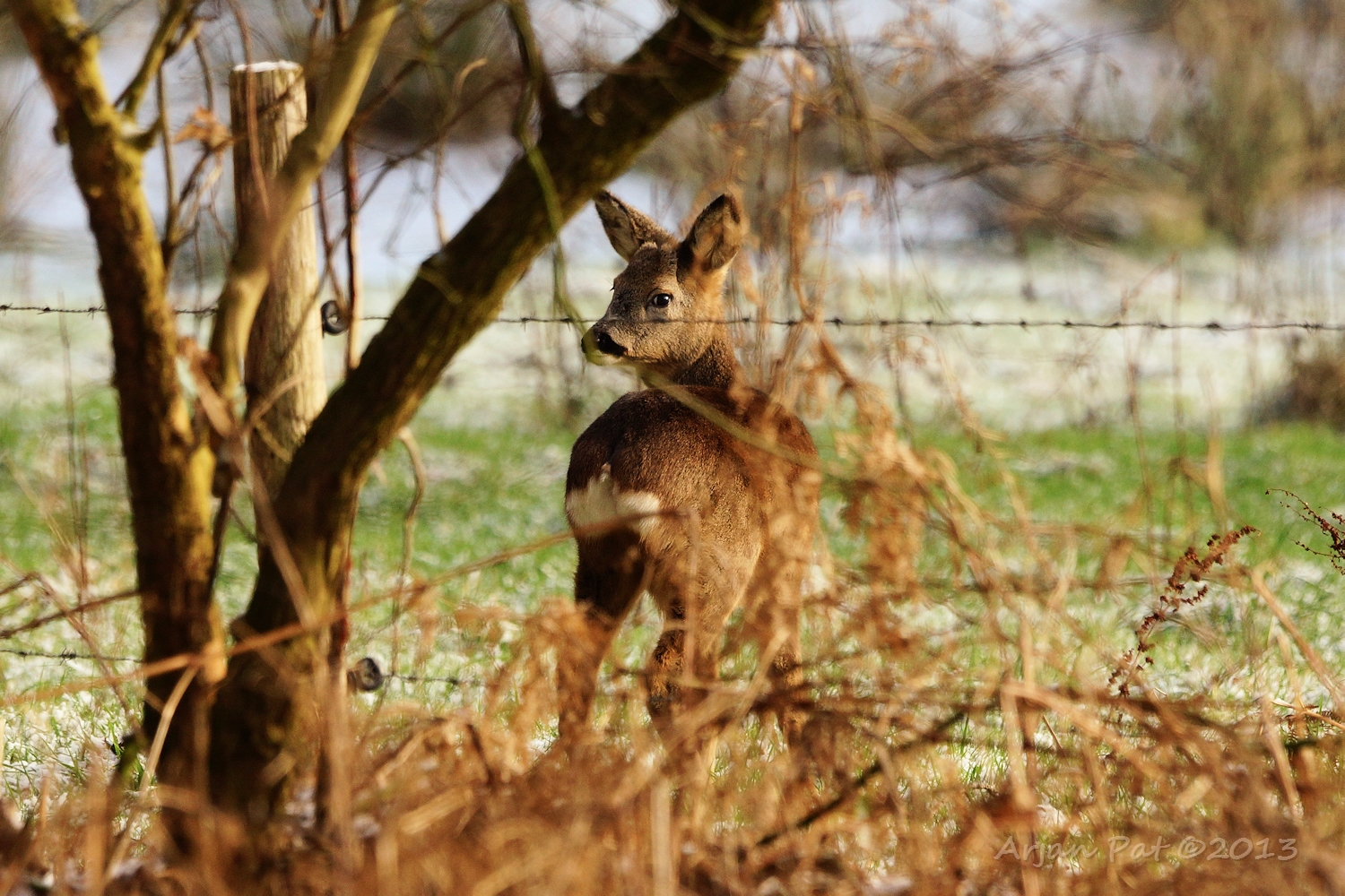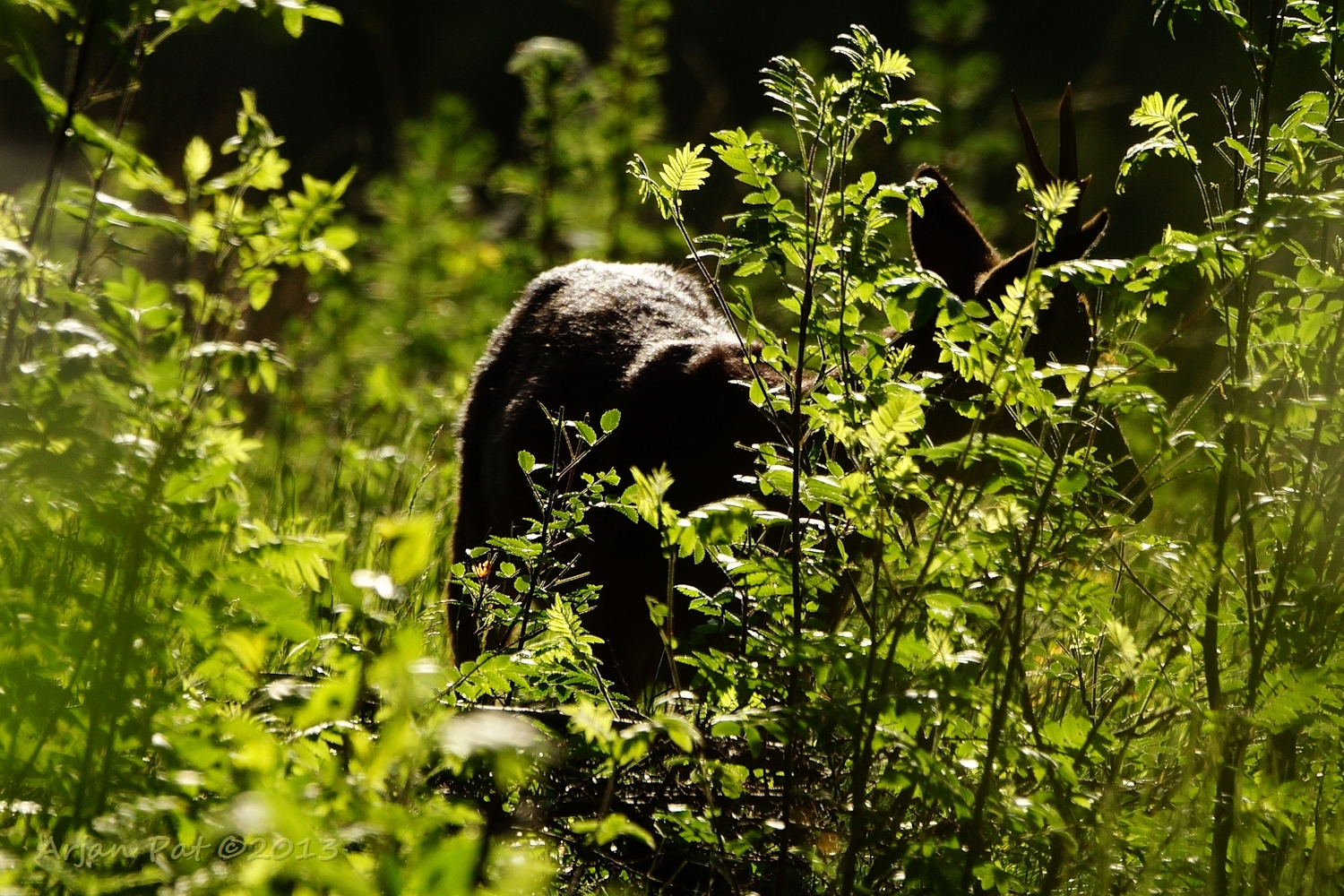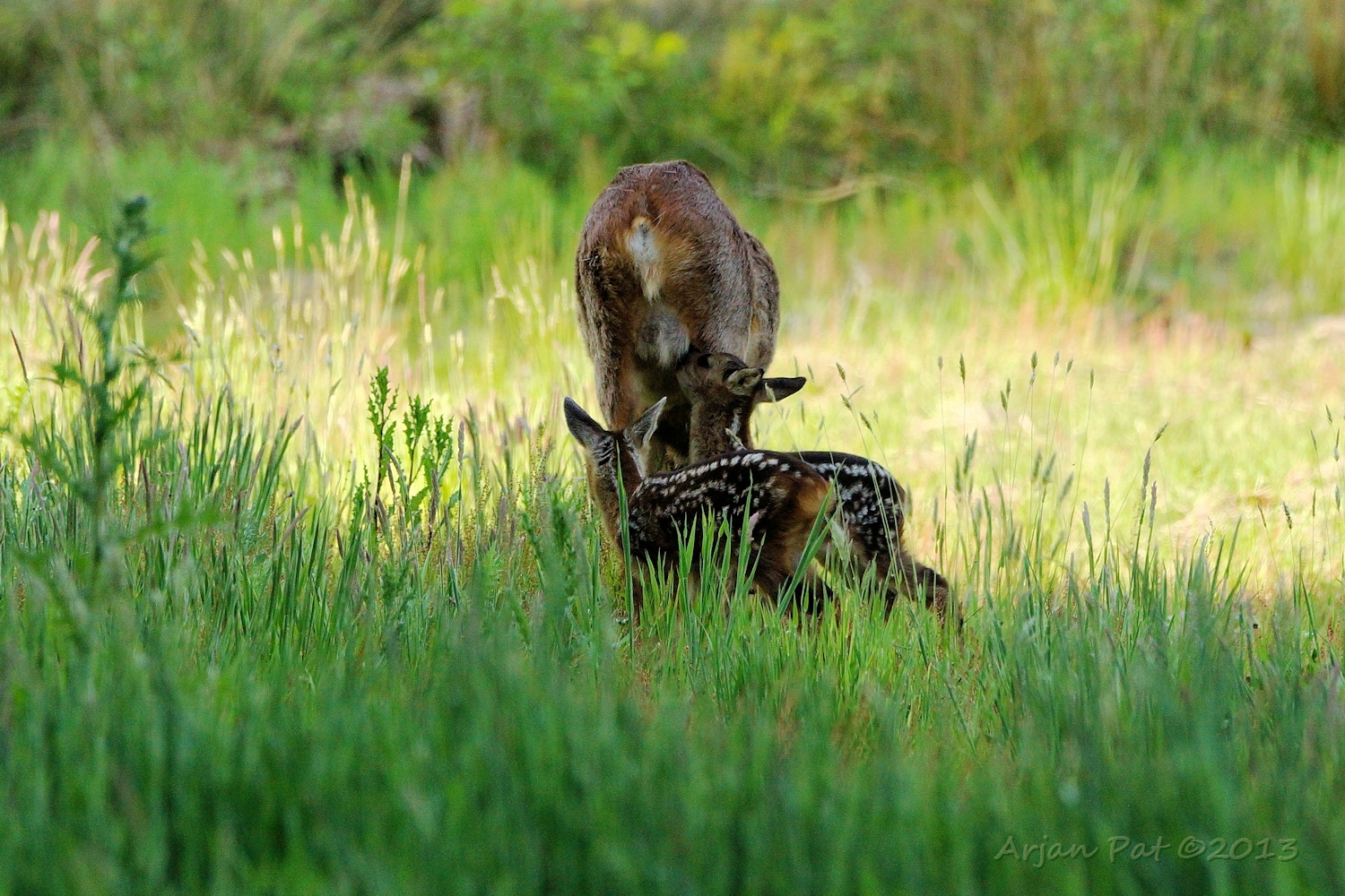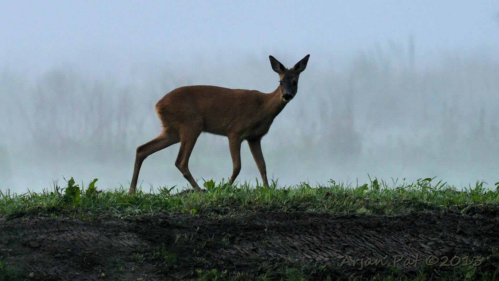 Net over het hoge grasgewas was een grazende reebok te zien....