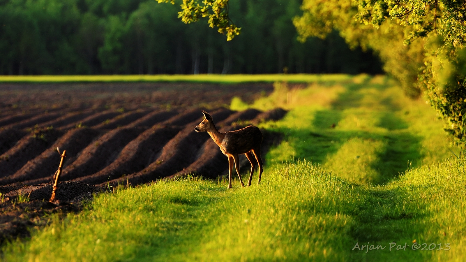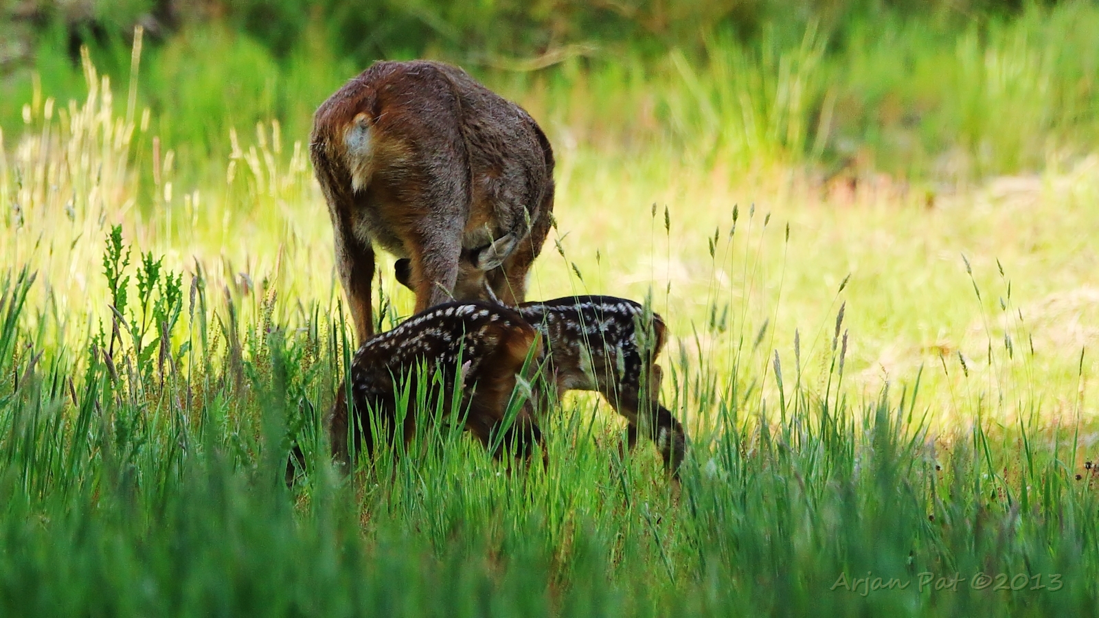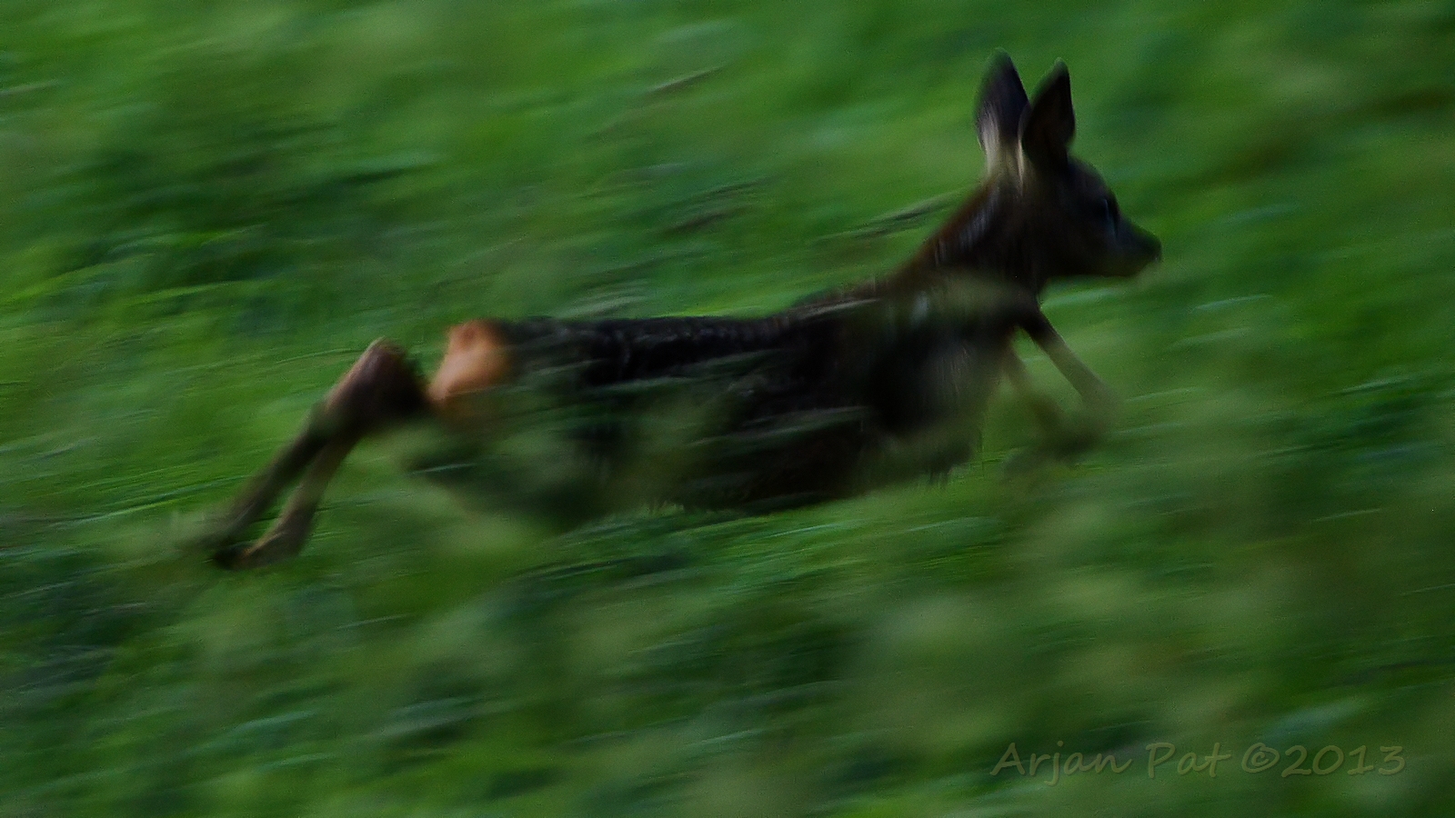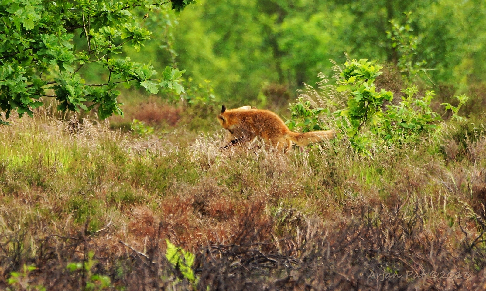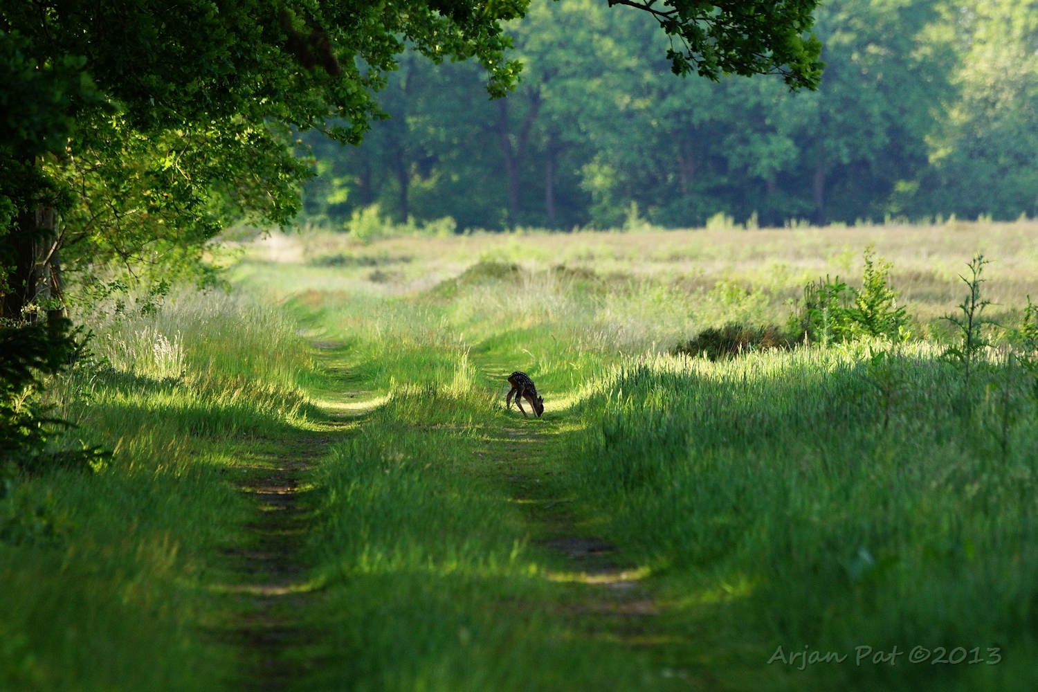 Net over het hoge grasgewas was een grazende reebok te zien....