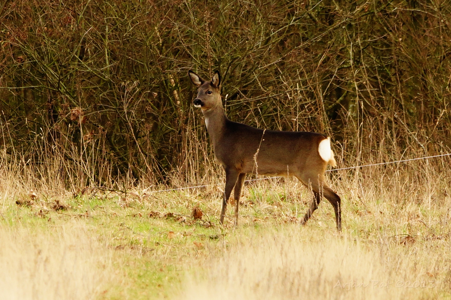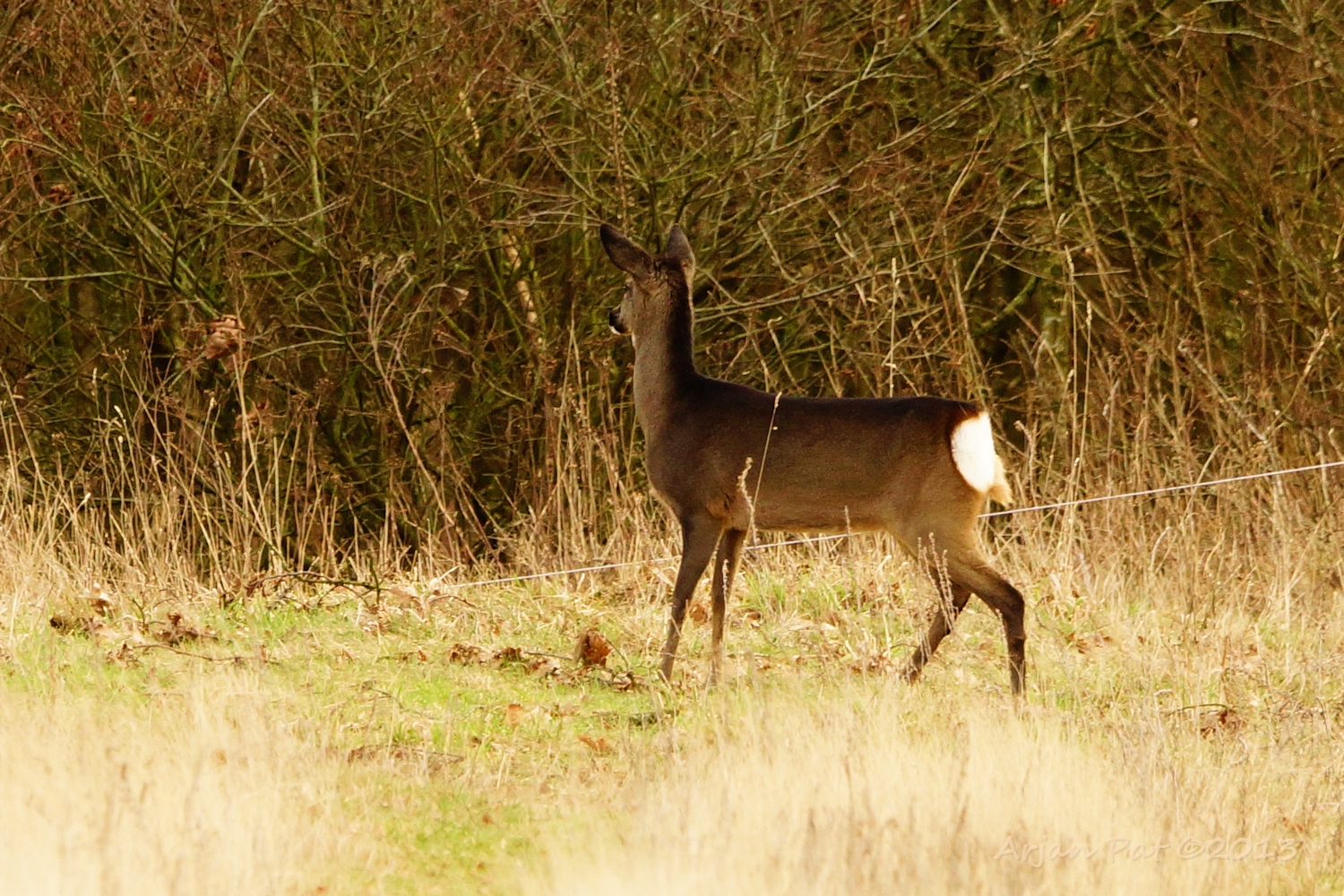 Ree kijkt een geschrokken haas na.