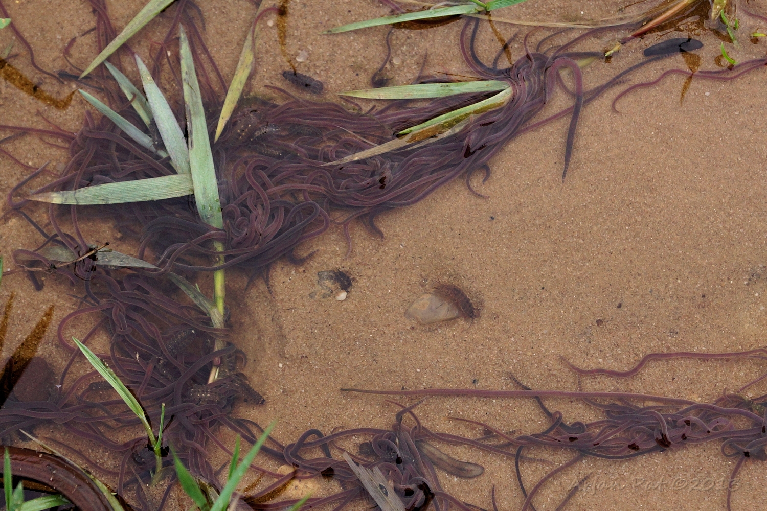 Het krioelt van de wormen in dit water, dat over het wandelpad stroomt.