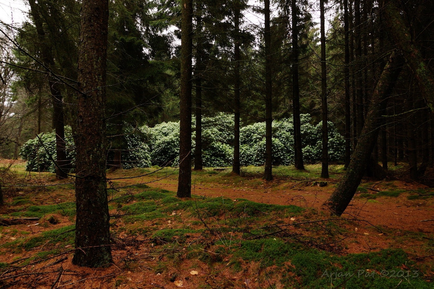 Midden in het bos een rododendron; hier heeft vroeger vast een boerderij of iets dergelijks gestaan. Alleen nu is er niks meer van te zien.