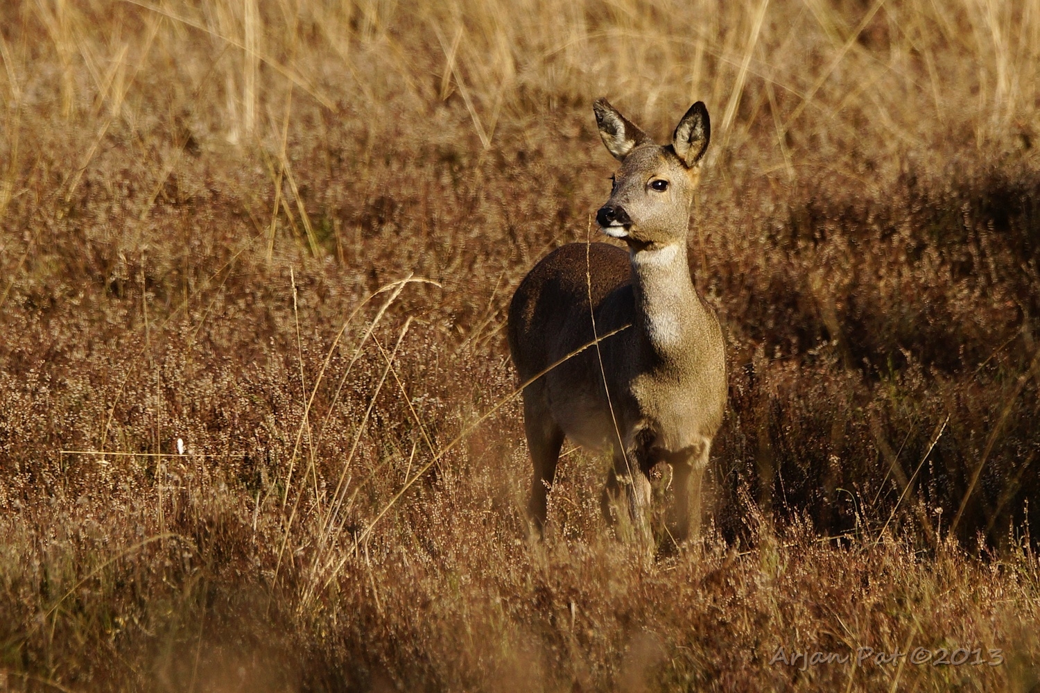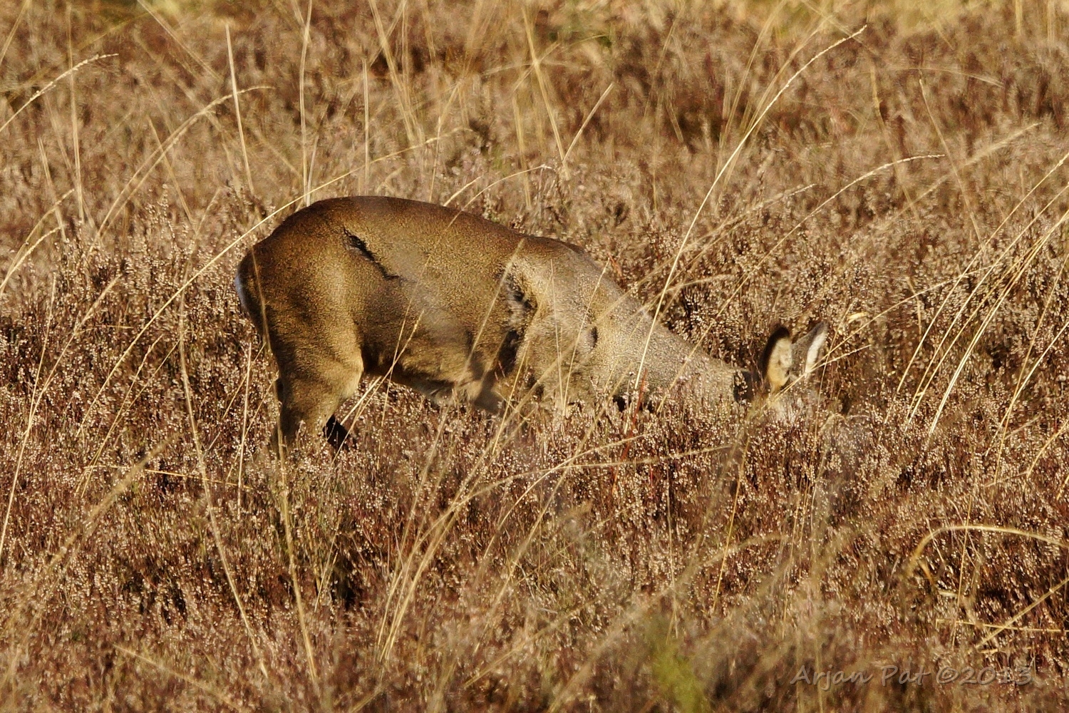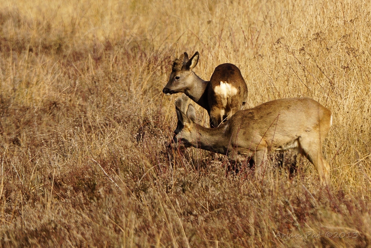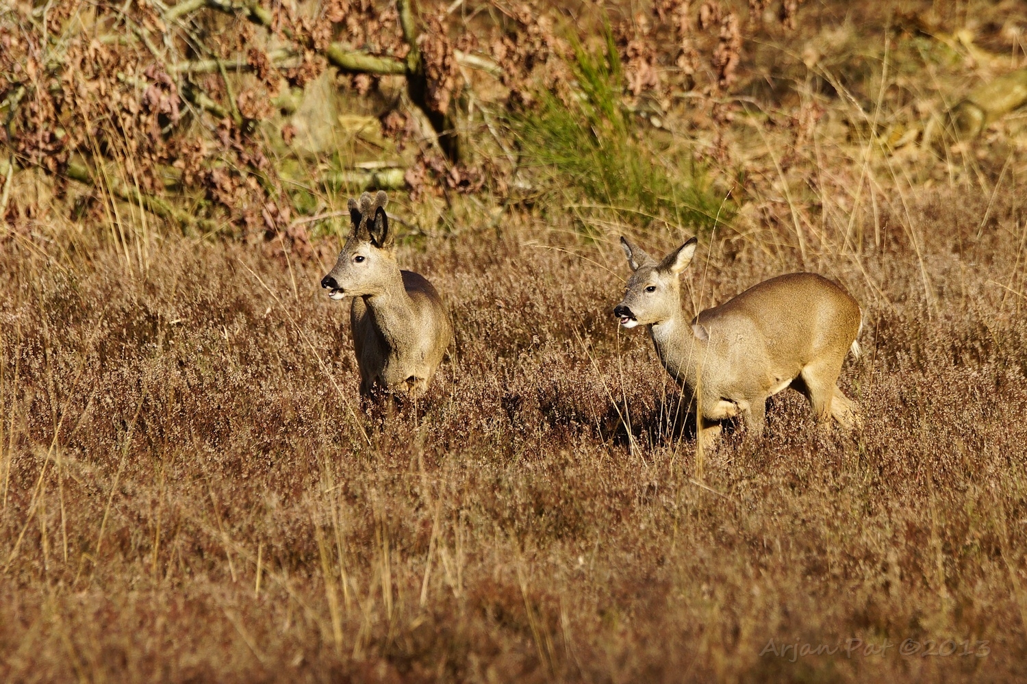In de luwte waren drie reeën (waarvan hier twee bij elkaar) aan het grazen aan de rand van een heideveld.