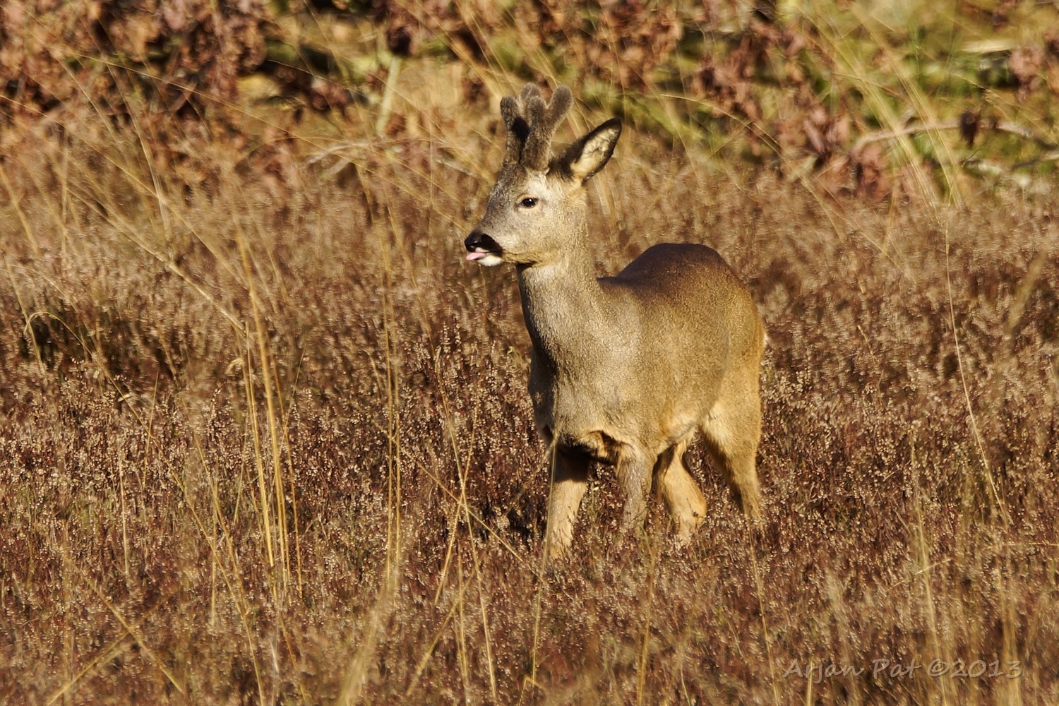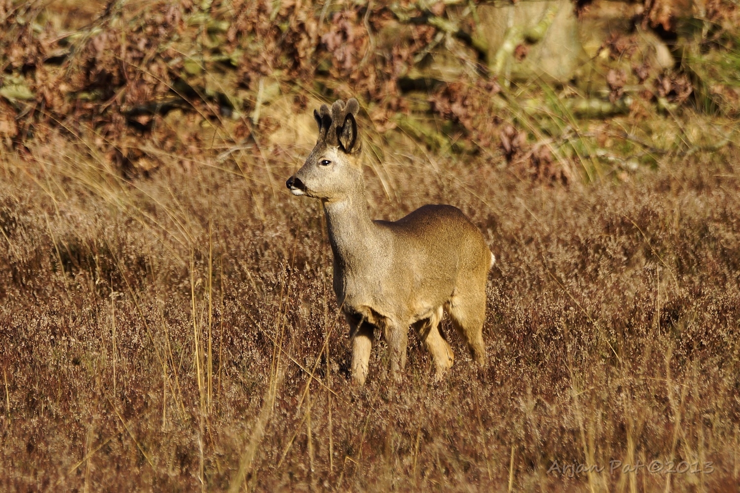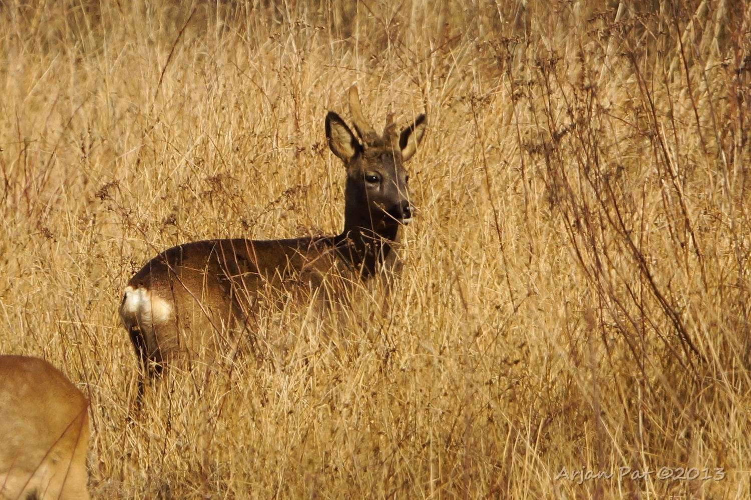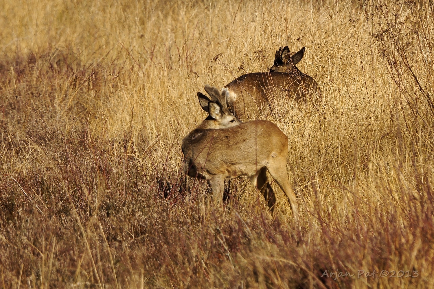 Die donkere heeft warempel ook een misvormd gewei. Zal het dezelfde 'eenhoorn' zijn, die ik hier vorige jaar ook zag? Ze krijgen elk jaar een ander gewei, maar deze heeft een soortgelijk gewei als een reebok die ik hier vorig jaar ook zag.