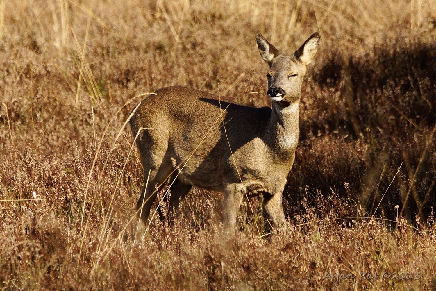 Moeder ree genietend van het zonnetje of sloot ze haar ogen als bescherming tegen de harde wind? Er zat veel zand in de lucht. M'n cameralens bleek bij thuiskomst vol zand te zitten. Vandaar dat niet alle foto's mooi scherp zijn geworden, denk ik.