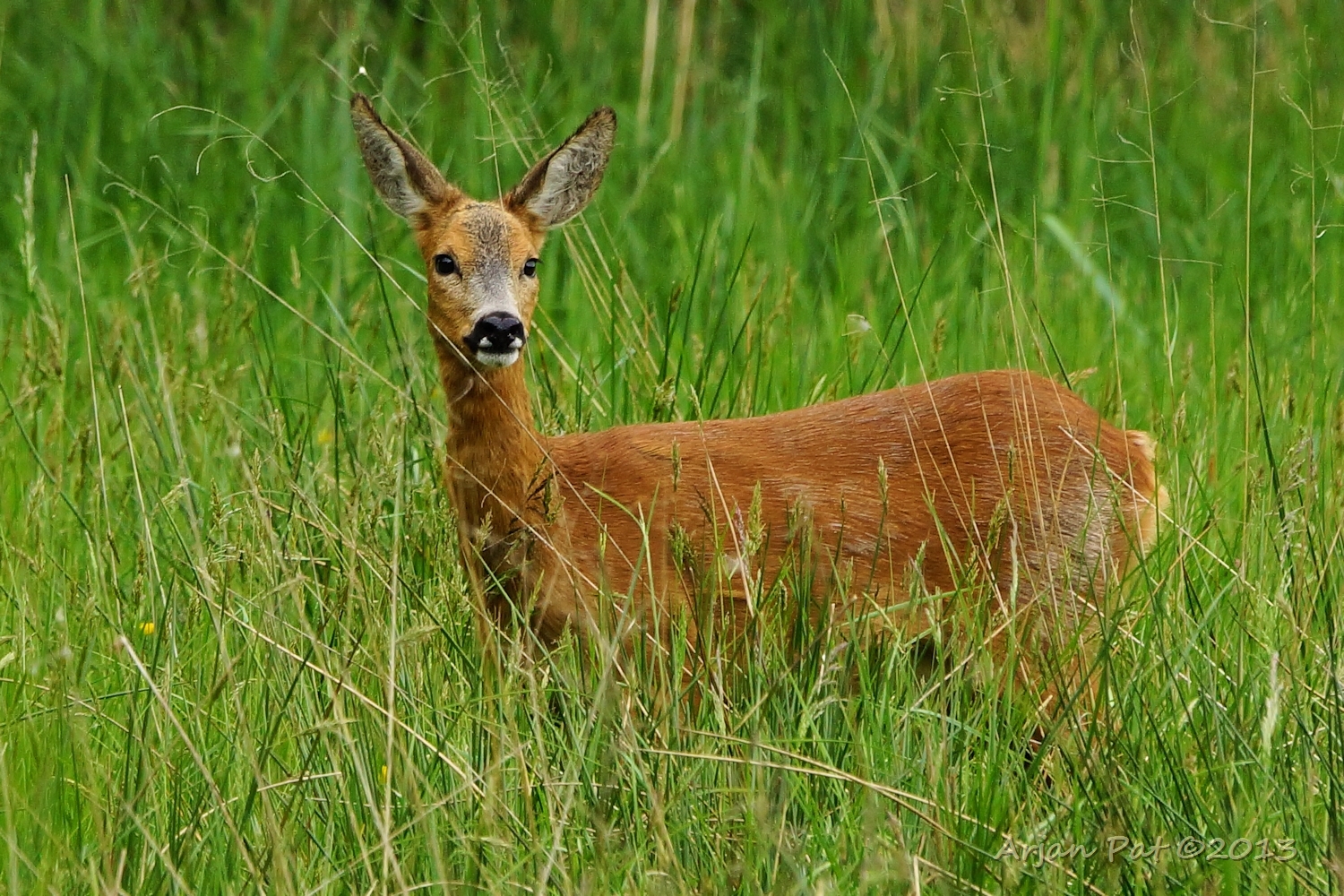 Ik wou ze wel wegjagen, maar was bang ze in de richting van de jagers te 'jagen'. Na een poosje met deze gedachte stil gestaan te hebben, begon m'n vader plots met z'n armen te zwaaien. De reeën gingen op de vlucht.... gelukkig weg van de jagers (volgens mij had de reemoeder al vernomen dat er 'iets' was, achter het riet, daar waar de jager stonden).