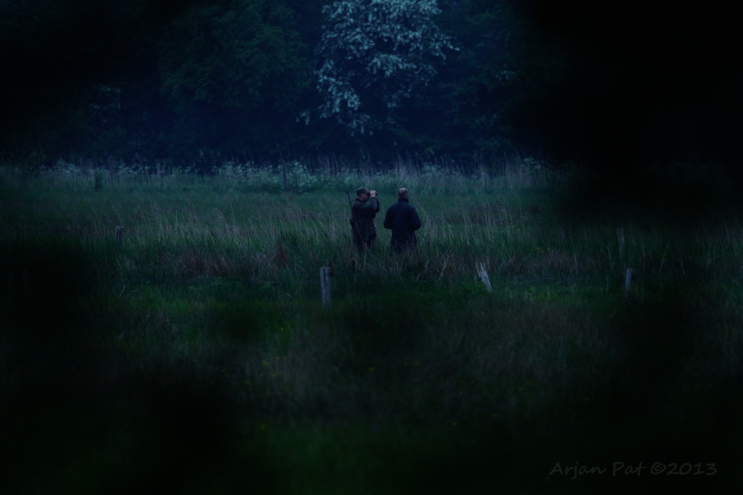 Ik was nog wel bang, dat we de reeën verderop zouden tegenkomen en dat we ze alsnog richting de jagers zouden opjagen. Toen we het erover hadden en ik zei, dat ze waarschijnlijk hier dicht in de buurt zaten, renden de reeën weg. Ze zaten achter een boom, op zo'n 8-10 meter van ons vandaan. Ze renden gelukkig niet richting de jager, maar het weiland over. De jagers echter, hadden ze ook gezien en zijn erachteraan gegaan. We hebben geen schoten gehoord, dus hopelijk hebben ze deze dag weer overleefd.