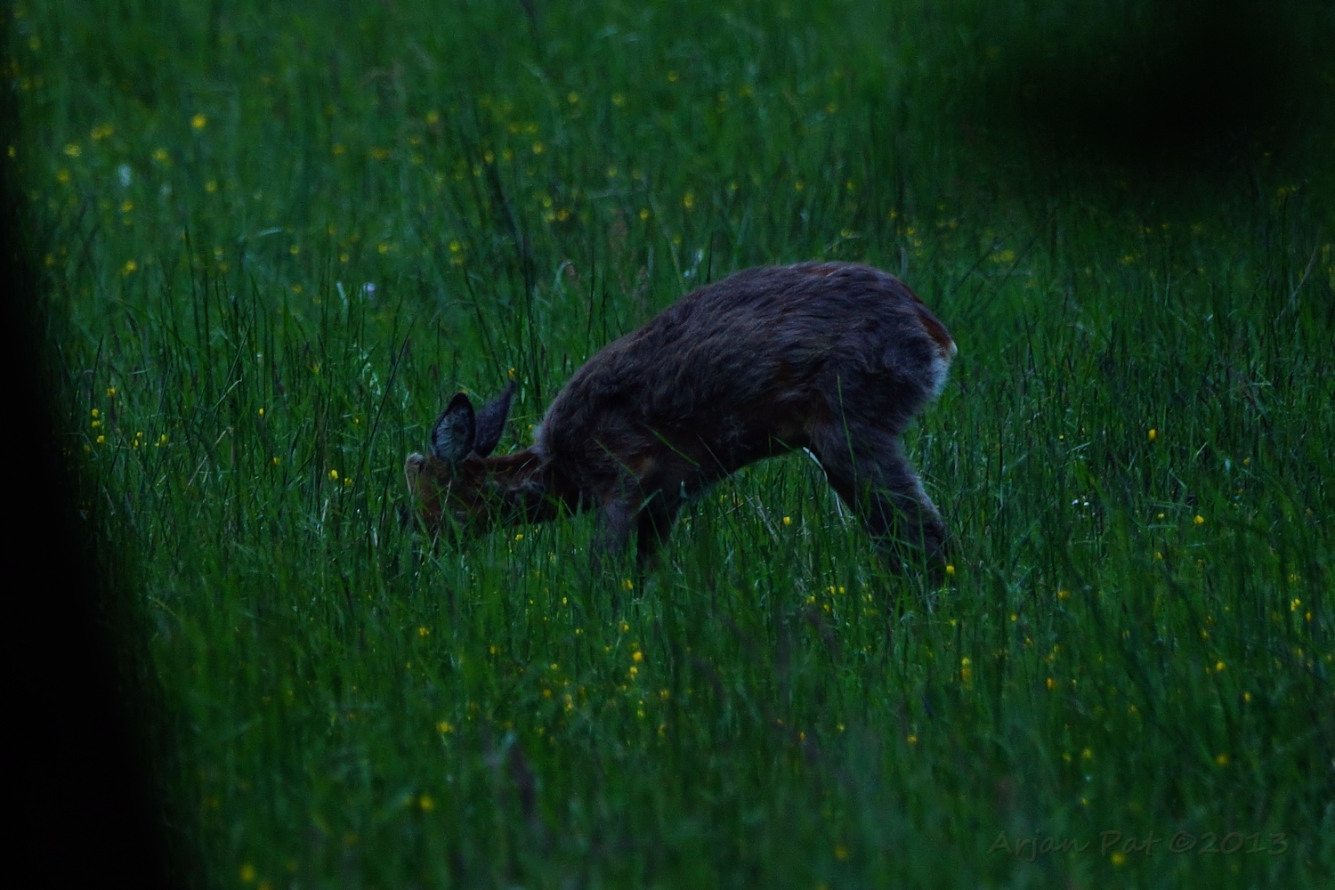 Het begon steeds donkerder te worden. We waren op de terugweg en zagen weer een ree grazen. We konden redelijk dichtbij komen (15-20 meter?)