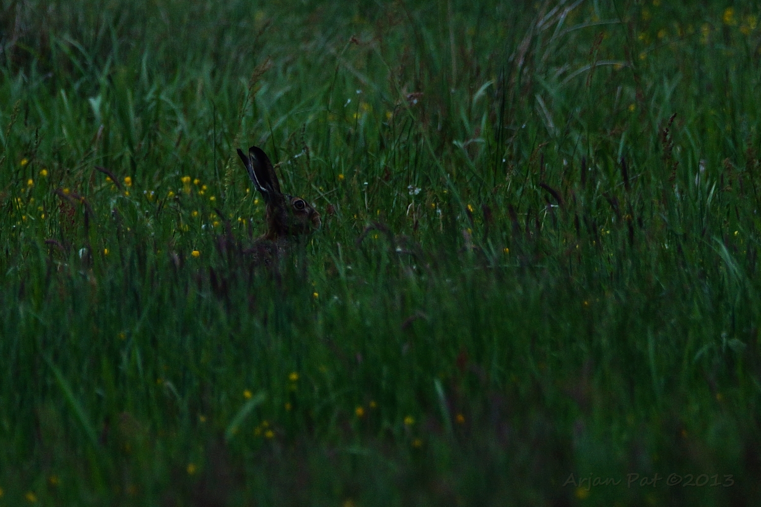 Een paar oren boven het (maai)veld. We dachten even aan de oren van een reekalfje, maar het bleken de oren van een haas te zijn.