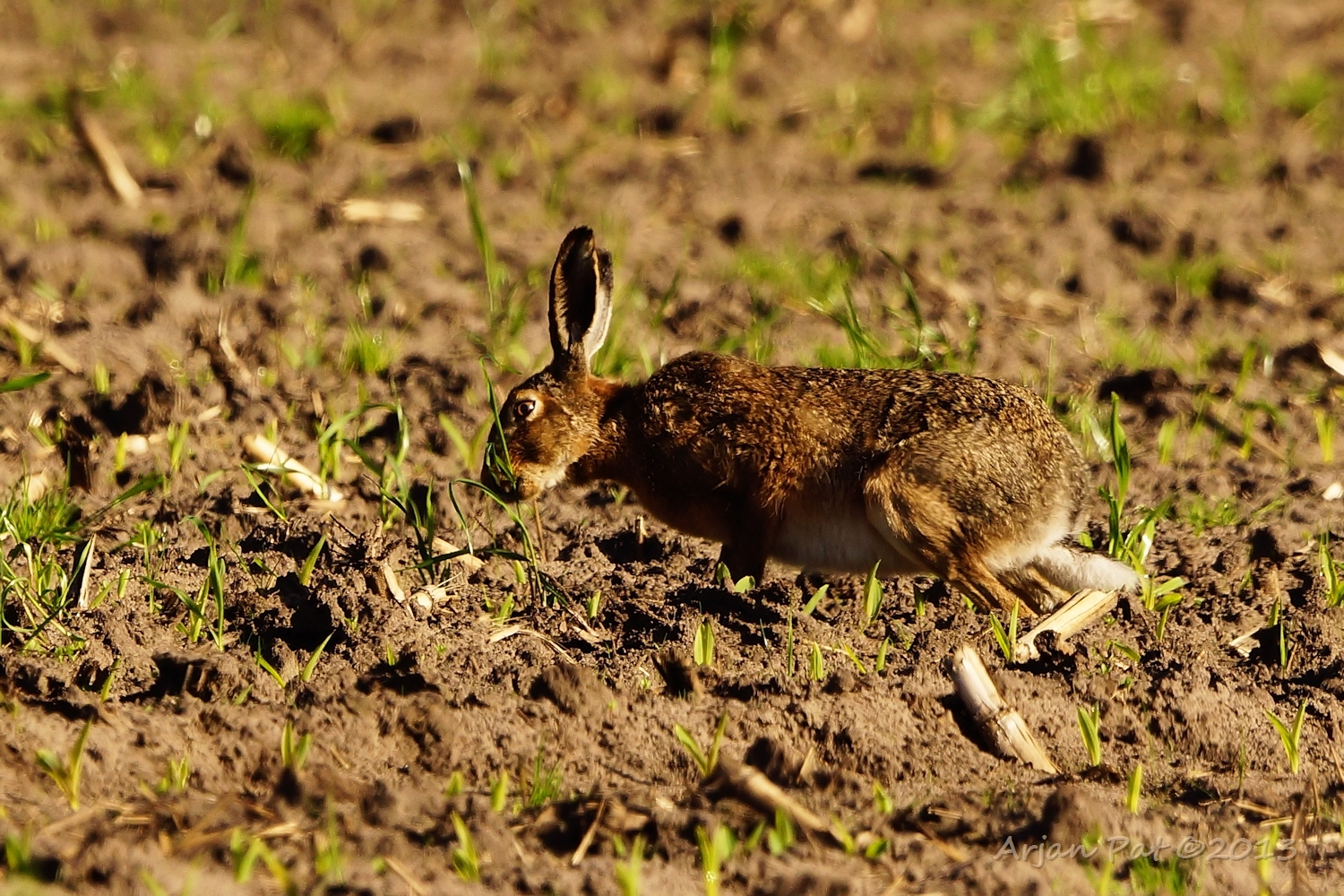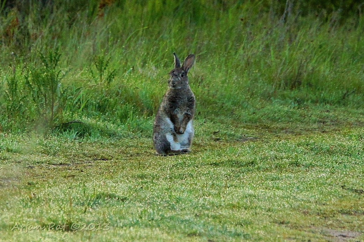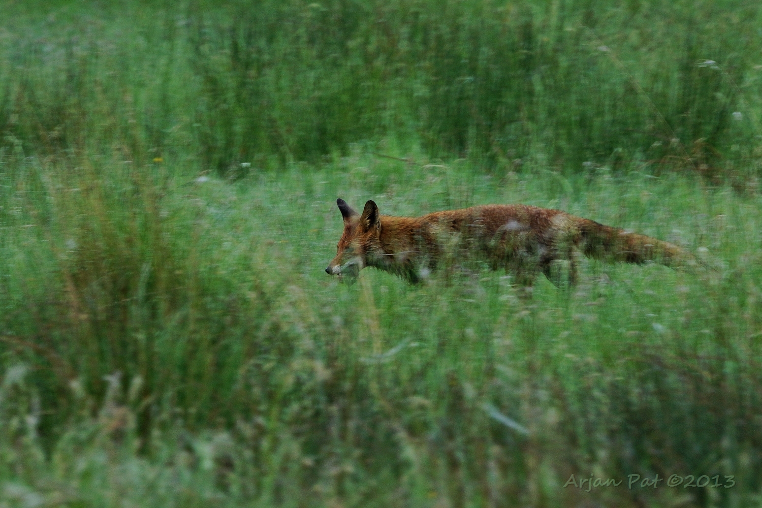 Hij is helemaal nat van de dauw en hij heeft geen vogel, maar een grote mol gevangen. (Toch nuttige beesten die vossen ;-)