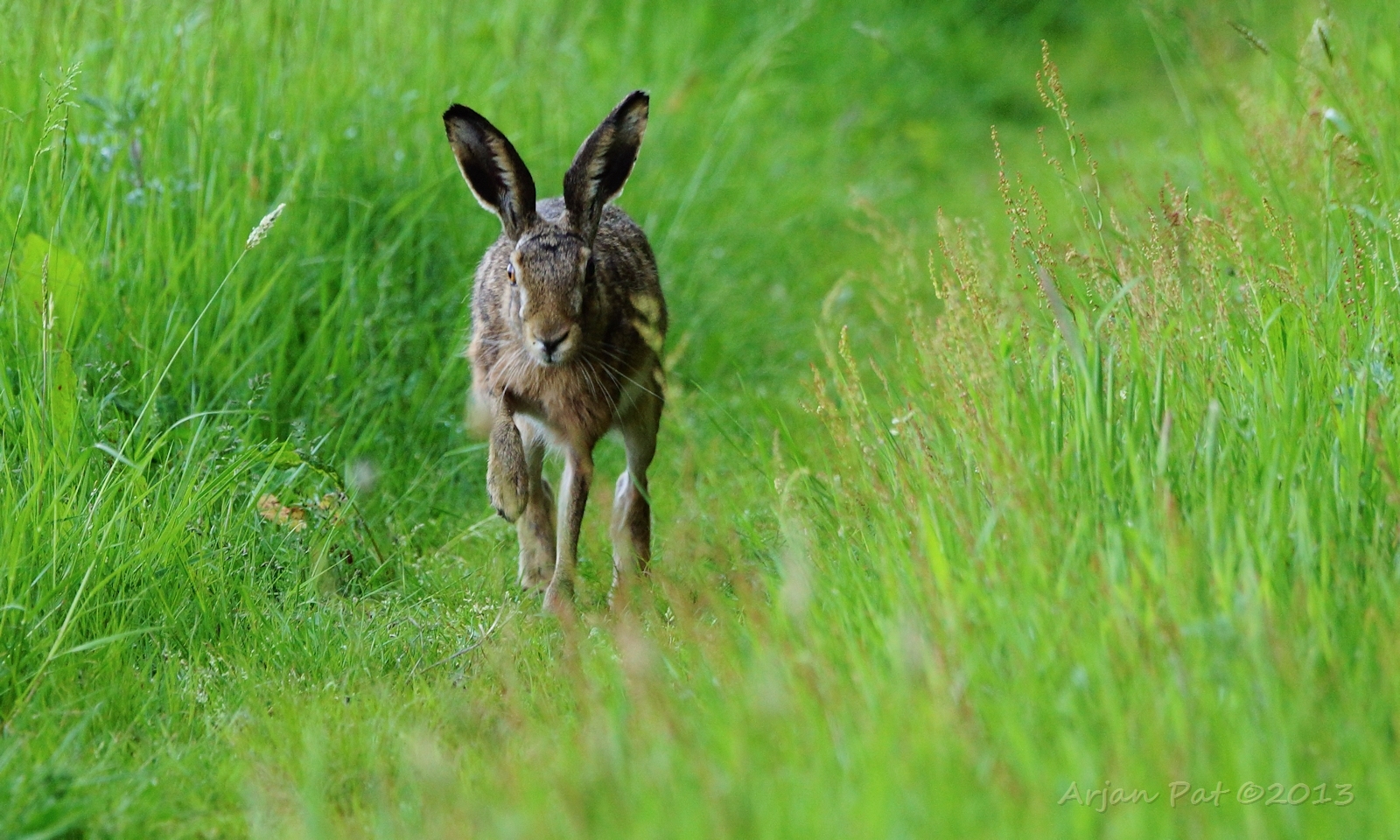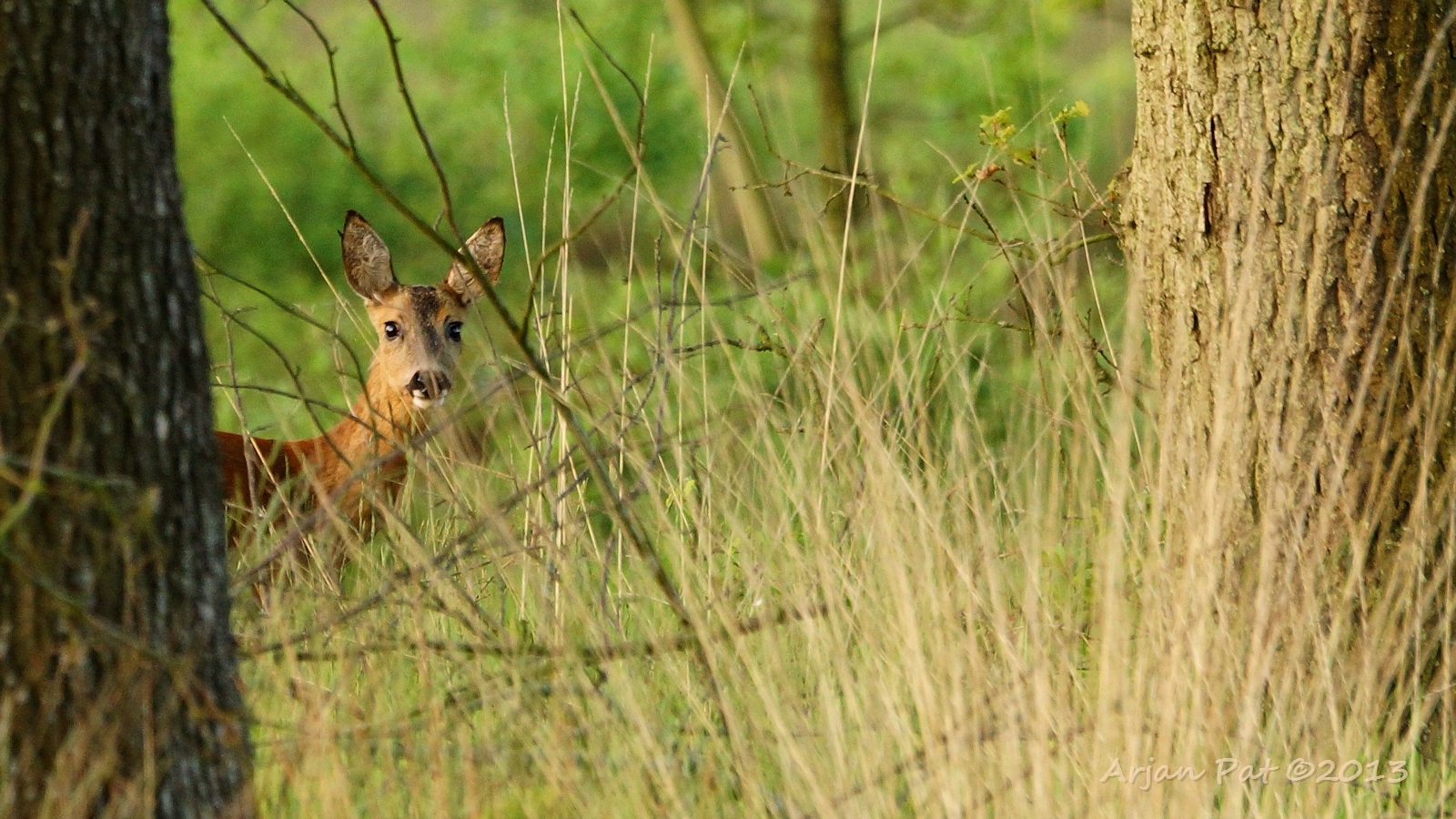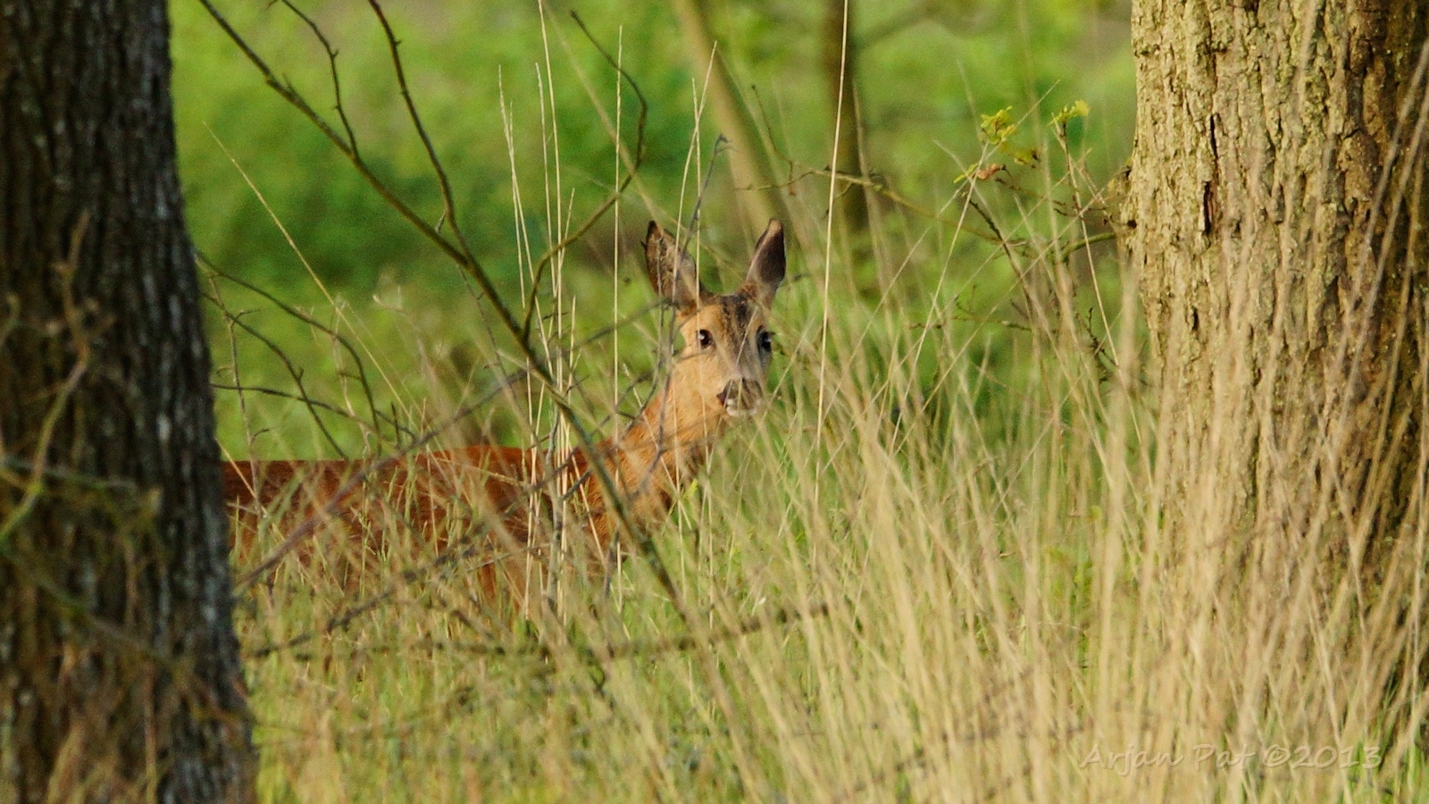 Nu heeft moeder me gezien en is bezig zich uit de benen te maken. De blik van het reekalfje zegt genoeg, denk ik.