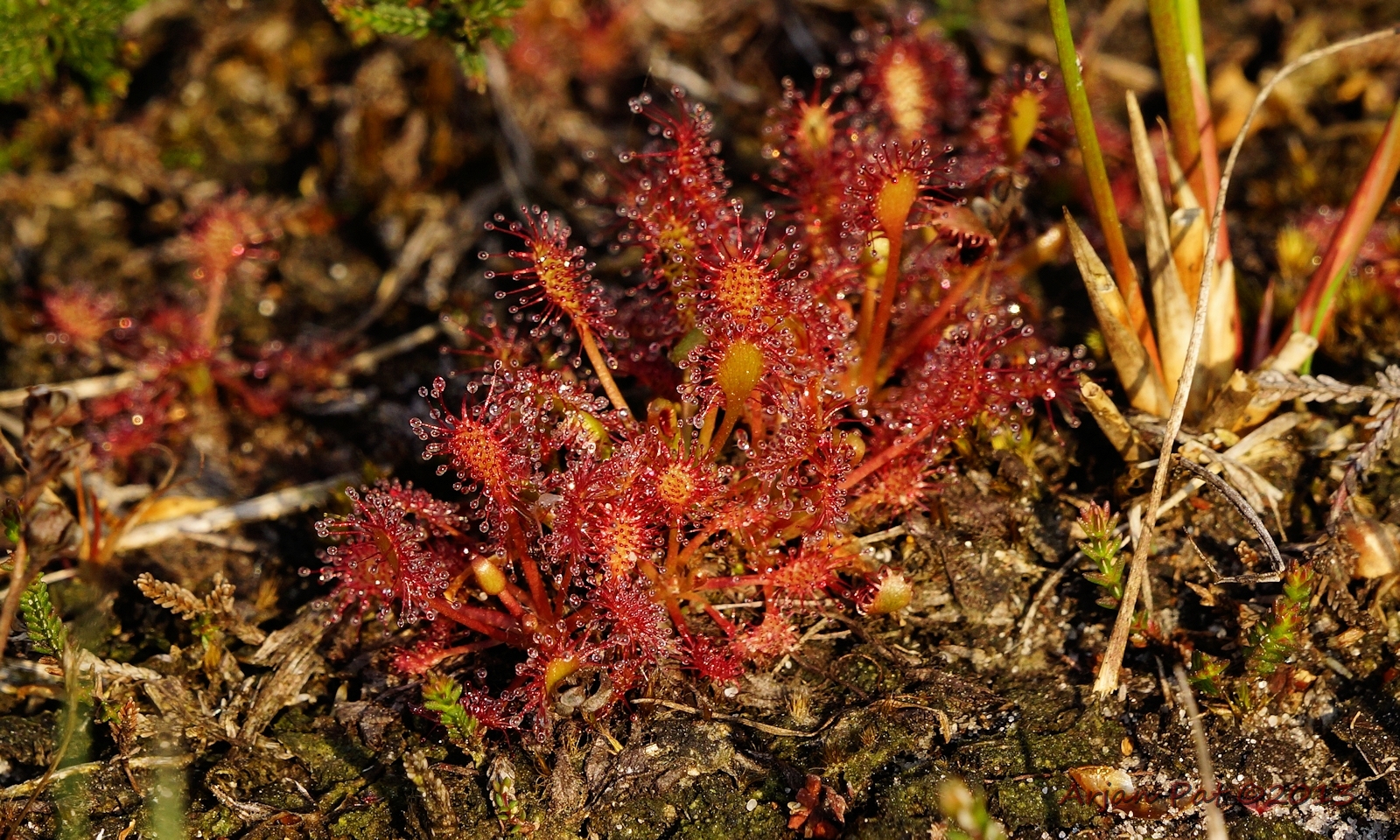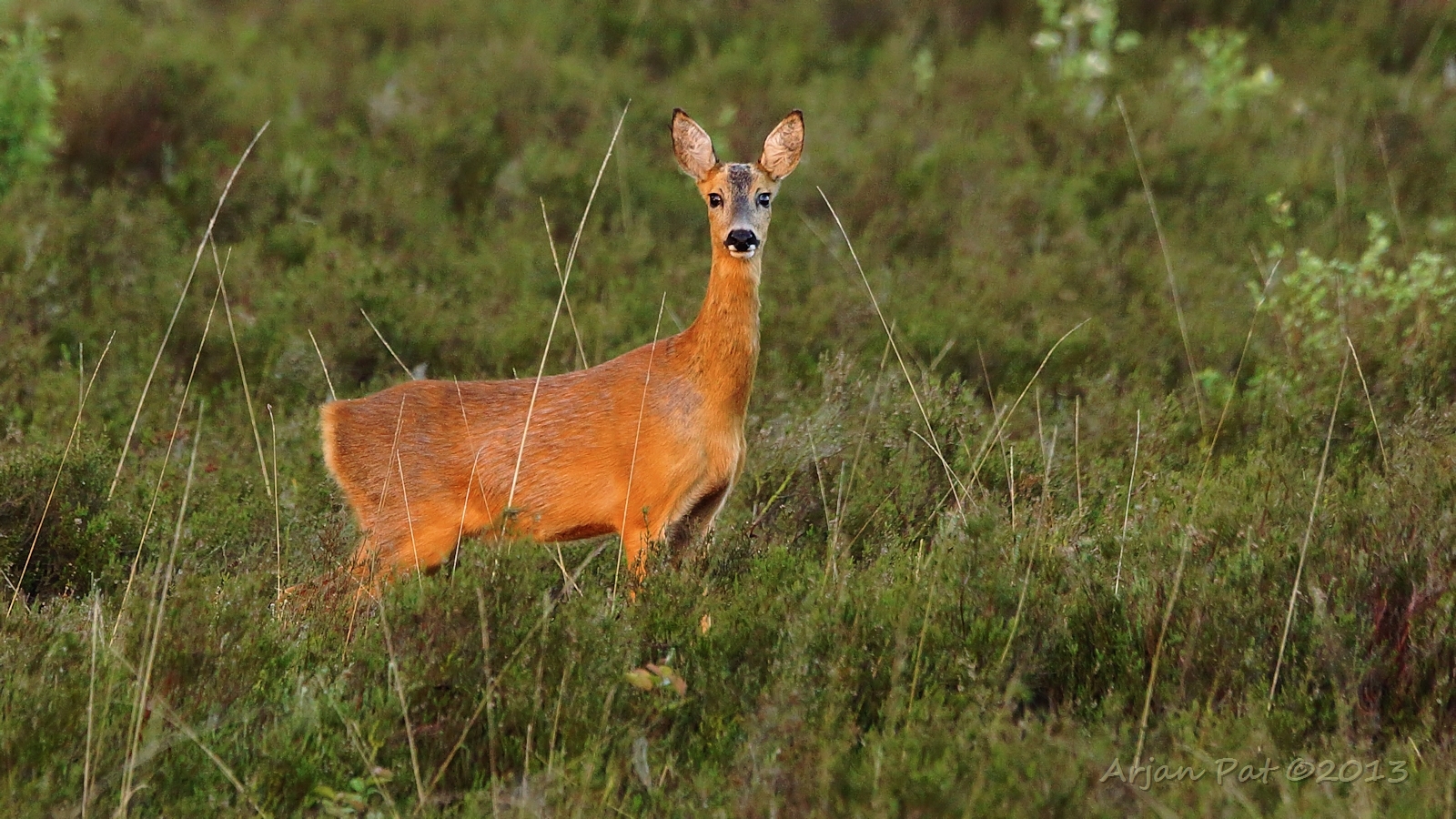 Ze vertrouwde het toch niet helemaal en liep/rende het heideveld op. Na 20-30 meter hield ze in en wou toch weten waar ze voor op de vlucht was. Door de net opgekomen zon kreeg ze een extra mooi kleurtje. Toen het duidelijk voor haar was wat daar liep rende ze snel weer terug. Na een metertje of 100 bleef ze weer even staan en rende daarna de bossen in.