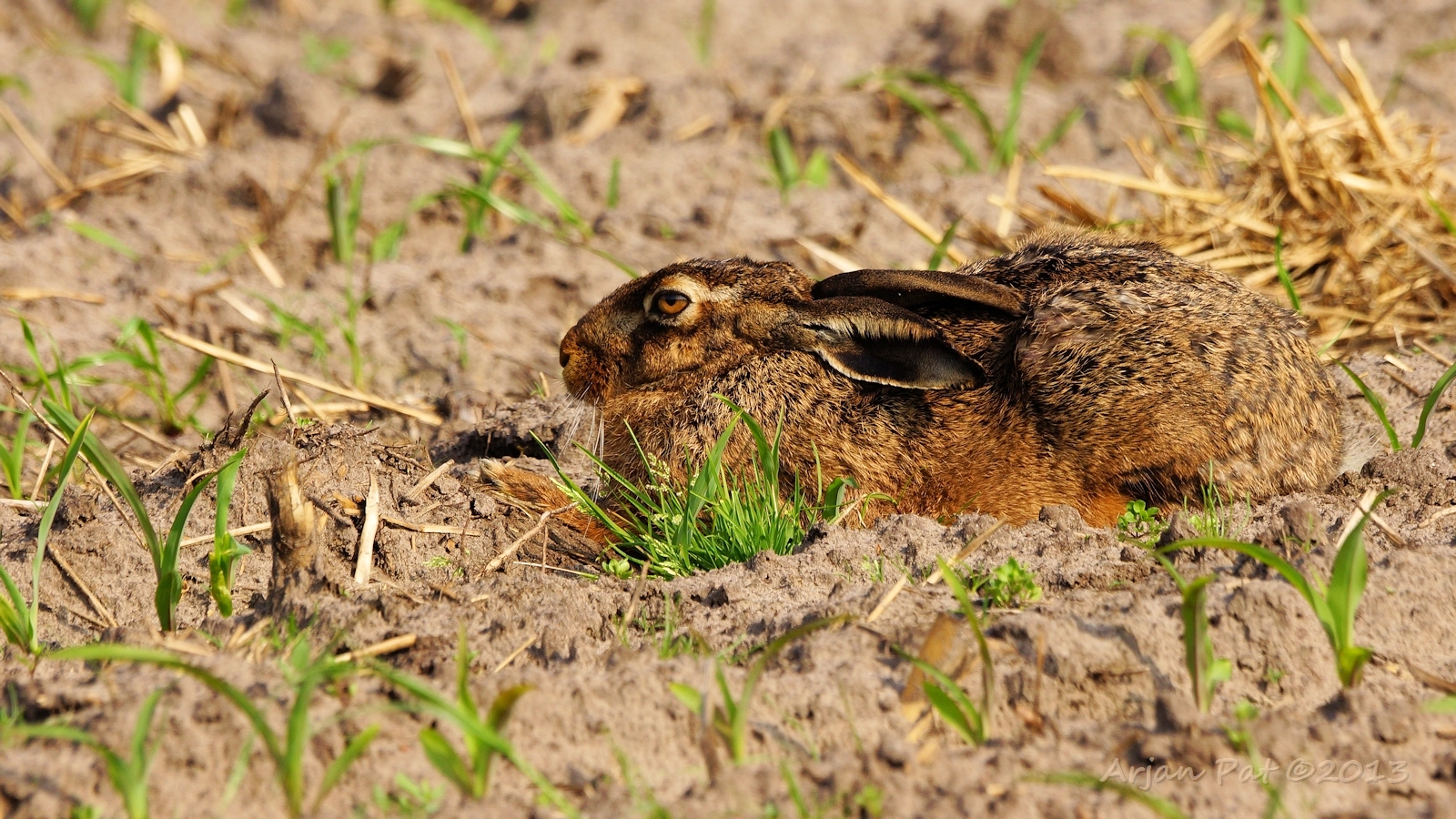 Ik zag in de verte een reegeit oversteken. Even dacht ik ook een reekalfje te zien, maar niet veel later bleek er een haas op de weg te lopen. Ik veranderde mijn planning en liep richting de reegeit. Niet veel later zag ik de haas de bossen in rennen en direct erachteraan een reekalfje terugkomen.