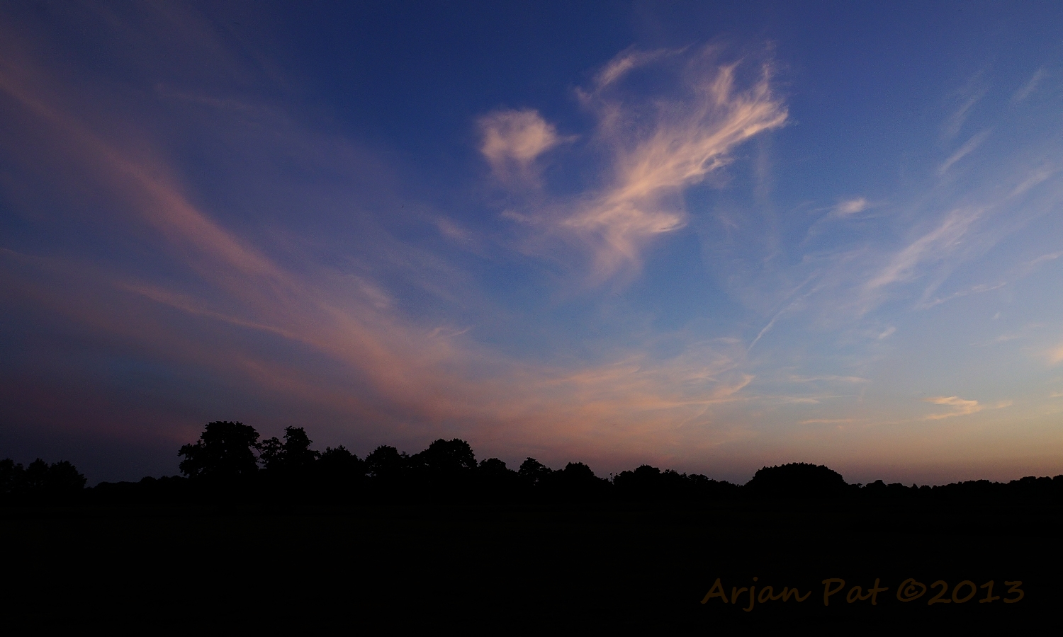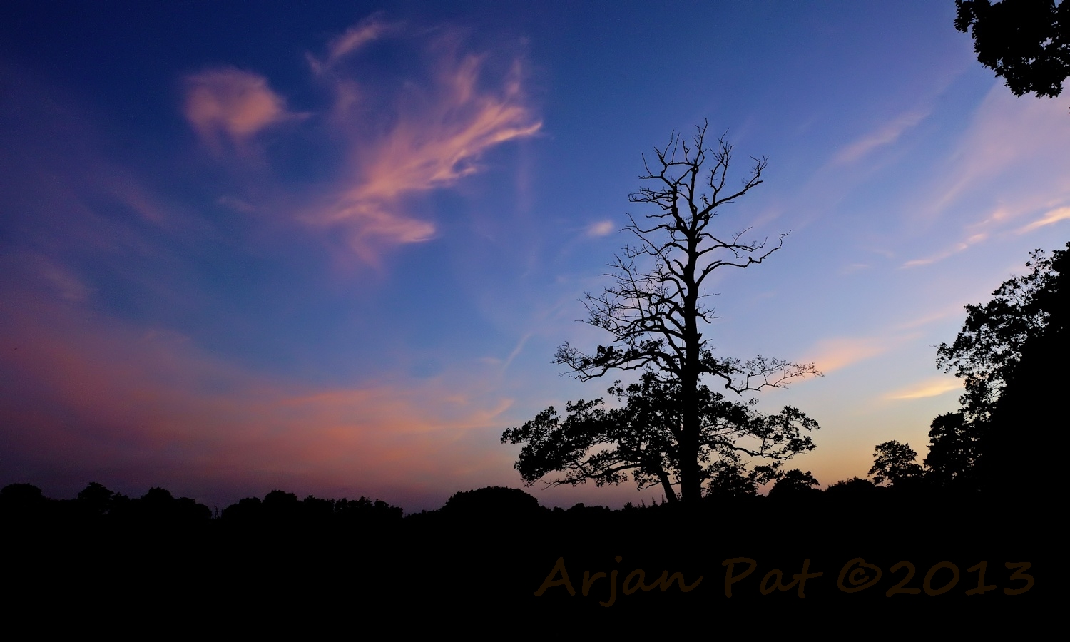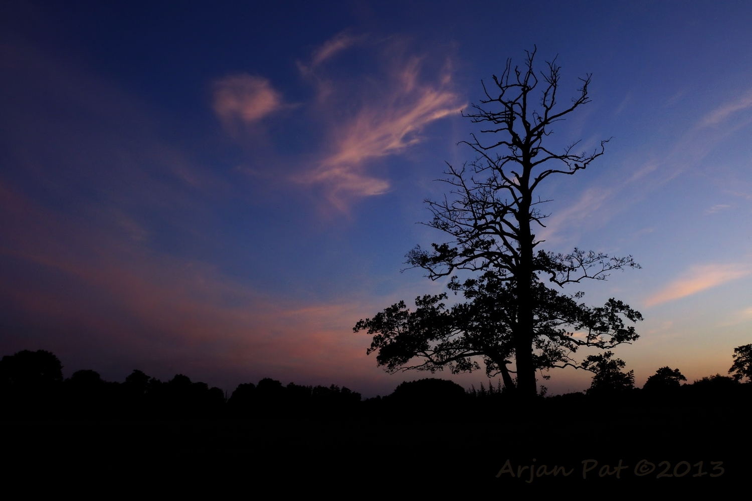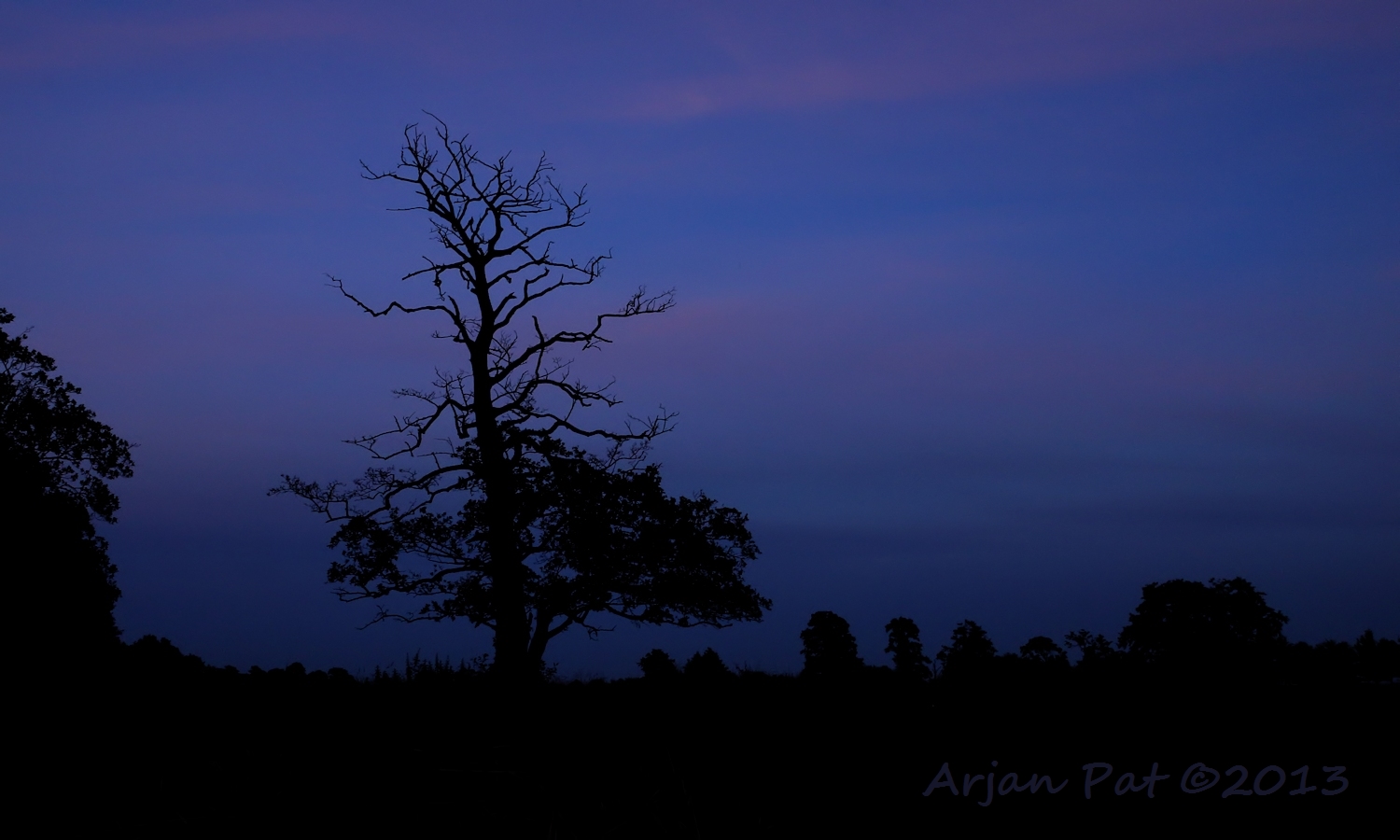 Even later stond ik aan de andere kant van de boom. De zon was nu helemaal weg en liet een donkere lucht achter met een flauw roze gloed in de wolken.