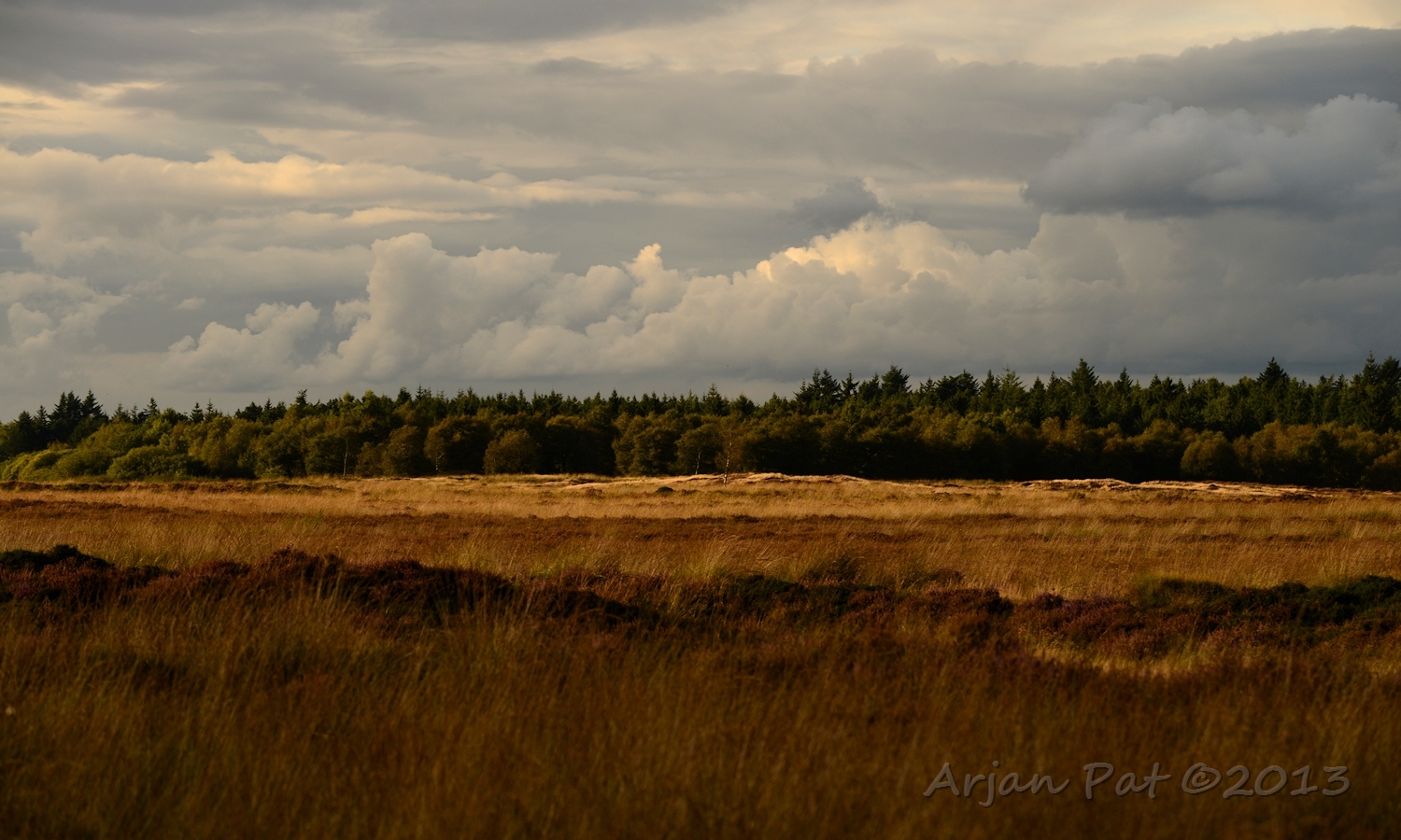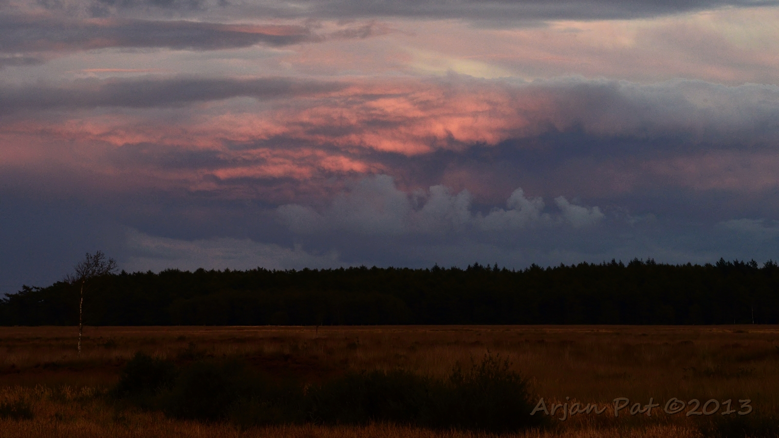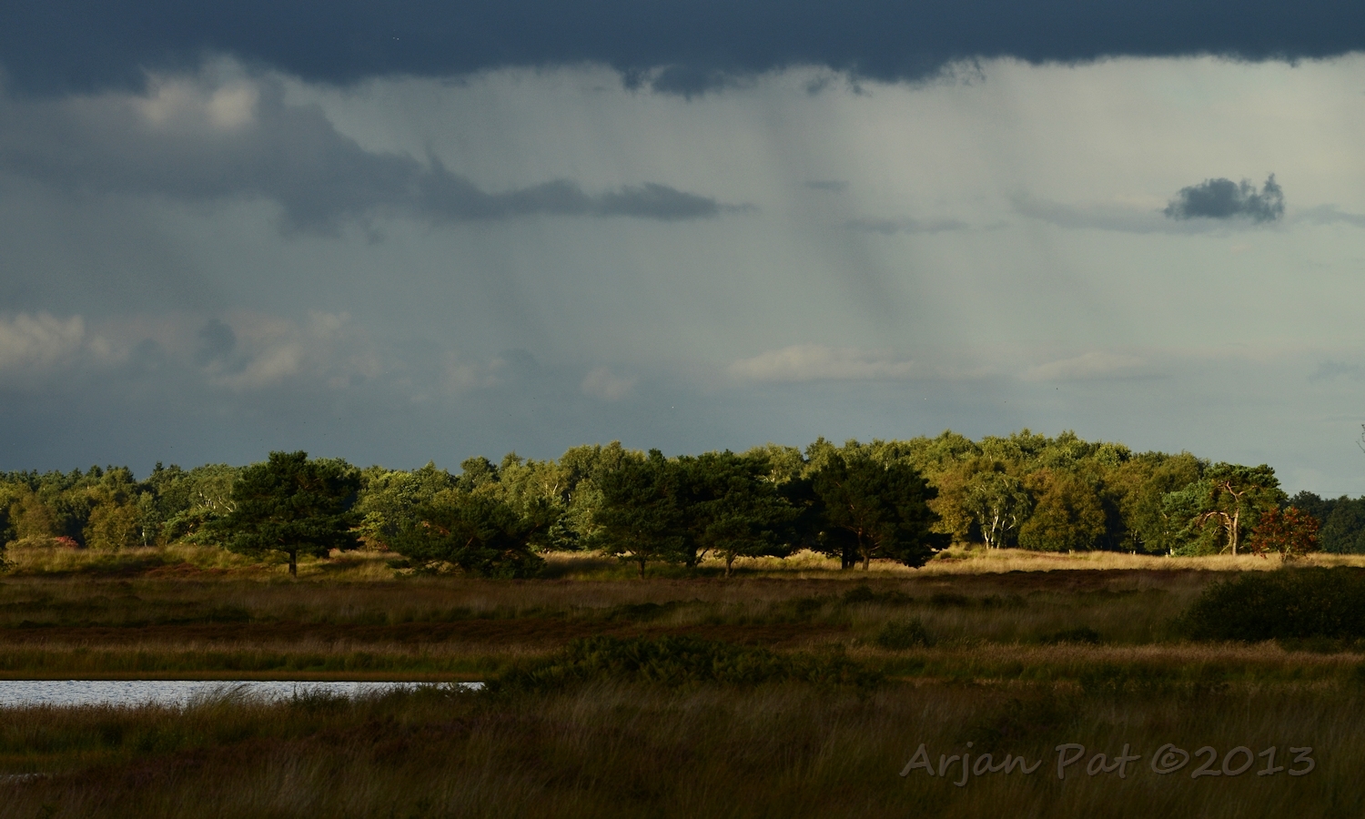 Net voor zonsondergang even een wandelingetje gemaakt over het Hijkerveld. De zon stond al laag en er waren links en rechts van mij dreigende wolkenvelden, waaruit het zichtbaar regende.