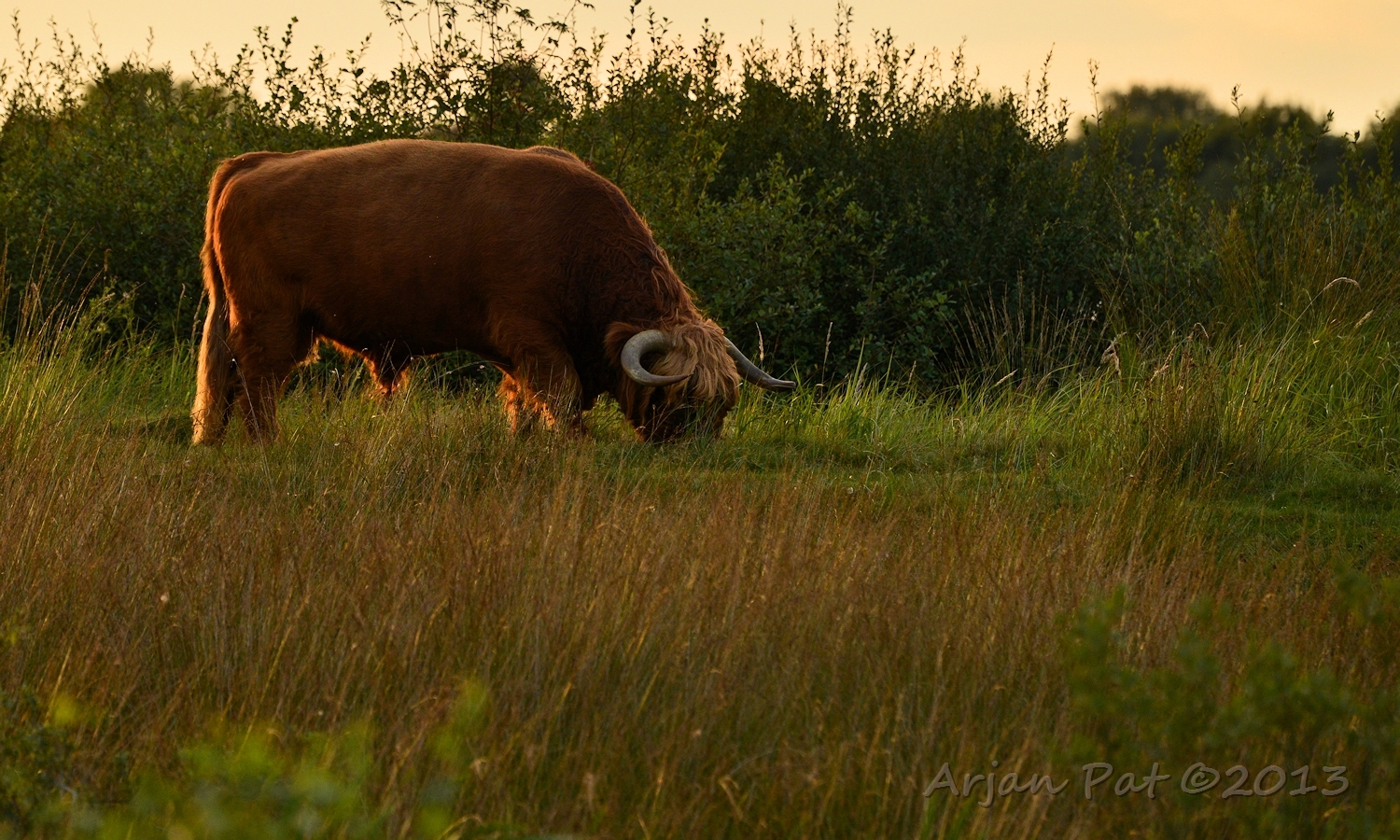 Schotse Hooglander tijdens zonsondergang en op achtergrond dreigende lucht.
