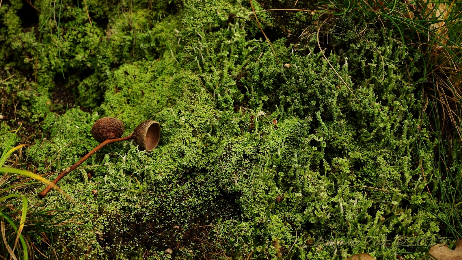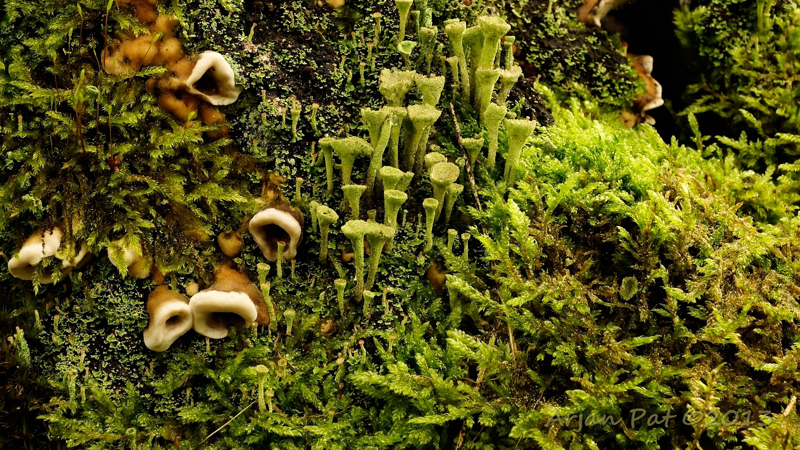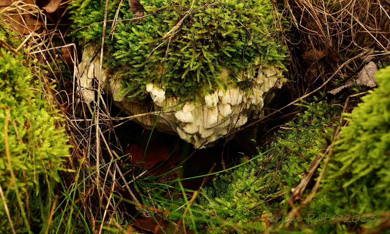 Hoe deze symbiose in elkaar steekt weet ik niet, maar ik vond het wel een apart gezicht. Mijn interpretatie: een (konijnen)hol waar mos op groeit met daaronder een of ander grote paddenstoel?