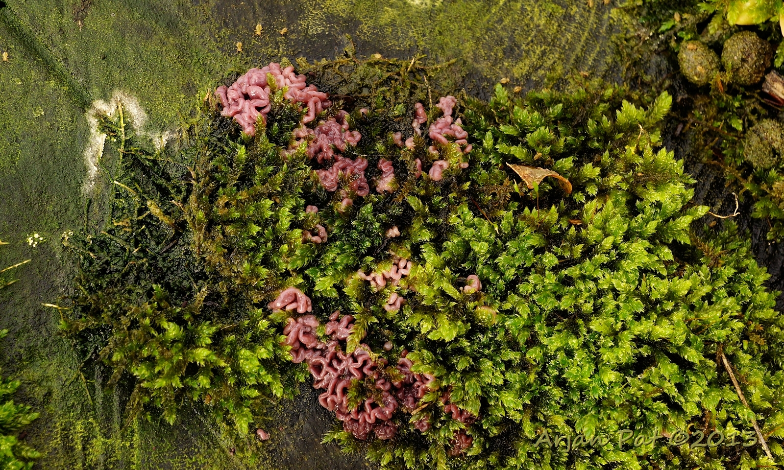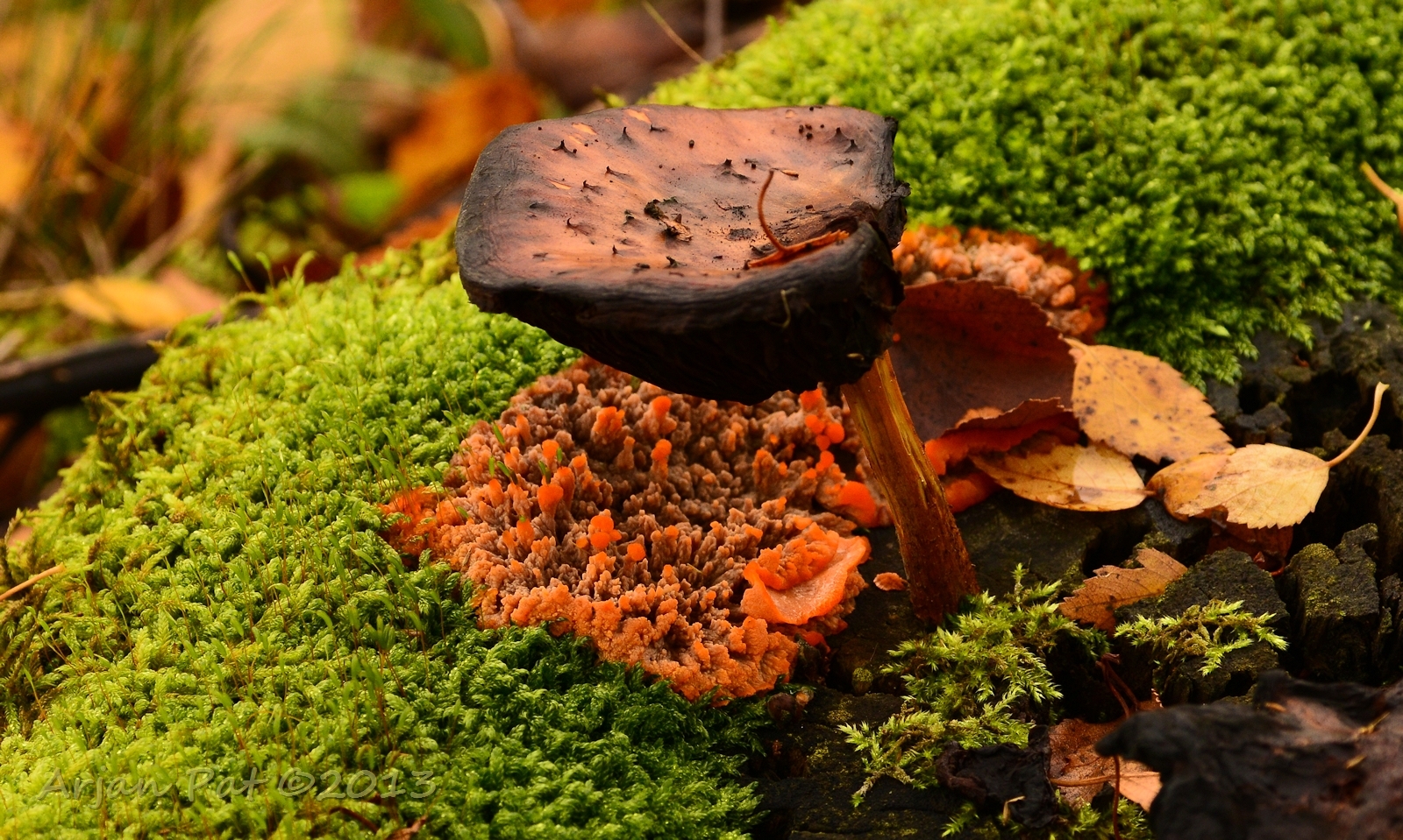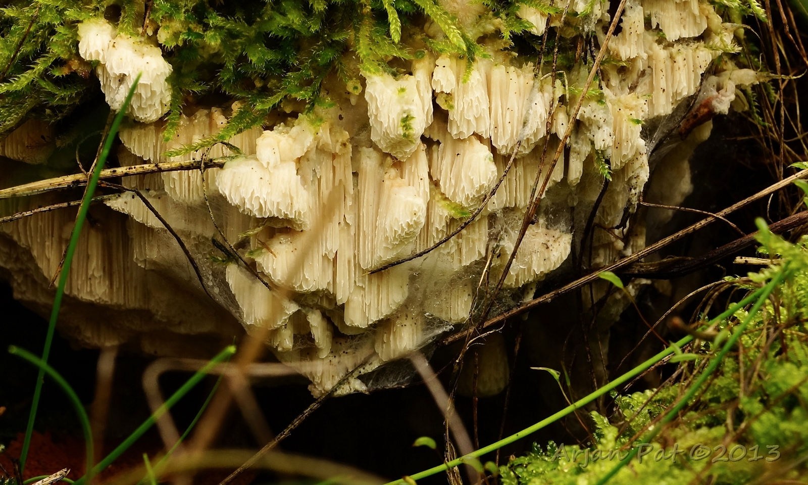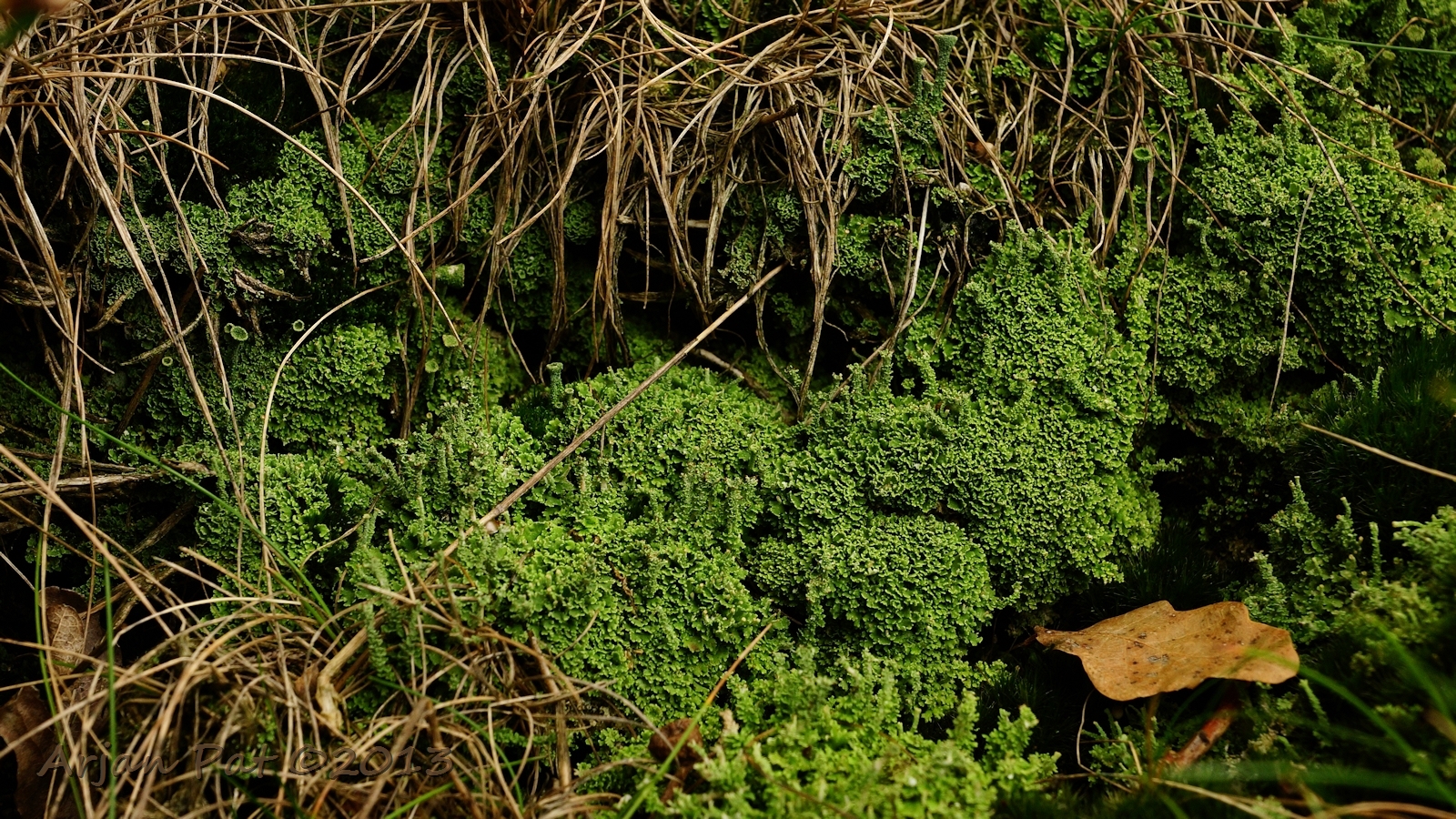 Hoe deze symbiose in elkaar steekt weet ik niet, maar ik vond het wel een apart gezicht. Mijn interpretatie: een (konijnen)hol waar mos op groeit met daaronder een of ander grote paddenstoel?