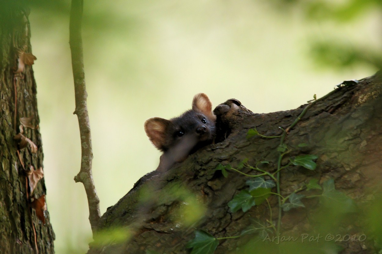 Nadat een 'zwart beest' een aantal keer zijn/haar kop uit de holte stak, wist ik dat het om een stelletje marterachtigen ging. Zeer waarschijnlijk waren het 2 of misschien zelfs meerdere boommarters, maar of het een nest betrof durf ik niet te zeggen. Ik heb ze daarna niet weer in dezelfde boom teruggezien. Wel in dezelfde buurt, zoals op de volgende foto's te zien is. Gezien de donkere kleur van de neus en de andere foto's kun je eigenlijk wel concluderen dat het hier om een boommarter gaat en niet om een steenmarter.