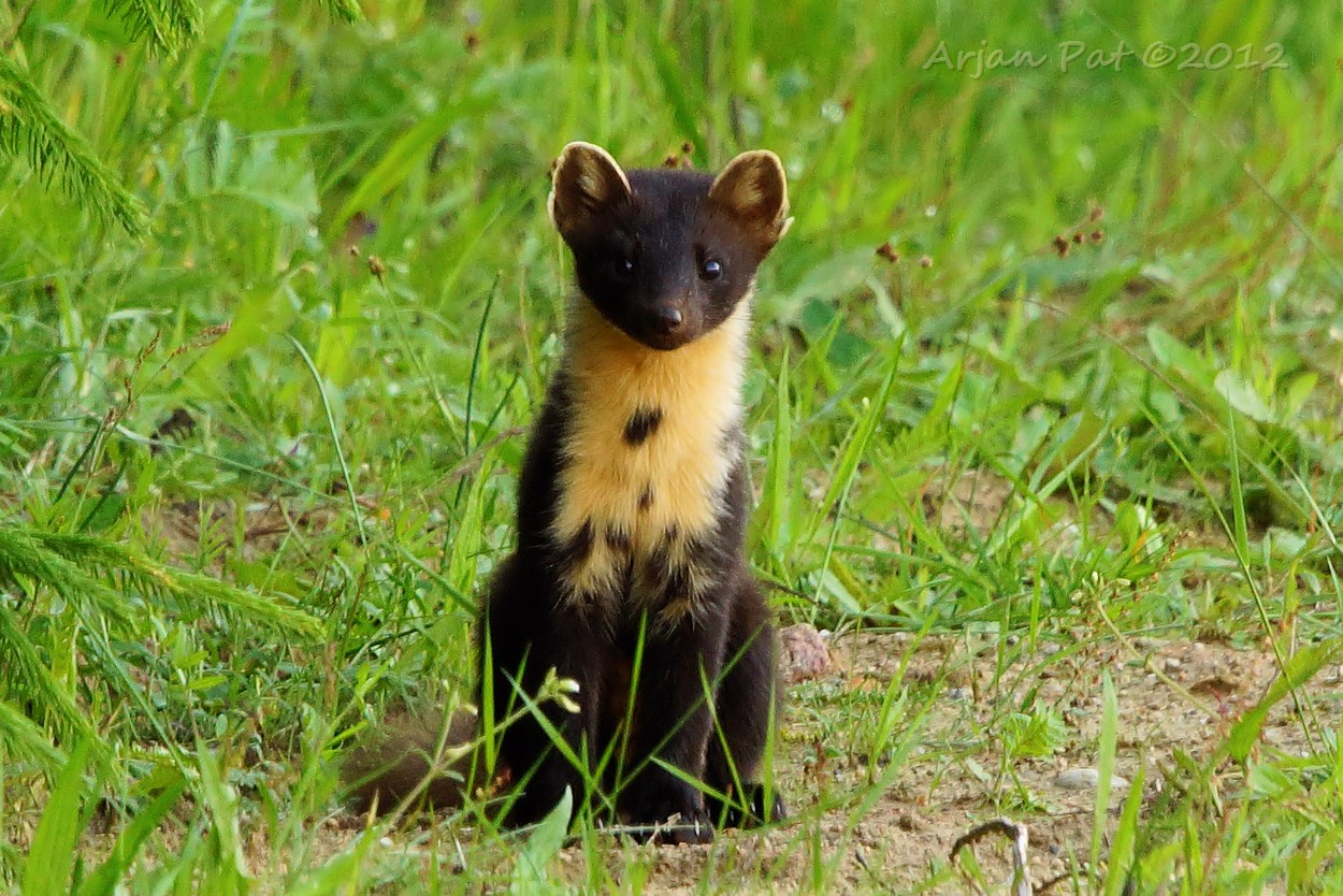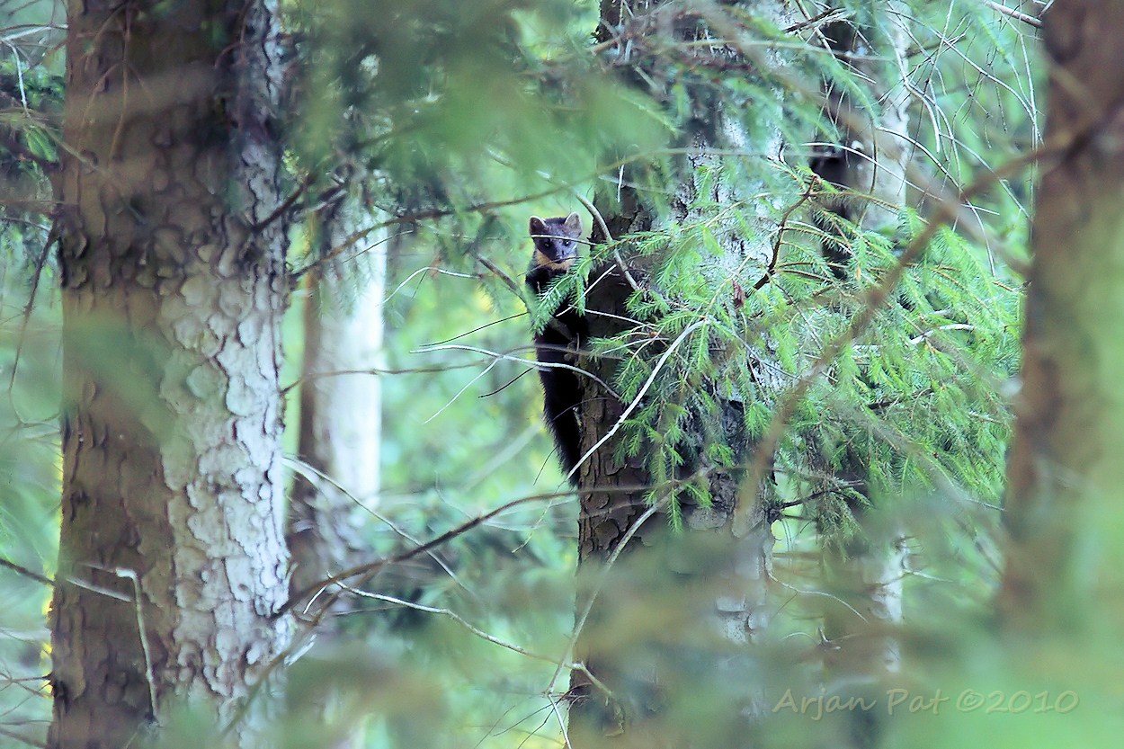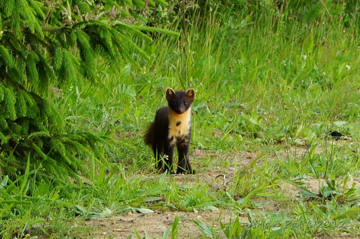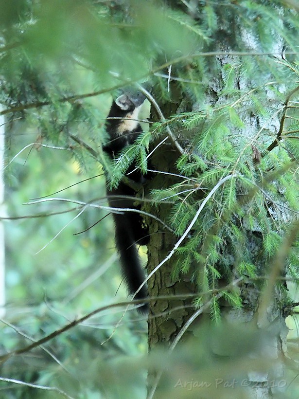 Hier kun je duidelijk zien, dat het om een boommarter en niet om een steenmarter gaat. De kleur van de bef is dan weliswaar niet echt gelig, maar is niet gevorkt en loopt ook niet door tot aan de voorpoten. Op andere foto's is de typische donkere neus beter te zien.