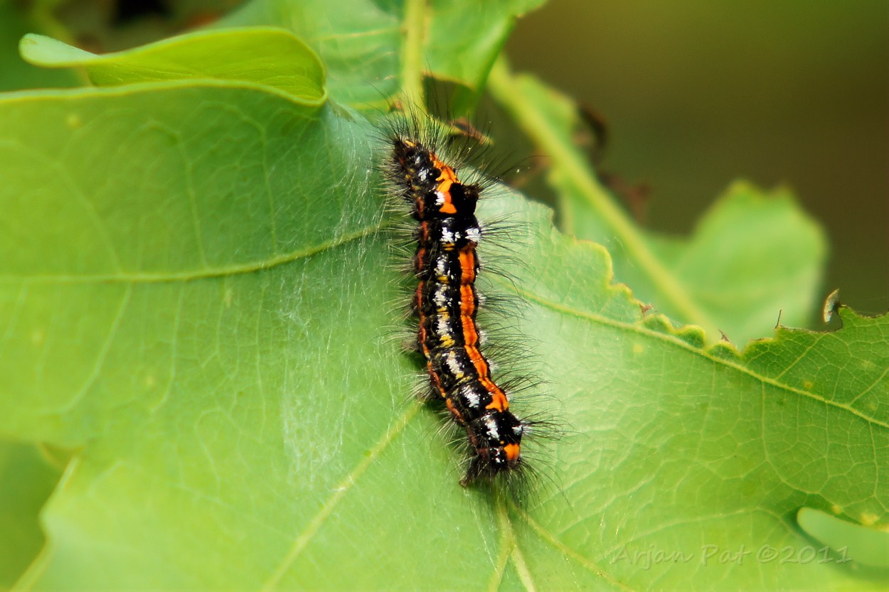 Zwarte rups, met brede oranje strepen en dikke witte stippen.