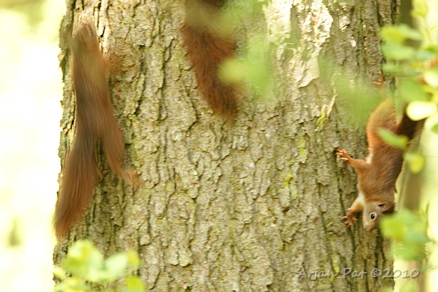 Stelletje spelende eekhoorns. Ze waren minimaal met z'n vieren, ze waren zo snel en renden dwars door elkaar heen, zodat ik ze niet goed kon tellen.
