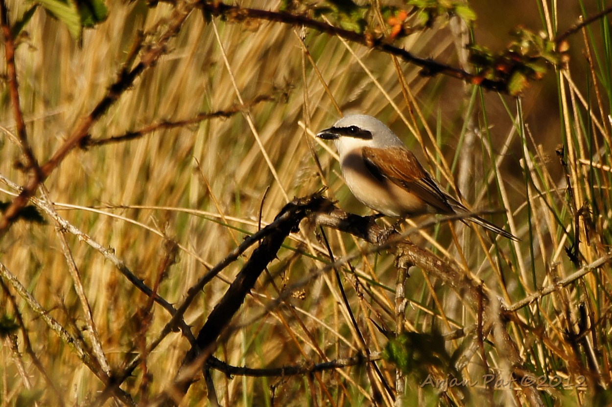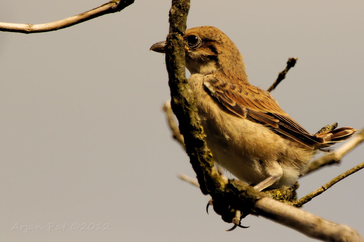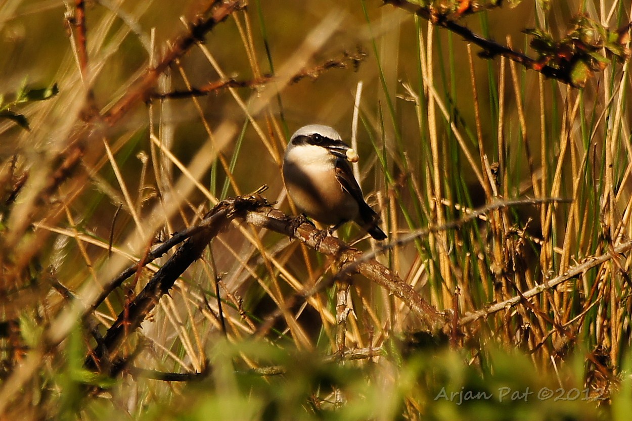 Grauwe klauwier met een sprinkhaan in zijn snavel.