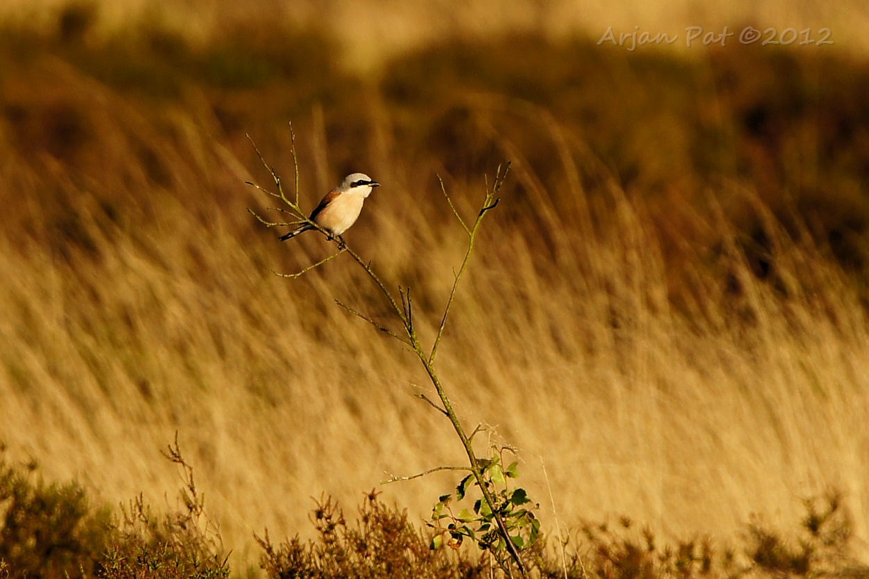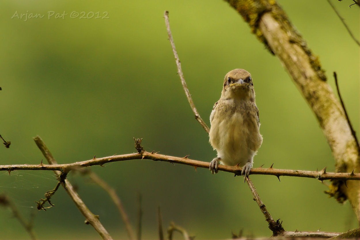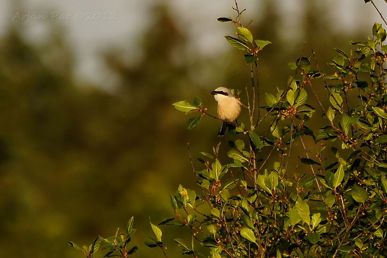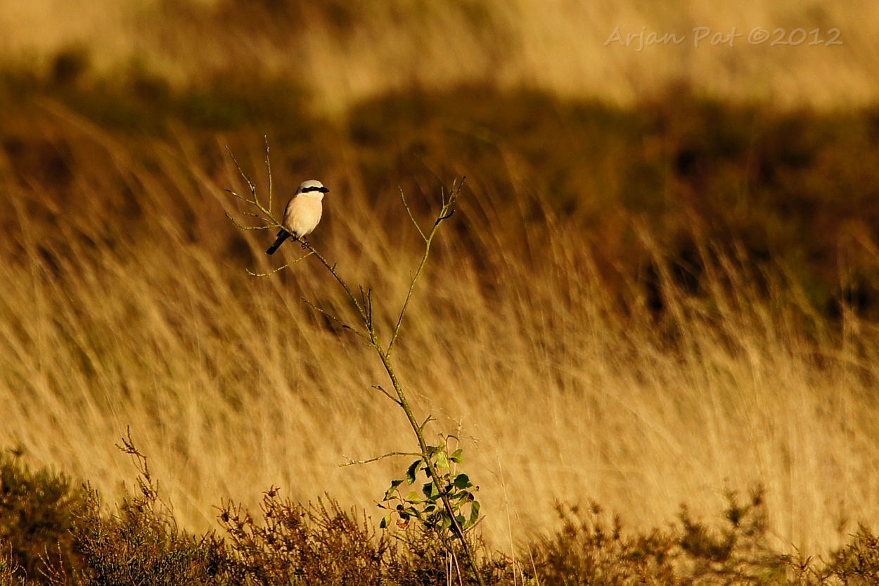 Grauwe klauwier met een sprinkhaan in zijn snavel.