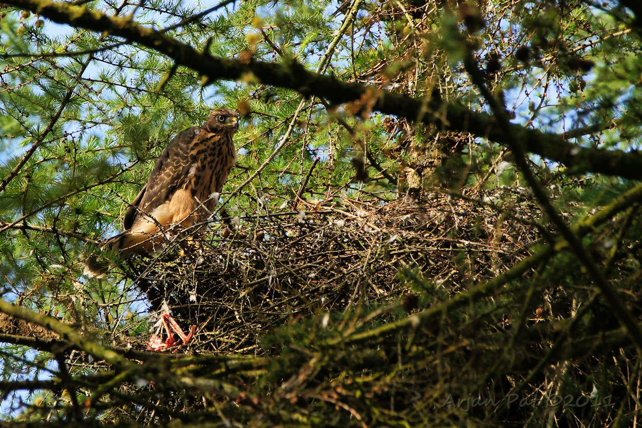 De restanten van een eerdere maaltijd hangen nog aan de rand van het nest.