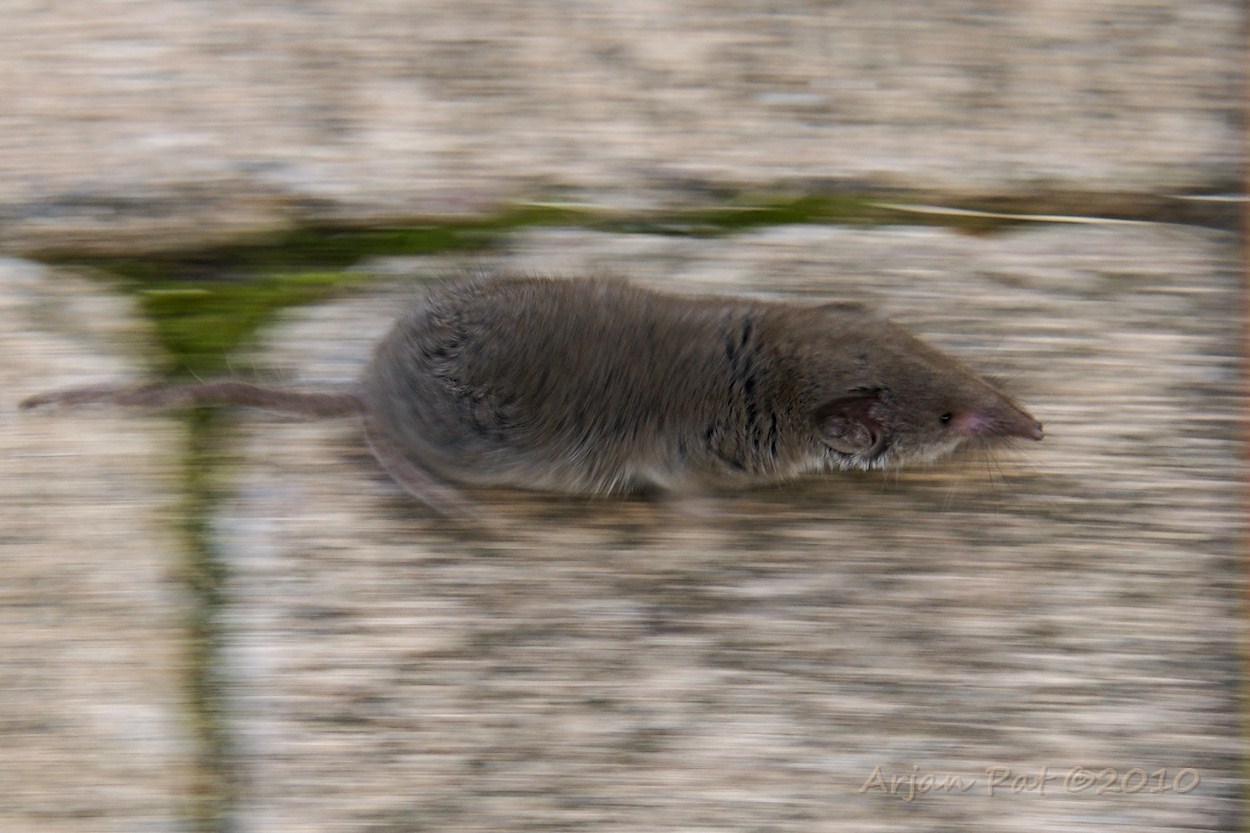 Huisspitsmuis in volle vaart.