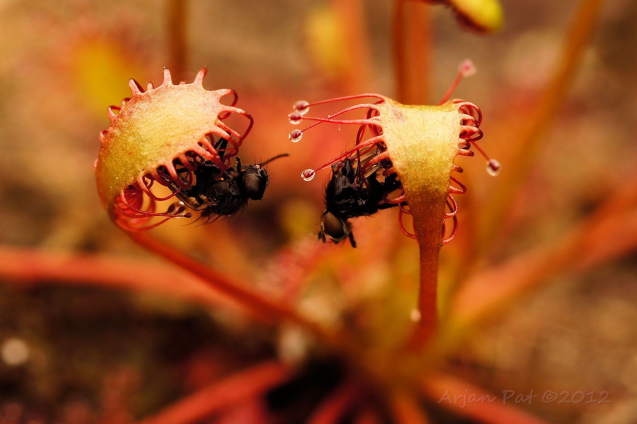 Twee vliegen gevangen (en half verteerd) in de armen van de kleine zonnedauw.
