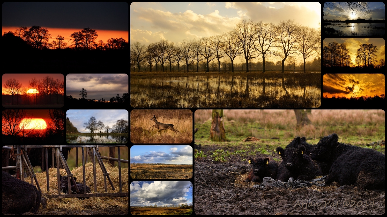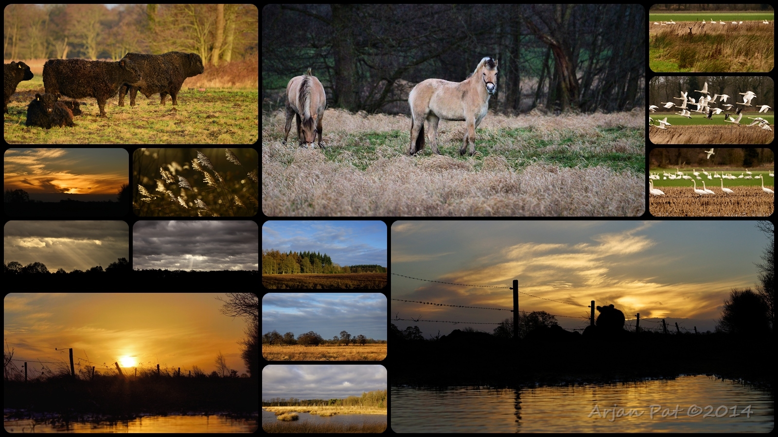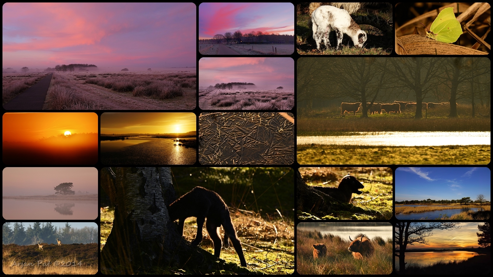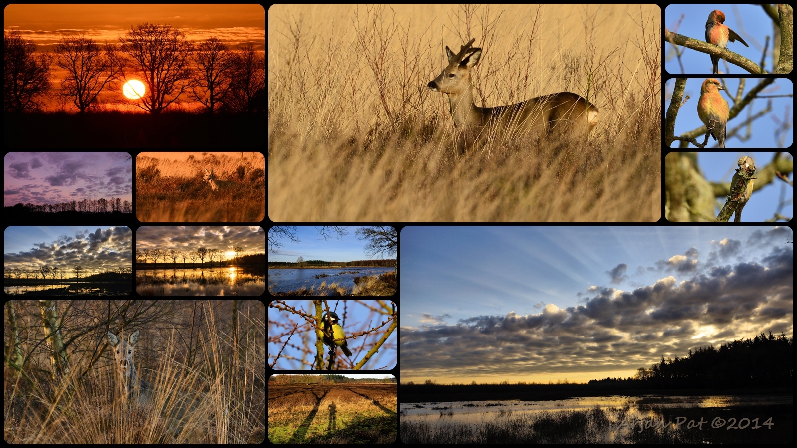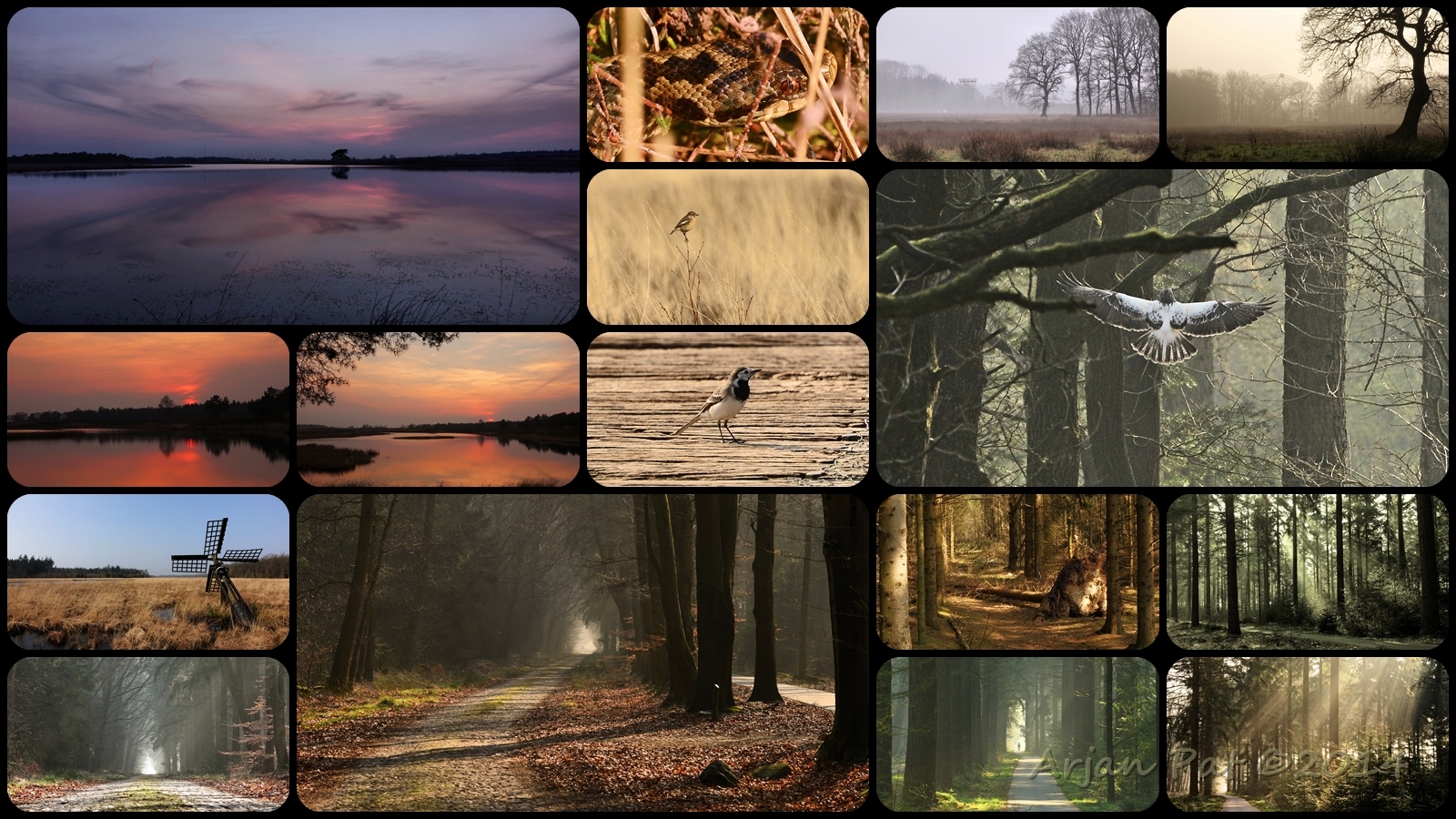 Boswachterij Grolloo met o.a. een witte buizerd, een adder, zonnestralen in het bos, tjalker en zonsondergang.
