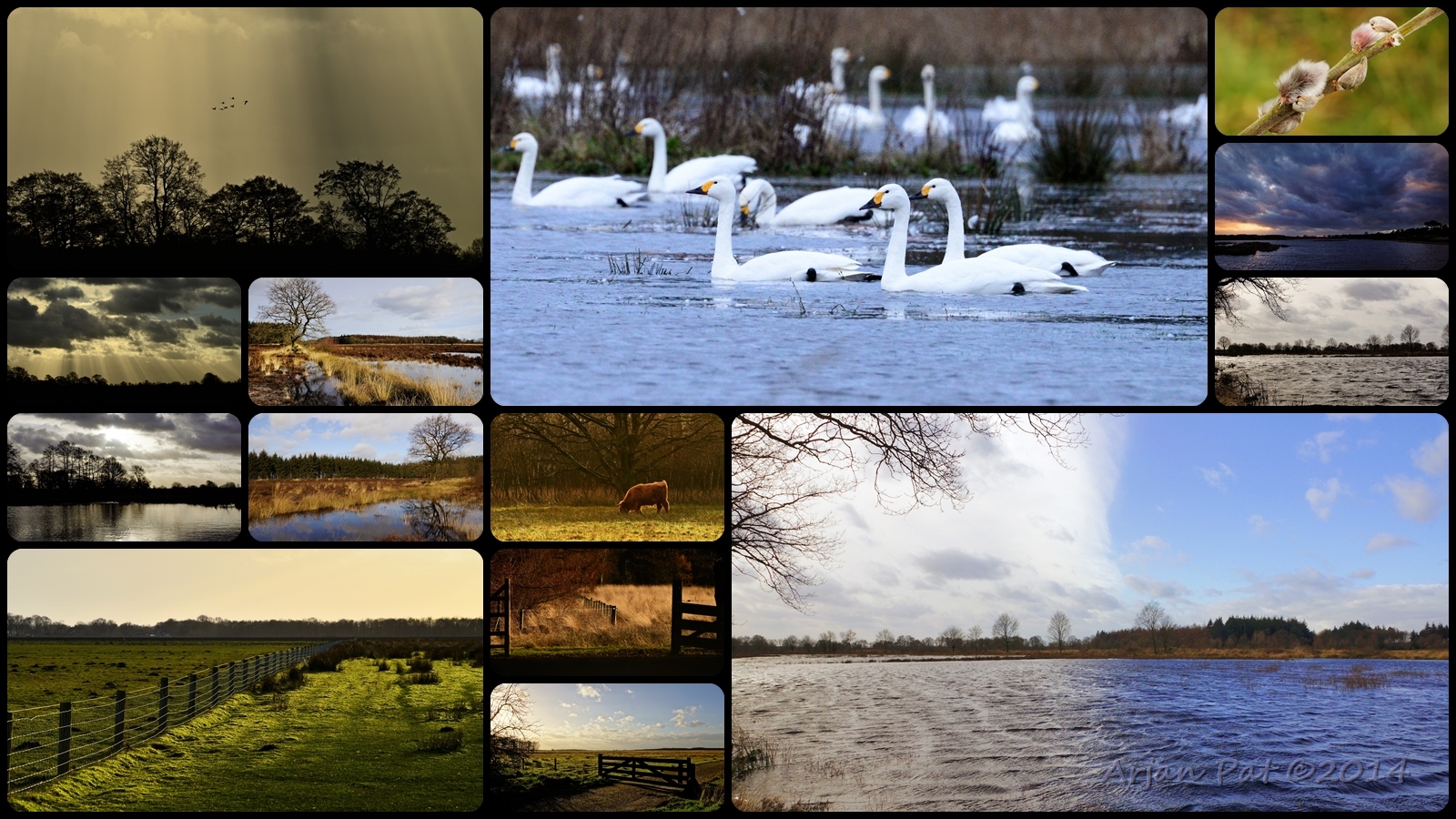 Ochtend- en avondwandeling met o.a. kleine zwanen, boom op heideveld, ree, sneeuwklokjes, storm, scheiding zon en bewolking.