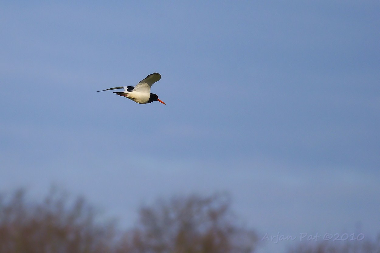 kleur:rug en kop zwart, de buik wit; de snavel oranje rood en lang (ca 7 cm), oranje tot rode poten en rode ogen